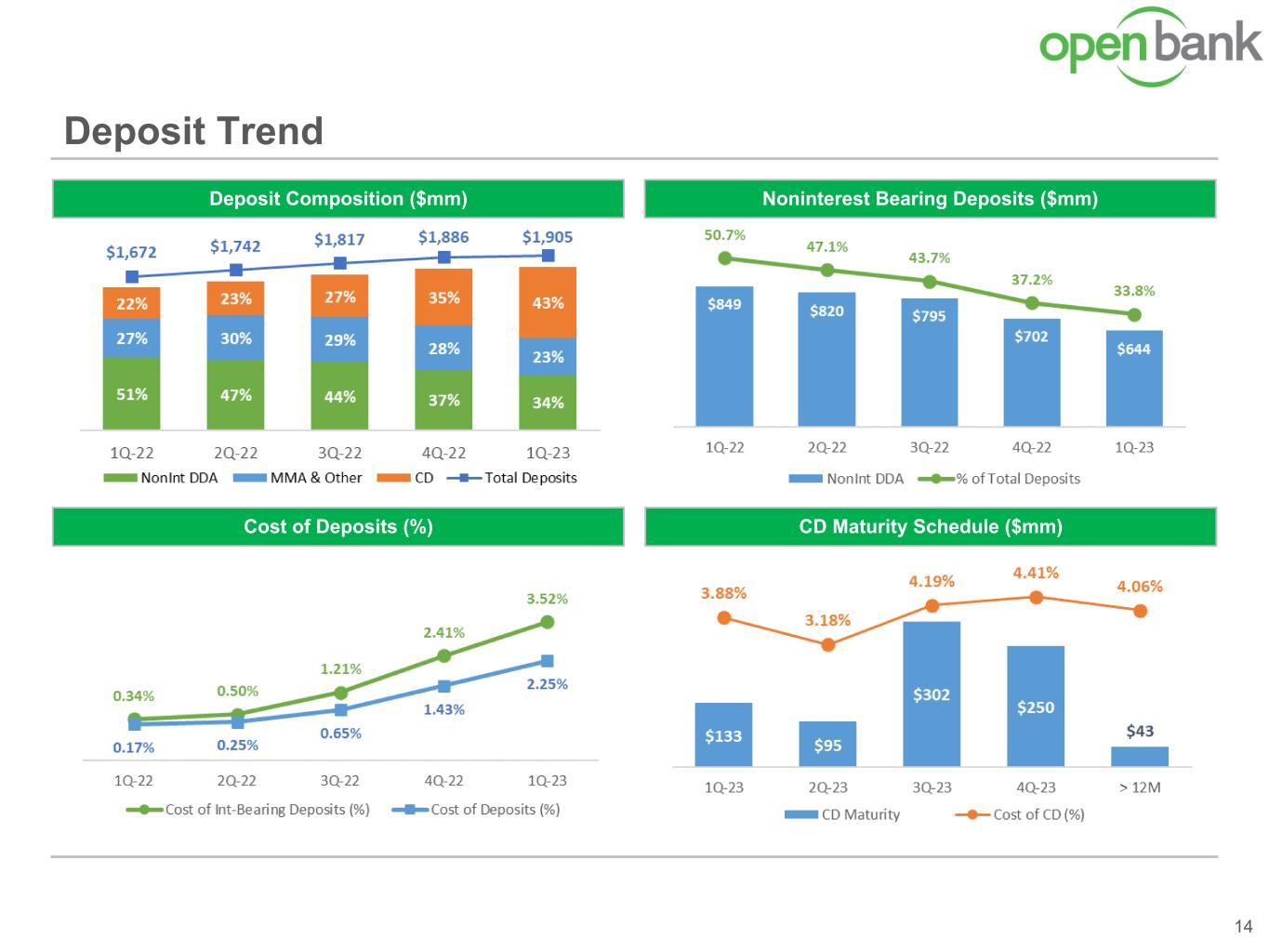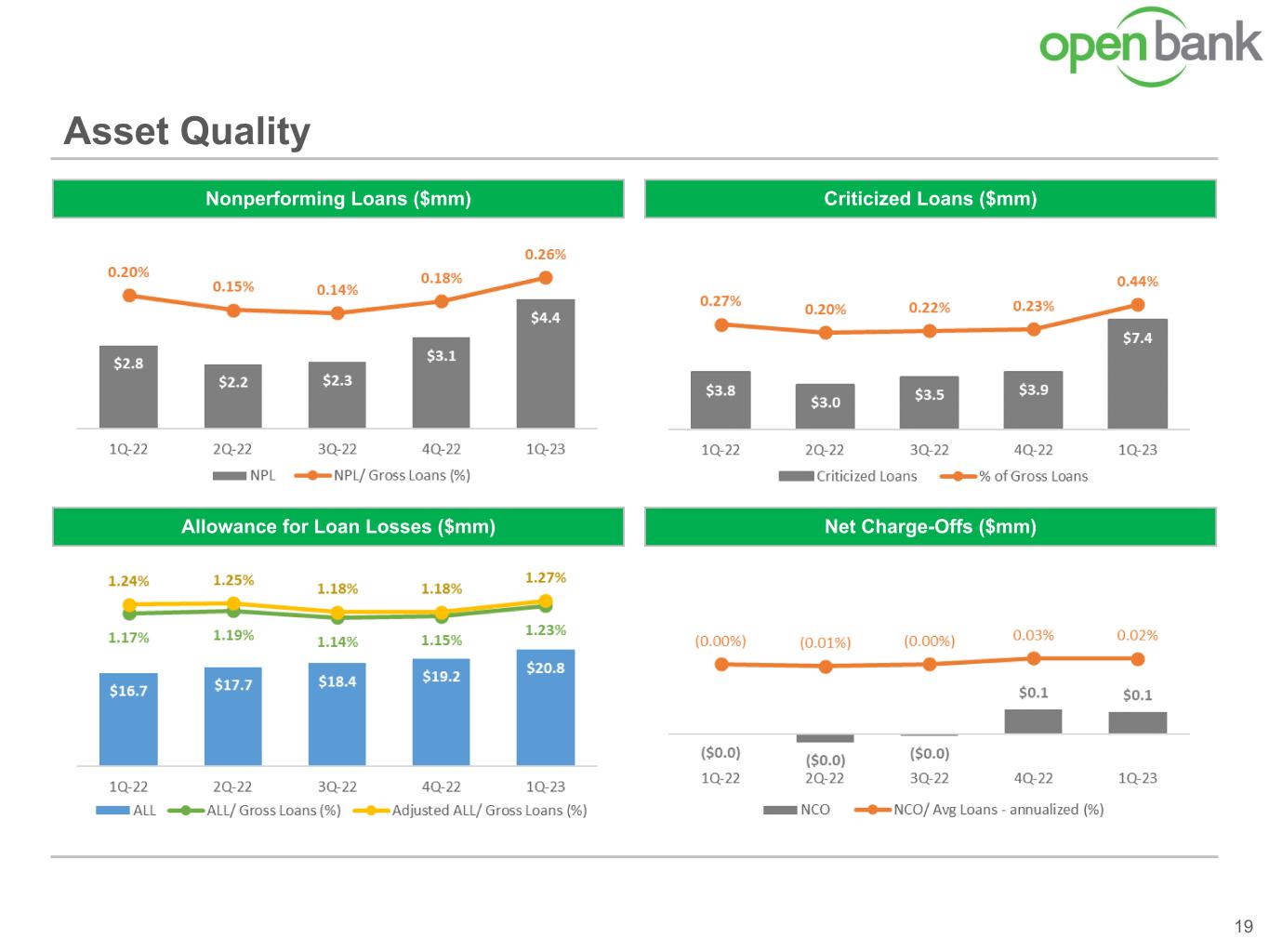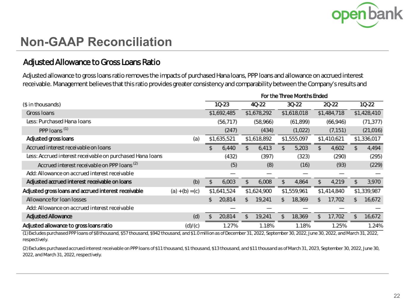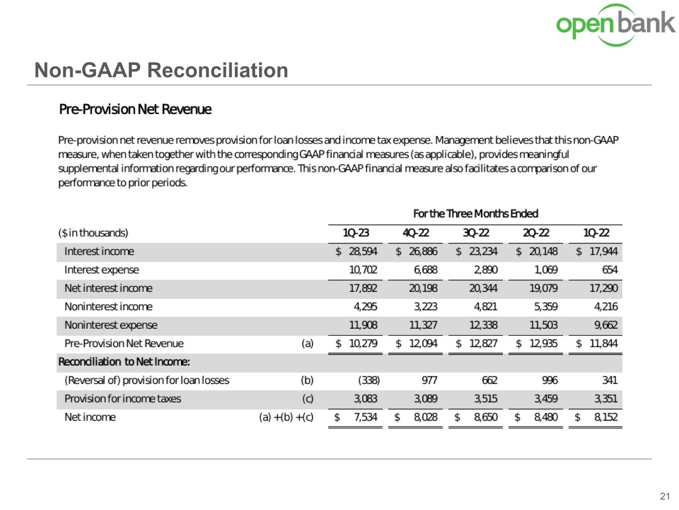 Certain matters set forth herein constitute “forward-looking statements” within the meaning of the Private Securities Litigation Reform Act of 1995, including forward-looking statements relating to the Company’s current business plans and expectations regarding future operating results. These forward-looking statements are subject to risks and uncertainties that could cause actual results, performance or achievements to differ materially from those projected. These risks and uncertainties, some of which are beyond our control, include, but are not limited to: business and economic conditions, particularly those affecting the financial services industry and our primary market areas; the continuing effects of inflation and monetary policies, and the impacts of those circumstances upon our current and prospective borrowers and depositors; our ability to mitigate and manage deposit liabilities in a manner that balances the need to meet current and expected withdrawals while investing a sufficient portion of our assets to promote strong earning capacity; our ability to successfully manage our credit risk and the sufficiency of our allowance for credit losses; factors that can impact the performance of our loan portfolio, including real estate values and liquidity in our primary market areas, the financial health of our commercial borrowers, the success of construction projects that we finance, including any loans acquired in acquisition transactions; our ability to effectively execute our strategic plan and manage our growth; interest rate fluctuations, which could have an adverse effect on our profitability; external economic and/or market factors, such as changes in monetary and fiscal policies and laws, including the interest rate policies of the Federal Reserve, inflation or deflation, changes in the demand for loans, and fluctuations in consumer spending, borrowing and savings habits, which may have an adverse impact on our financial condition; continued or increasing competition from other financial institutions, credit unions, and non-bank financial services companies, many of which are subject to less restrictive or less costly regulations than we are; challenges arising from unsuccessful attempts to expand into new geographic markets, products, or services; restraints on the ability of Open Bank to pay dividends to us, which could limit our liquidity; increased capital requirements imposed by banking regulators, which may require us to raise capital at a time when capital is not available on favorable terms or at all; a failure in the internal controls we have implemented to address the risks inherent to the business of banking; inaccuracies in our assumptions about future events, which could result in material differences between our financial projections and actual financial performance, particularly with respect to the effects of predictions of future economic conditions as those circumstances affect our estimates for the adequacy of our allowance for credit losses and the related provision expense; changes in our management personnel or our inability to retain motivate and hire qualified management personnel; disruptions, security breaches, or other adverse events, failures or interruptions in, or attacks on, our information technology systems; disruptions, security breaches, or other adverse events affecting the third-party vendors who perform several of our critical processing functions; an inability to keep pace with the rate of technological advances due to a lack of resources to invest in new technologies; risks related to potential acquisitions; political developments, uncertainties or instability, catastrophic events, acts of war or terrorism, or natural disasters, such as earthquakes, fires, drought, pandemic diseases (such as the coronavirus) or extreme weather events, any of which may affect services we use or affect our customers, employees or third parties with which we conduct business; incremental costs and obligations associated with operating as a public company; the impact of any claims or legal actions to which we may be subject, including any effect on our reputation; compliance with governmental and regulatory requirements, including the Dodd-Frank Act and others relating to banking, consumer protection, securities and tax matters, and our ability to maintain licenses required in connection with commercial mortgage origination, sale and servicing operations; changes in federal tax law or policy; and our ability the manage the foregoing and other factors set forth in the Company’s public reports. We describe these and other risks that could affect our results in Item 1A. “Risk Factors,” of our latest Annual Report on Form 10-K for the year ended December 31, 2022 and in our other subsequent filings with the Securities and Exchange Commission. Cautionary Note Regarding Forward-Looking Statements 2