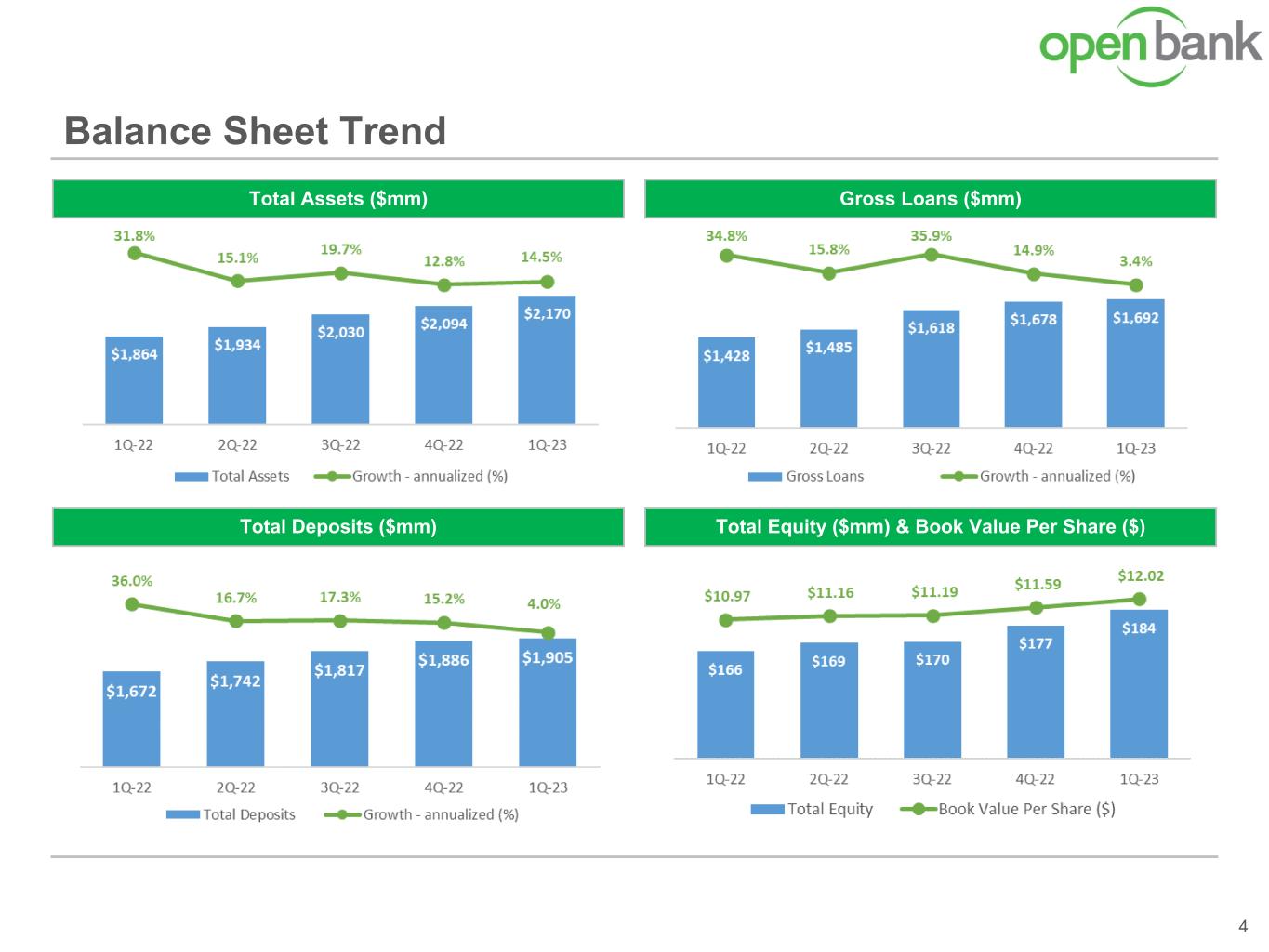 1Q-2023 Highlights vs 1Q-2022 3 (1) Annualized. (2) Allowance for credit losses (“ACL”) was calculated under the CECL methodology as of March 31, 2023; prior periods were calculated under the incurred loss methodology. (3) Includes special mention, substandard, doubtful, and loss categories. Net Income $7.5M Earnings & Profitability Balance Sheet Growth Credit Quality Capital Adequacy • Net income of $7.5 million, compared to $8.2 million • Diluted earnings per share of $0.48, compared to $0.53 • ROAA(1) and ROAE(1) of 1.43% and 16.82%, compared to 1.85% and 19.54%, respectively • Net interest margin of 3.56%, compared to 4.12% • Efficiency ratio of 53.67%, compared to 44.93% • Total assets of $2.2 billion, a 16% increase compared to $1.9 billion • Gross loans of $1.7 billion, a 18% increase compared to $1.4 billion • Total deposits of $1.9 billion, a 14% increase compared to $1.7 billion • Adopted CECL on January 1, 2023 with an additional ACL(2) of $2.1 million • ACL to gross loans of 1.23%, compared to 1.17% • Net loan charge-offs(1) to average gross loans of 0.02%, compared to 0.00% • Nonperforming loans to gross loans of 0.26%, compared to 0.20%. • Criticized loans (3) to gross loans of 0.44%, compared to 0.27% • Quarterly cash dividend of $0.12 per share, a 20% increase from $0.10 per share • Remained well-capitalized with a Common Equity Tier 1 ratio of 12.06% • Repurchased 76,990 shares of common stock at an average price of $9.25 Diluted EPS $0.48 ROAA 1.43% ROAE 16.82% NIM 3.56% Efficiency 53.67%