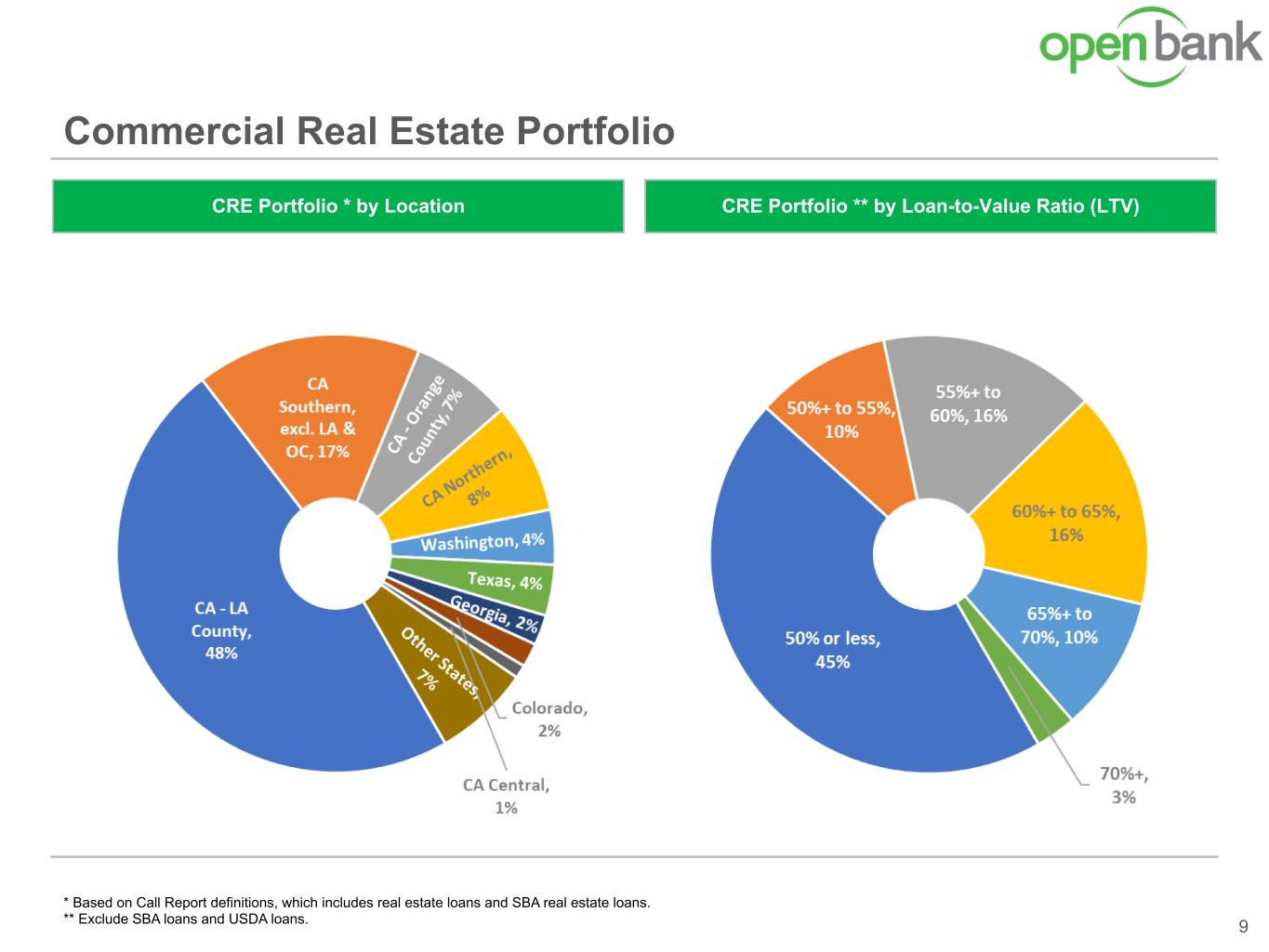 • Based on Call Report definitions, which includes real estate loans and SBA real estate loans. Commercial Real Estate Portfolio 8 CRE* Portfolio by Property TypeCRE* Portfolio by Collateral Type