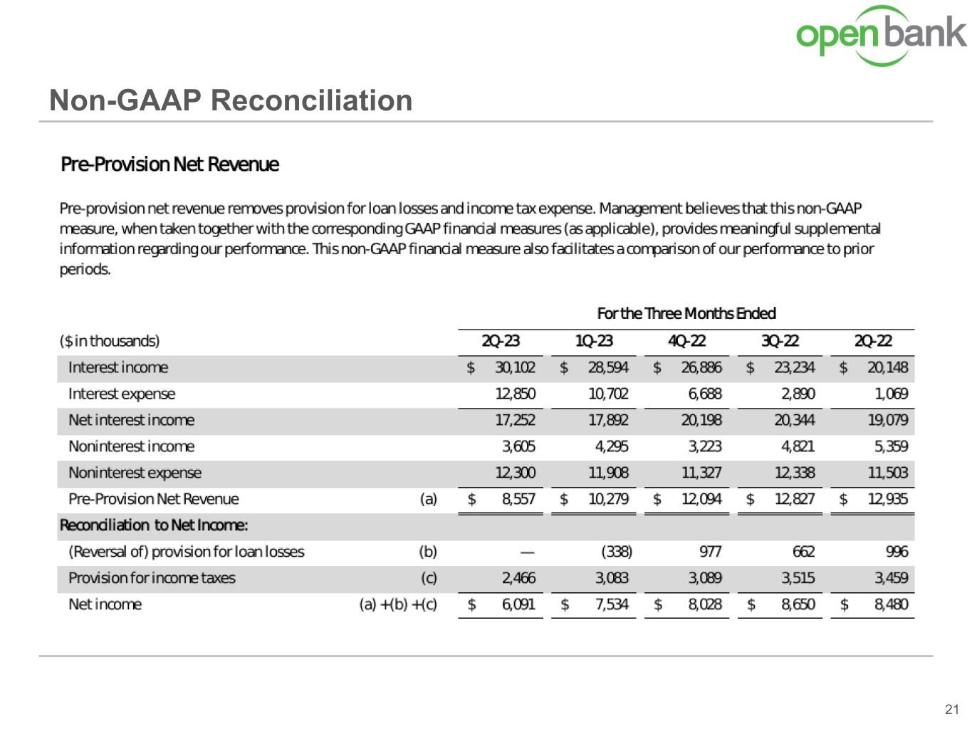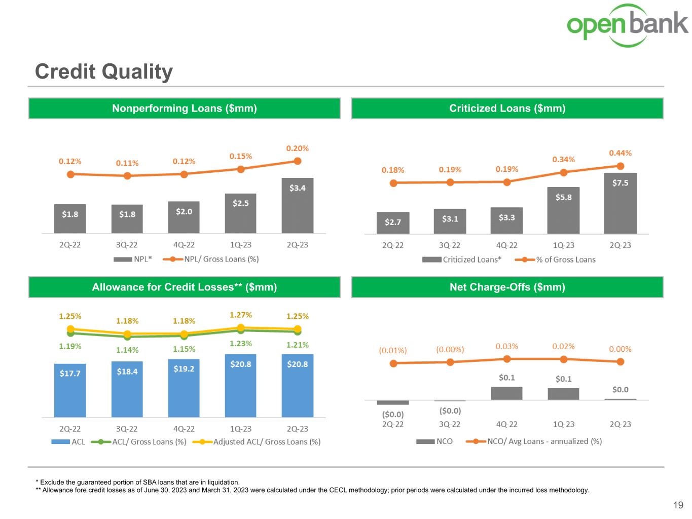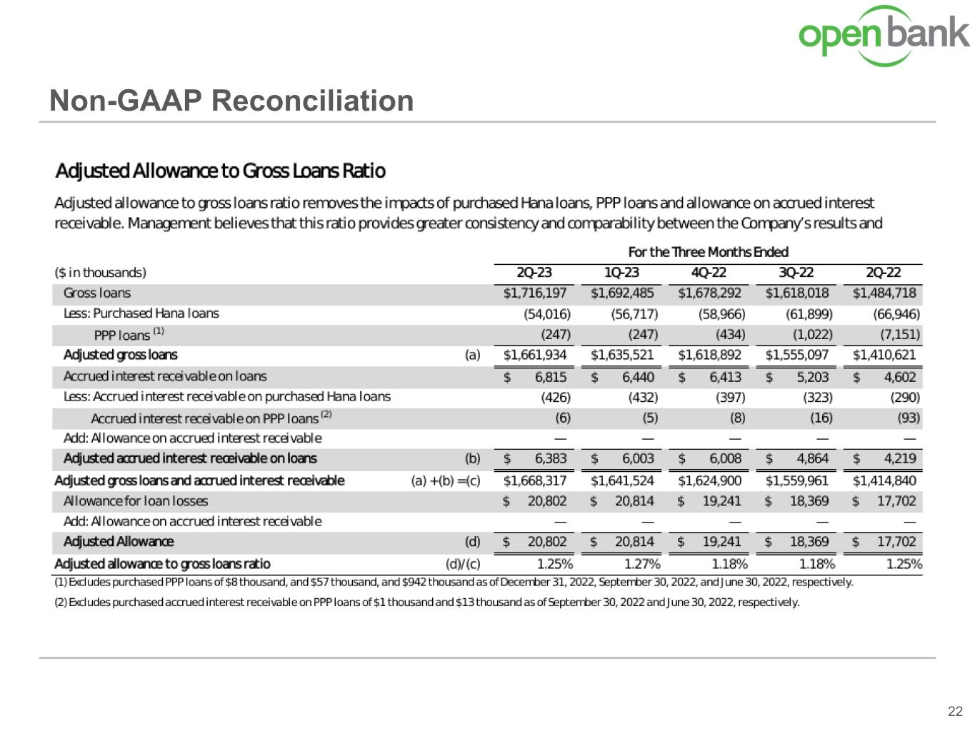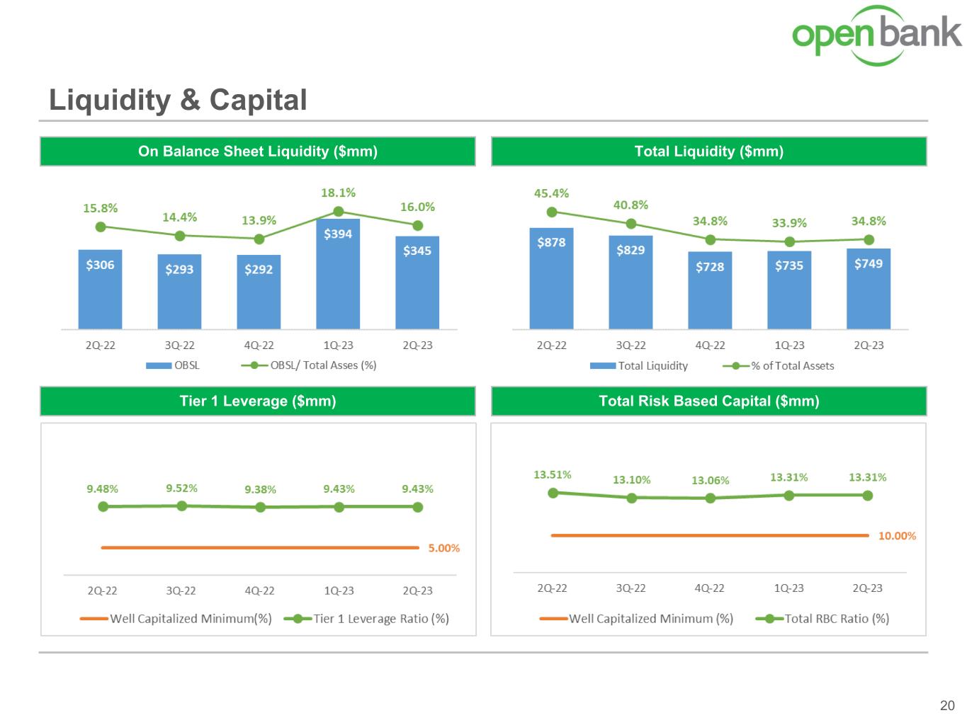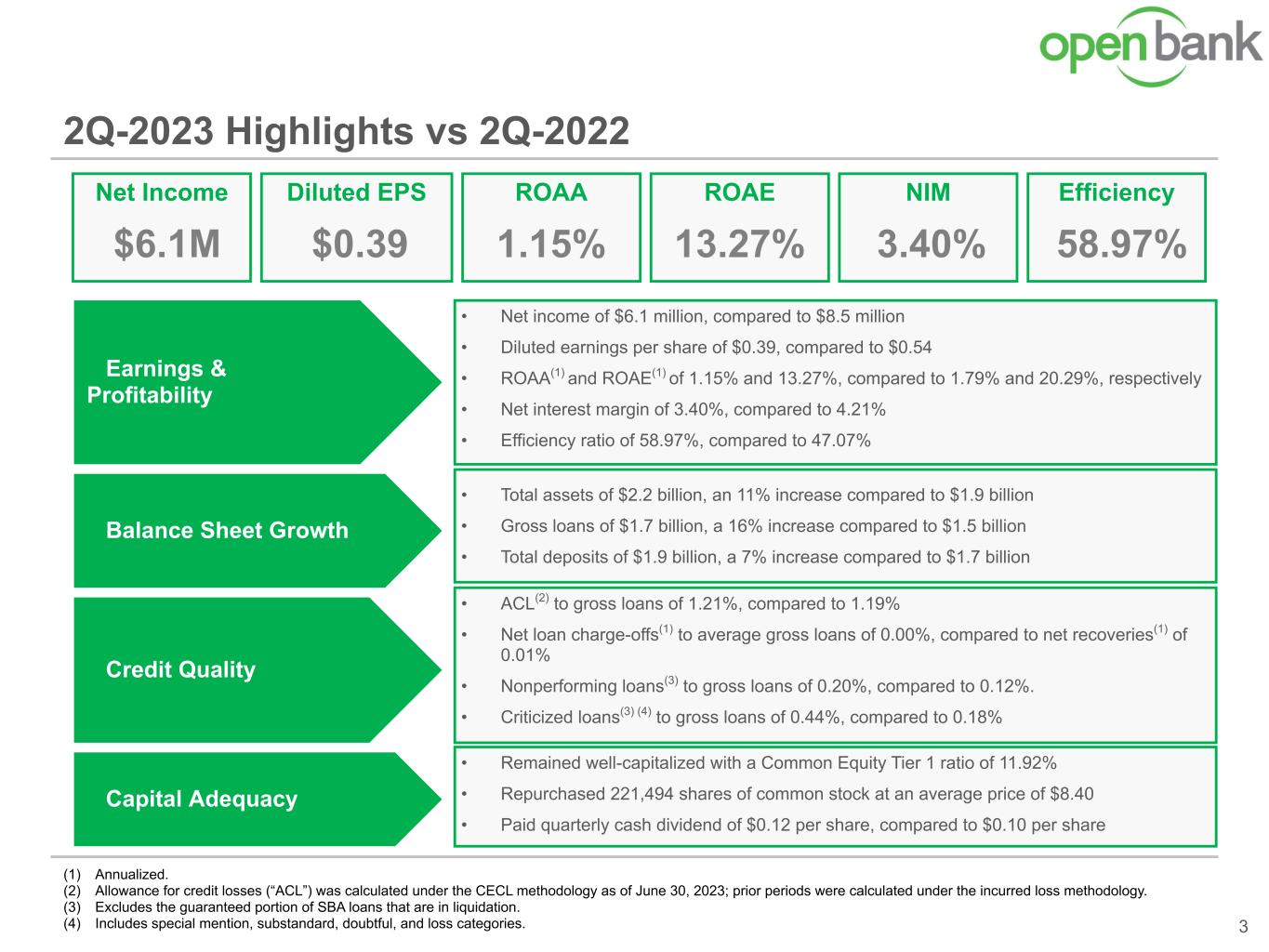 Certain matters set forth herein constitute “forward-looking statements” within the meaning of the Private Securities Litigation Reform Act of 1995, including forward-looking statements relating to the Company’s current business plans and expectations regarding future operating results. These forward-looking statements are subject to risks and uncertainties that could cause actual results, performance or achievements to differ materially from those projected. These risks and uncertainties, some of which are beyond our control, include, but are not limited to: business and economic conditions, particularly those affecting the financial services industry and our primary market areas; the continuing effects of inflation and monetary policies, and the impacts of those circumstances upon our current and prospective borrowers and depositors; our ability to mitigate and manage deposit liabilities in a manner that balances the need to meet current and expected withdrawals while investing a sufficient portion of our assets to promote strong earning capacity; our ability to successfully manage our credit risk and the sufficiency of our allowance for credit losses; factors that can impact the performance of our loan portfolio, including real estate values and liquidity in our primary market areas, the financial health of our commercial borrowers, the success of construction projects that we finance, including any loans acquired in acquisition transactions; our ability to effectively execute our strategic plan and manage our growth; interest rate fluctuations, which could have an adverse effect on our profitability; external economic and/or market factors, such as changes in monetary and fiscal policies and laws, including the interest rate policies of the Federal Reserve, inflation or deflation, changes in the demand for loans, and fluctuations in consumer spending, borrowing and savings habits, which may have an adverse impact on our financial condition; continued or increasing competition from other financial institutions, credit unions, and non-bank financial services companies, many of which are subject to less restrictive or less costly regulations than we are; challenges arising from unsuccessful attempts to expand into new geographic markets, products, or services; restraints on the ability of Open Bank to pay dividends to us, which could limit our liquidity; increased capital requirements imposed by banking regulators, which may require us to raise capital at a time when capital is not available on favorable terms or at all; a failure in the internal controls we have implemented to address the risks inherent to the business of banking; inaccuracies in our assumptions about future events, which could result in material differences between our financial projections and actual financial performance, particularly with respect to the effects of predictions of future economic conditions as those circumstances affect our estimates for the adequacy of our allowance for credit losses and the related provision expense; changes in our management personnel or our inability to retain motivate and hire qualified management personnel; disruptions, security breaches, or other adverse events, failures or interruptions in, or attacks on, our information technology systems; disruptions, security breaches, or other adverse events affecting the third-party vendors who perform several of our critical processing functions; an inability to keep pace with the rate of technological advances due to a lack of resources to invest in new technologies; risks related to potential acquisitions; political developments, uncertainties or instability, catastrophic events, acts of war or terrorism, or natural disasters, such as earthquakes, fires, drought, pandemic diseases (such as the coronavirus) or extreme weather events, any of which may affect services we use or affect our customers, employees or third parties with which we conduct business; incremental costs and obligations associated with operating as a public company; the impact of any claims or legal actions to which we may be subject, including any effect on our reputation; compliance with governmental and regulatory requirements, including the Dodd-Frank Act and others relating to banking, consumer protection, securities and tax matters, and our ability to maintain licenses required in connection with commercial mortgage origination, sale and servicing operations; changes in federal tax law or policy; and our ability the manage the foregoing and other factors set forth in the Company’s public reports. We describe these and other risks that could affect our results in Item 1A. “Risk Factors,” of our latest Annual Report on Form 10-K for the year ended December 31, 2022 and in our other subsequent filings with the Securities and Exchange Commission. Cautionary Note Regarding Forward-Looking Statements 2