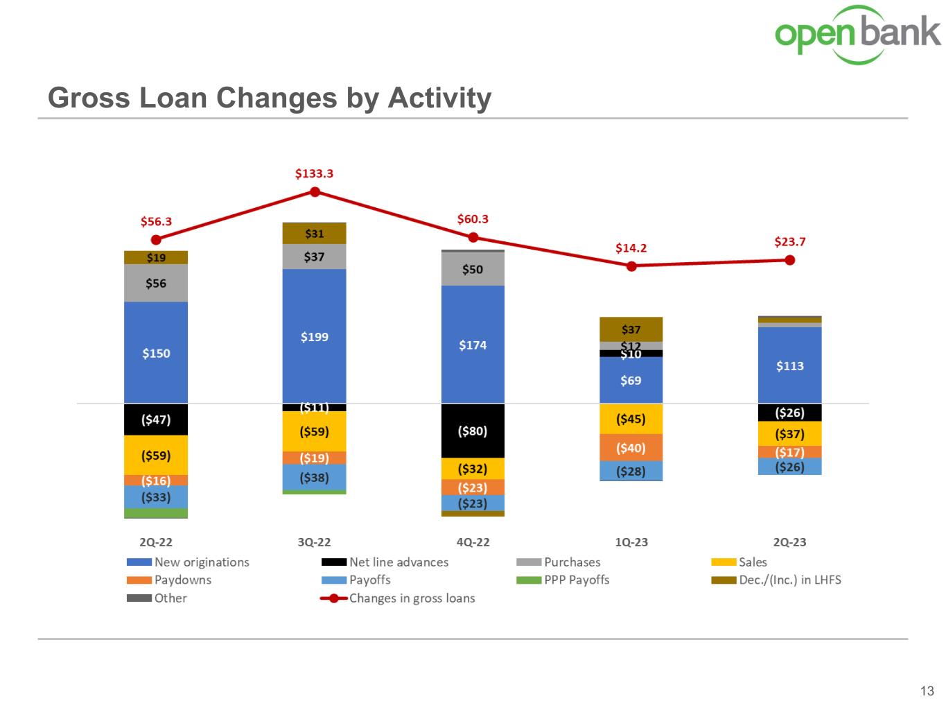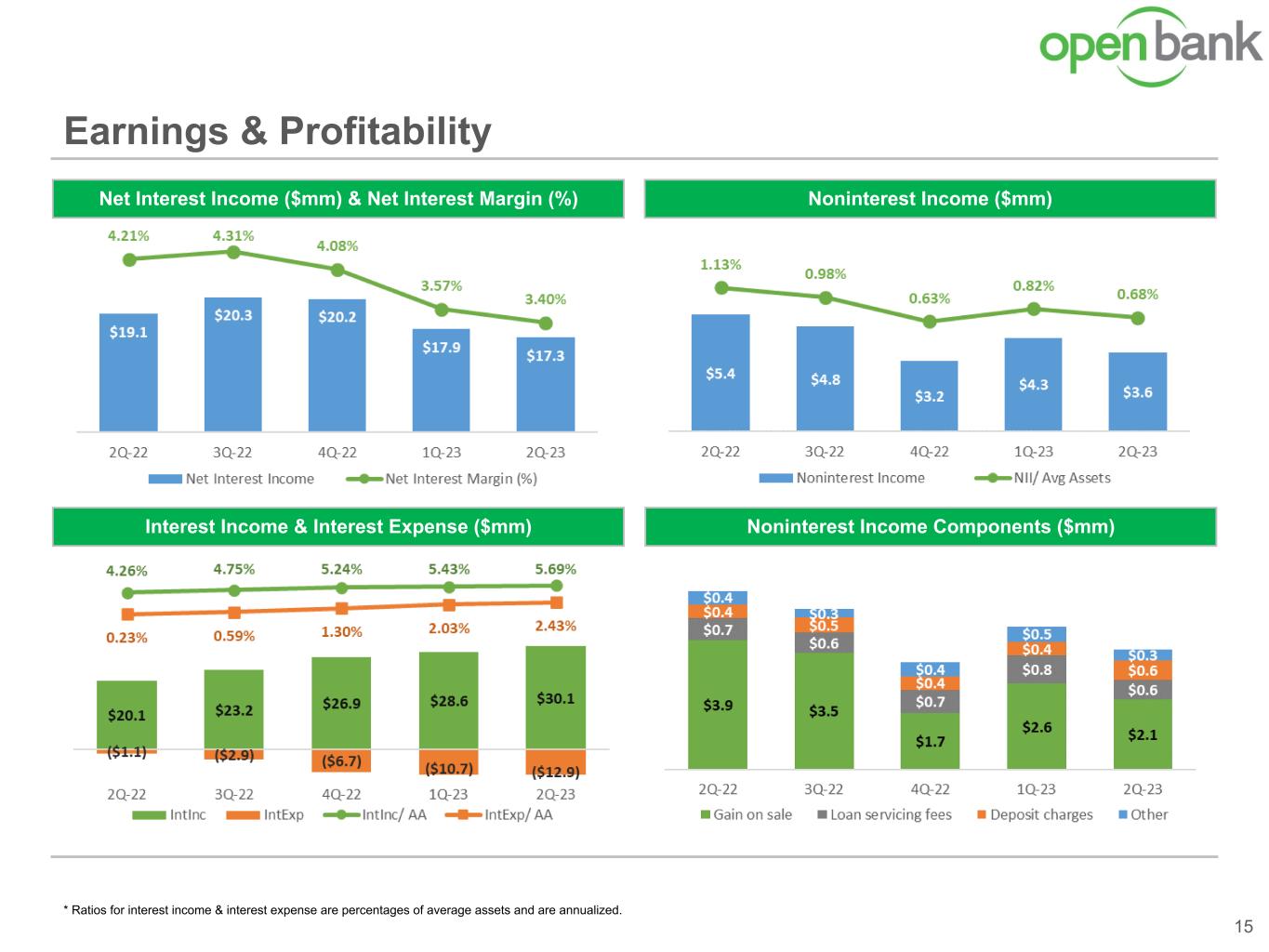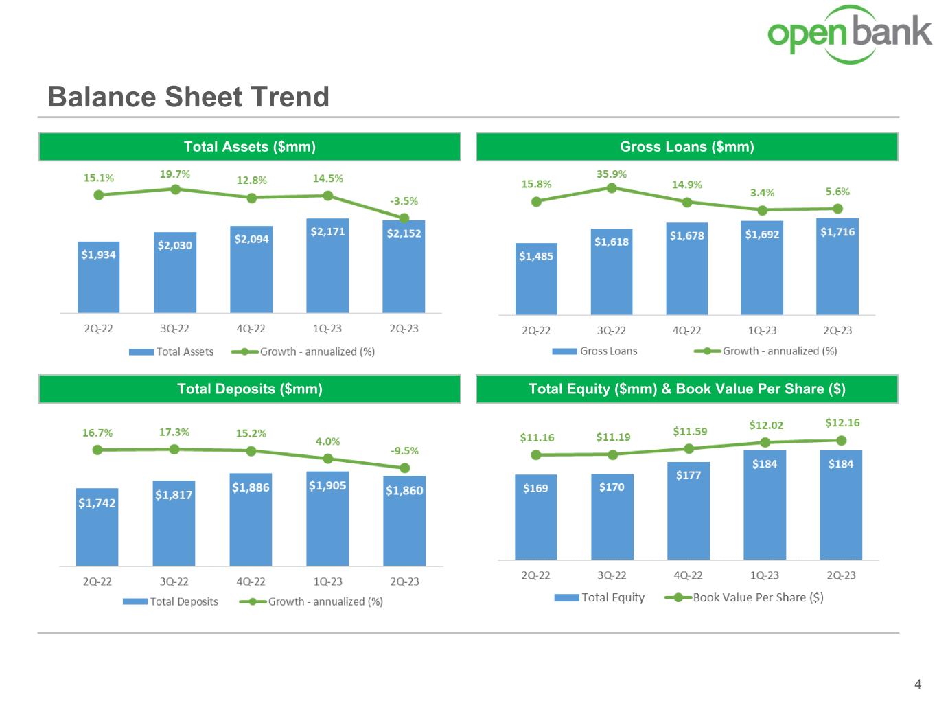 2Q-2023 Highlights vs 2Q-2022 3 (1) Annualized. (2) Allowance for credit losses (“ACL”) was calculated under the CECL methodology as of June 30, 2023; prior periods were calculated under the incurred loss methodology. (3) Excludes the guaranteed portion of SBA loans that are in liquidation. (4) Includes special mention, substandard, doubtful, and loss categories. Net Income $6.1M Earnings & Profitability Balance Sheet Growth Credit Quality Capital Adequacy • Net income of $6.1 million, compared to $8.5 million • Diluted earnings per share of $0.39, compared to $0.54 • ROAA(1) and ROAE(1) of 1.15% and 13.27%, compared to 1.79% and 20.29%, respectively • Net interest margin of 3.40%, compared to 4.21% • Efficiency ratio of 58.97%, compared to 47.07% • Total assets of $2.2 billion, an 11% increase compared to $1.9 billion • Gross loans of $1.7 billion, a 16% increase compared to $1.5 billion • Total deposits of $1.9 billion, a 7% increase compared to $1.7 billion • ACL(2) to gross loans of 1.21%, compared to 1.19% • Net loan charge-offs(1) to average gross loans of 0.00%, compared to net recoveries(1) of 0.01% • Nonperforming loans(3) to gross loans of 0.20%, compared to 0.12%. • Criticized loans(3) (4) to gross loans of 0.44%, compared to 0.18% • Remained well-capitalized with a Common Equity Tier 1 ratio of 11.92% • Repurchased 221,494 shares of common stock at an average price of $8.40 • Paid quarterly cash dividend of $0.12 per share, compared to $0.10 per share Diluted EPS $0.39 ROAA 1.15% ROAE 13.27% NIM 3.40% Efficiency 58.97%
