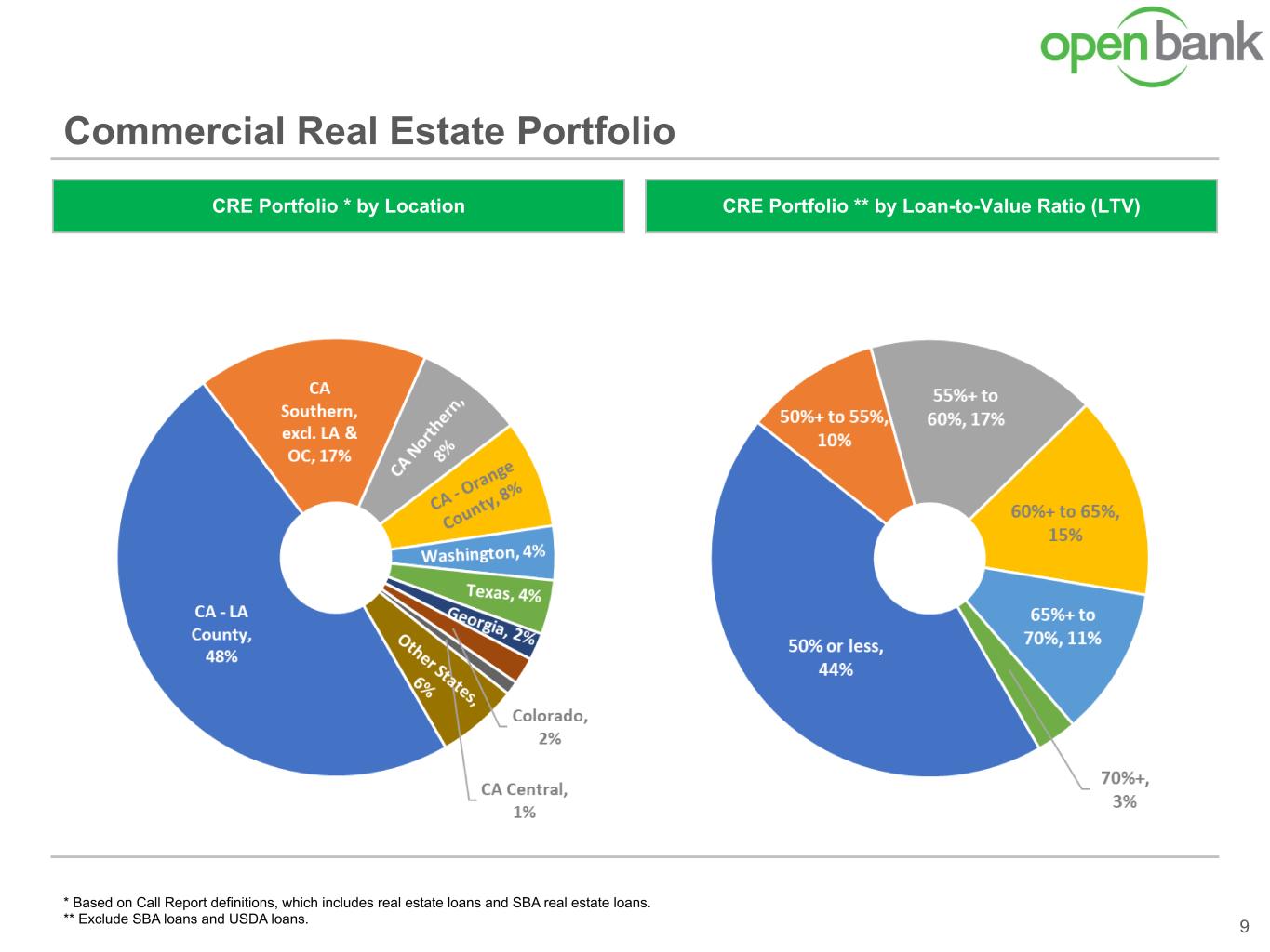• Based on Call Report definitions, which includes real estate loans and SBA real estate loans. Commercial Real Estate Portfolio 8 CRE* Portfolio by Property TypeCRE* Portfolio by Collateral Type