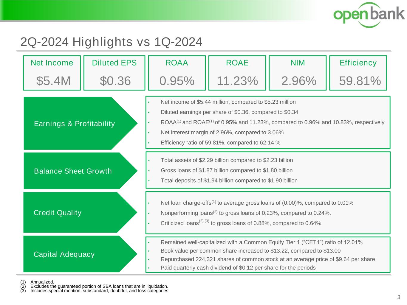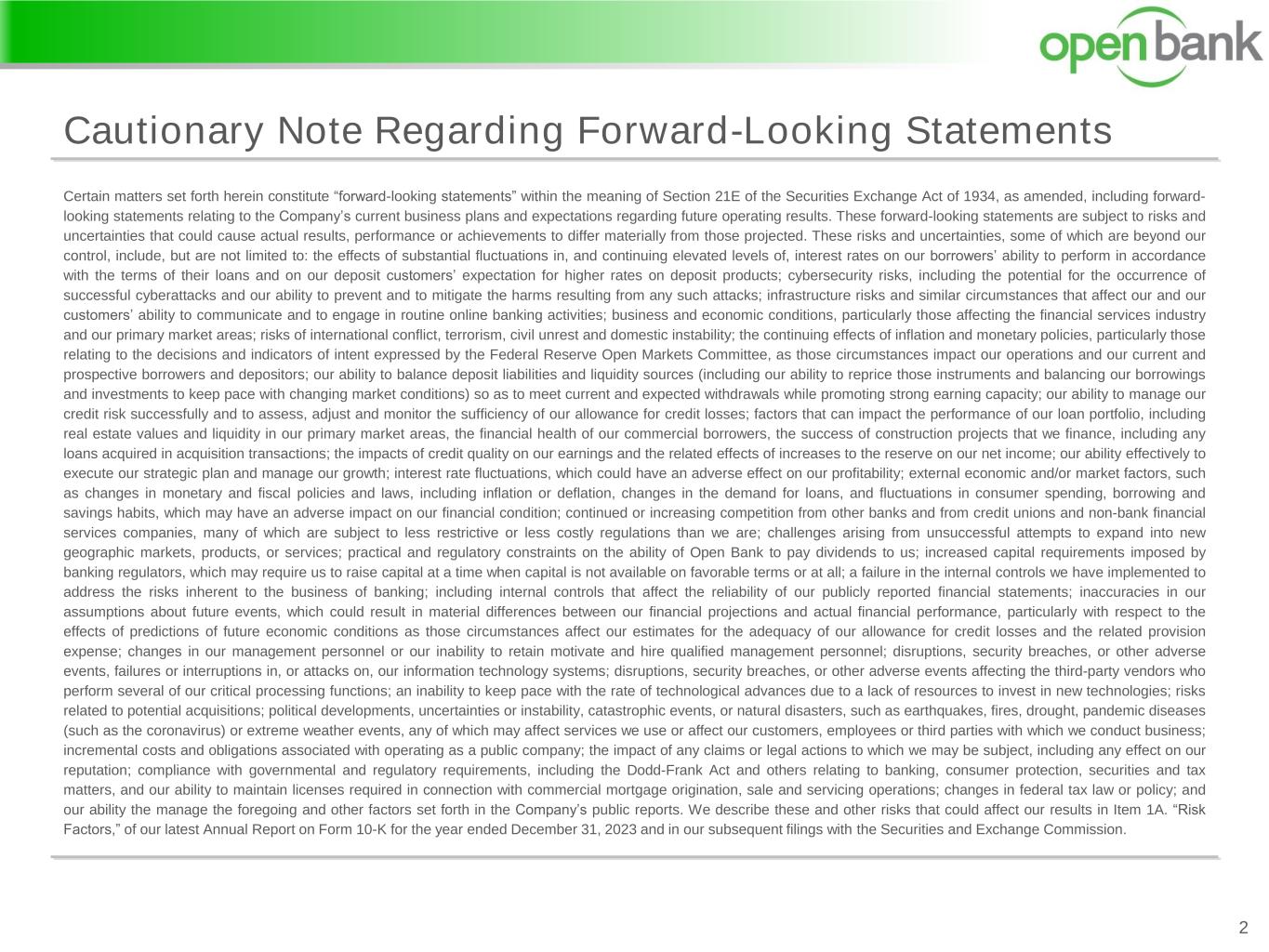 Certain matters set forth herein constitute “forward-looking statements” within the meaning of Section 21E of the Securities Exchange Act of 1934, as amended, including forward- looking statements relating to the Company’s current business plans and expectations regarding future operating results. These forward-looking statements are subject to risks and uncertainties that could cause actual results, performance or achievements to differ materially from those projected. These risks and uncertainties, some of which are beyond our control, include, but are not limited to: the effects of substantial fluctuations in, and continuing elevated levels of, interest rates on our borrowers’ ability to perform in accordance with the terms of their loans and on our deposit customers’ expectation for higher rates on deposit products; cybersecurity risks, including the potential for the occurrence of successful cyberattacks and our ability to prevent and to mitigate the harms resulting from any such attacks; infrastructure risks and similar circumstances that affect our and our customers’ ability to communicate and to engage in routine online banking activities; business and economic conditions, particularly those affecting the financial services industry and our primary market areas; risks of international conflict, terrorism, civil unrest and domestic instability; the continuing effects of inflation and monetary policies, particularly those relating to the decisions and indicators of intent expressed by the Federal Reserve Open Markets Committee, as those circumstances impact our operations and our current and prospective borrowers and depositors; our ability to balance deposit liabilities and liquidity sources (including our ability to reprice those instruments and balancing our borrowings and investments to keep pace with changing market conditions) so as to meet current and expected withdrawals while promoting strong earning capacity; our ability to manage our credit risk successfully and to assess, adjust and monitor the sufficiency of our allowance for credit losses; factors that can impact the performance of our loan portfolio, including real estate values and liquidity in our primary market areas, the financial health of our commercial borrowers, the success of construction projects that we finance, including any loans acquired in acquisition transactions; the impacts of credit quality on our earnings and the related effects of increases to the reserve on our net income; our ability effectively to execute our strategic plan and manage our growth; interest rate fluctuations, which could have an adverse effect on our profitability; external economic and/or market factors, such as changes in monetary and fiscal policies and laws, including inflation or deflation, changes in the demand for loans, and fluctuations in consumer spending, borrowing and savings habits, which may have an adverse impact on our financial condition; continued or increasing competition from other banks and from credit unions and non-bank financial services companies, many of which are subject to less restrictive or less costly regulations than we are; challenges arising from unsuccessful attempts to expand into new geographic markets, products, or services; practical and regulatory constraints on the ability of Open Bank to pay dividends to us; increased capital requirements imposed by banking regulators, which may require us to raise capital at a time when capital is not available on favorable terms or at all; a failure in the internal controls we have implemented to address the risks inherent to the business of banking; including internal controls that affect the reliability of our publicly reported financial statements; inaccuracies in our assumptions about future events, which could result in material differences between our financial projections and actual financial performance, particularly with respect to the effects of predictions of future economic conditions as those circumstances affect our estimates for the adequacy of our allowance for credit losses and the related provision expense; changes in our management personnel or our inability to retain motivate and hire qualified management personnel; disruptions, security breaches, or other adverse events, failures or interruptions in, or attacks on, our information technology systems; disruptions, security breaches, or other adverse events affecting the third-party vendors who perform several of our critical processing functions; an inability to keep pace with the rate of technological advances due to a lack of resources to invest in new technologies; risks related to potential acquisitions; political developments, uncertainties or instability, catastrophic events, or natural disasters, such as earthquakes, fires, drought, pandemic diseases (such as the coronavirus) or extreme weather events, any of which may affect services we use or affect our customers, employees or third parties with which we conduct business; incremental costs and obligations associated with operating as a public company; the impact of any claims or legal actions to which we may be subject, including any effect on our reputation; compliance with governmental and regulatory requirements, including the Dodd-Frank Act and others relating to banking, consumer protection, securities and tax matters, and our ability to maintain licenses required in connection with commercial mortgage origination, sale and servicing operations; changes in federal tax law or policy; and our ability the manage the foregoing and other factors set forth in the Company’s public reports. We describe these and other risks that could affect our results in Item 1A. “Risk Factors,” of our latest Annual Report on Form 10-K for the year ended December 31, 2023 and in our subsequent filings with the Securities and Exchange Commission. Cautionary Note Regarding Forward-Looking Statements 2