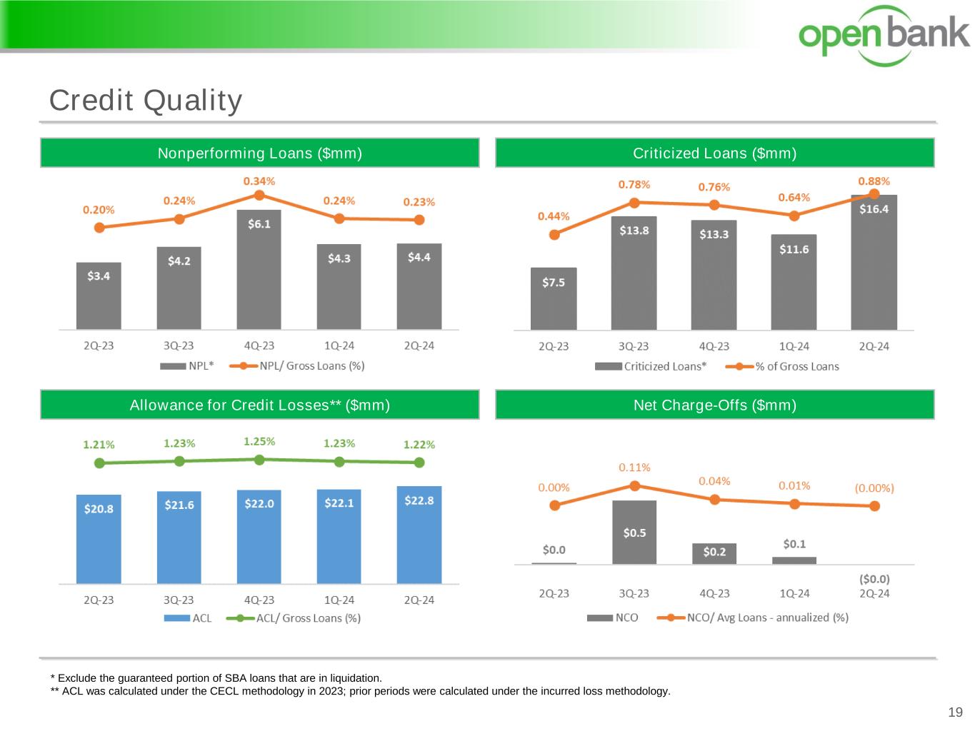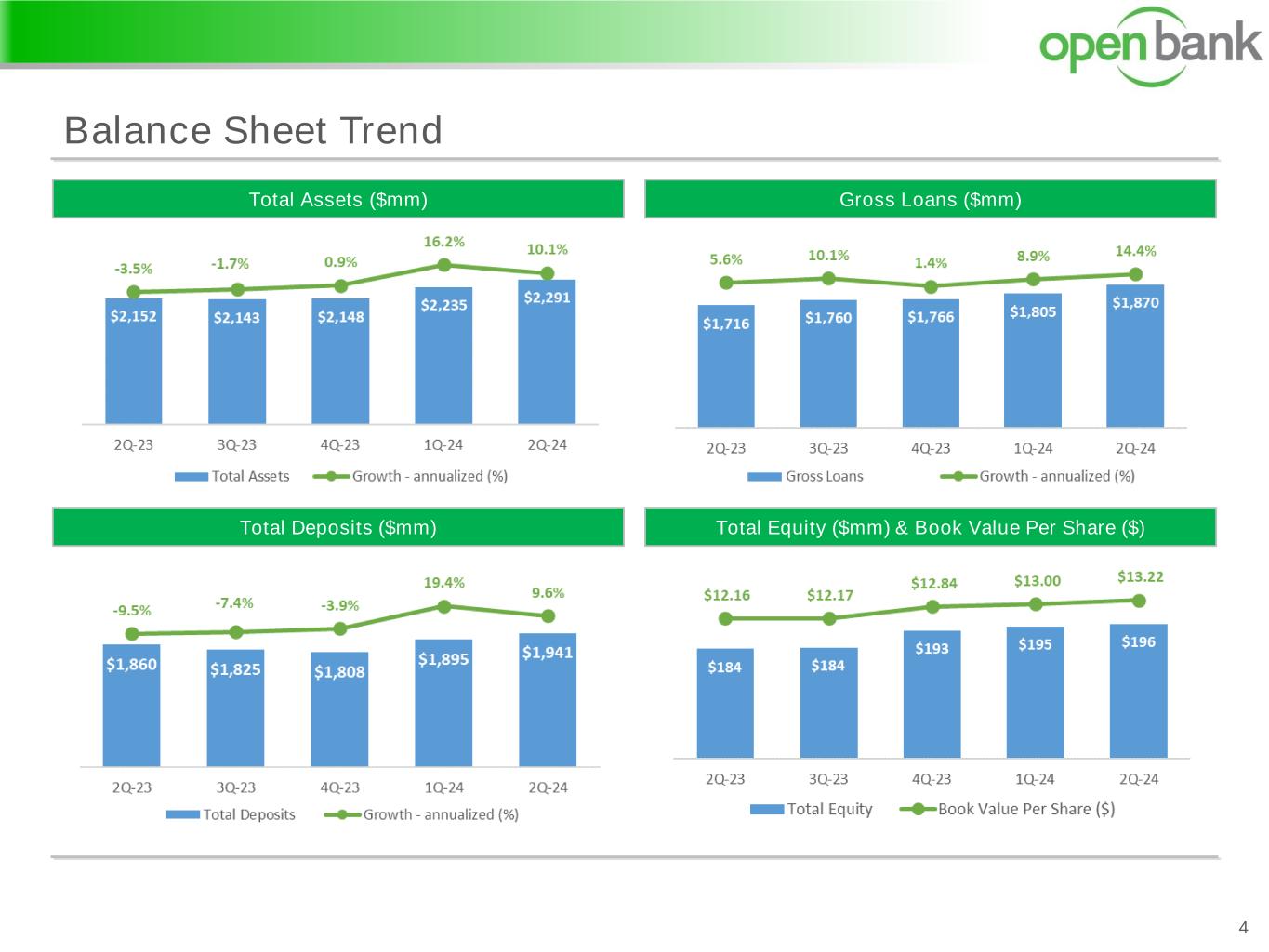2Q-2024 Highlights vs 1Q-2024 3 (1) Annualized. (2) Excludes the guaranteed portion of SBA loans that are in liquidation. (3) Includes special mention, substandard, doubtful, and loss categories. Net Income $5.4M Earnings & Profitability Balance Sheet Growth Credit Quality Capital Adequacy • Net income of $5.44 million, compared to $5.23 million • Diluted earnings per share of $0.36, compared to $0.34 • ROAA(1) and ROAE(1) of 0.95% and 11.23%, compared to 0.96% and 10.83%, respectively • Net interest margin of 2.96%, compared to 3.06% • Efficiency ratio of 59.81%, compared to 62.14 % • Total assets of $2.29 billion compared to $2.23 billion • Gross loans of $1.87 billion compared to $1.80 billion • Total deposits of $1.94 billion compared to $1.90 billion • Net loan charge-offs(1) to average gross loans of (0.00)%, compared to 0.01% • Nonperforming loans(2) to gross loans of 0.23%, compared to 0.24%. • Criticized loans (2) (3) to gross loans of 0.88%, compared to 0.64% • Remained well-capitalized with a Common Equity Tier 1 (“CET1”) ratio of 12.01% • Book value per common share increased to $13.22, compared to $13.00 • Repurchased 224,321 shares of common stock at an average price of $9.64 per share • Paid quarterly cash dividend of $0.12 per share for the periods Diluted EPS $0.36 ROAA 0.95% ROAE 11.23% NIM 2.96% Efficiency 59.81%