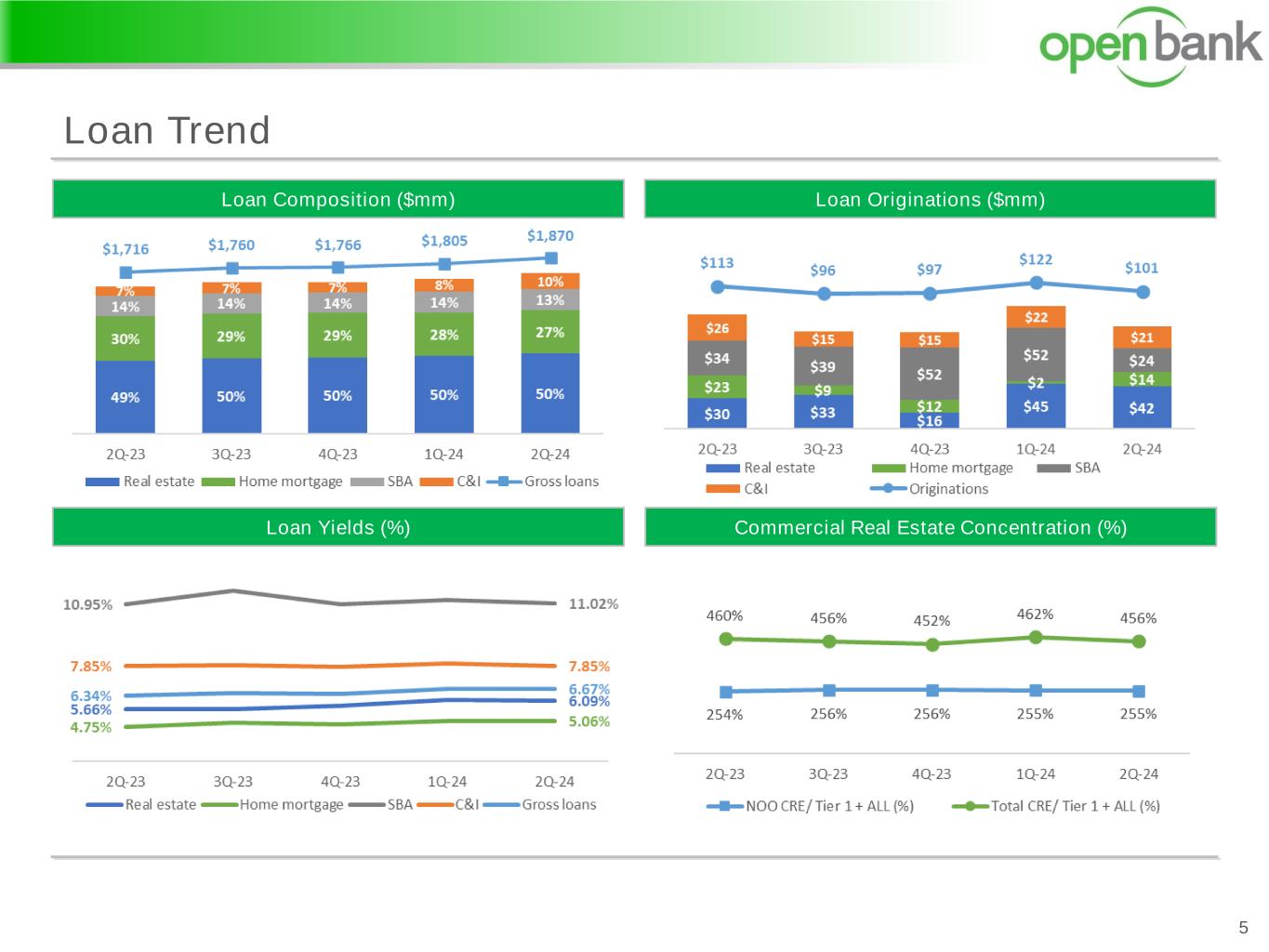 Loan Trend 5 Loan Originations ($mm)Loan Composition ($mm) Loan Yields (%) Commercial Real Estate Concentration (%)