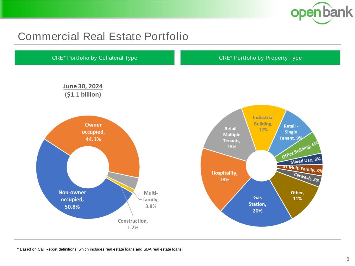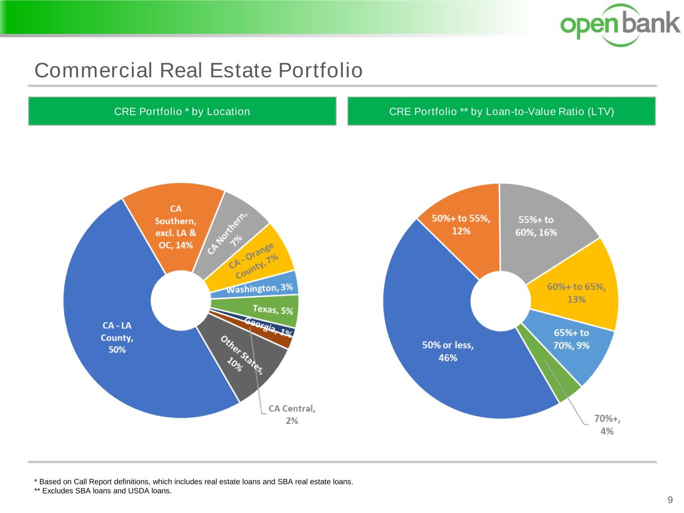 * Based on Call Report definitions, which includes real estate loans and SBA real estate loans. Commercial Real Estate Portfolio 8 CRE* Portfolio by Property TypeCRE* Portfolio by Collateral Type