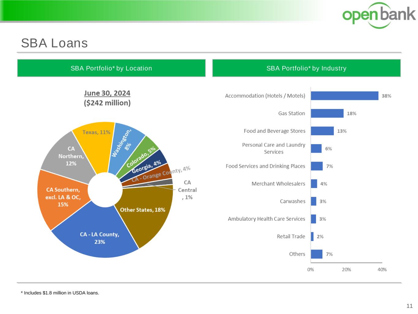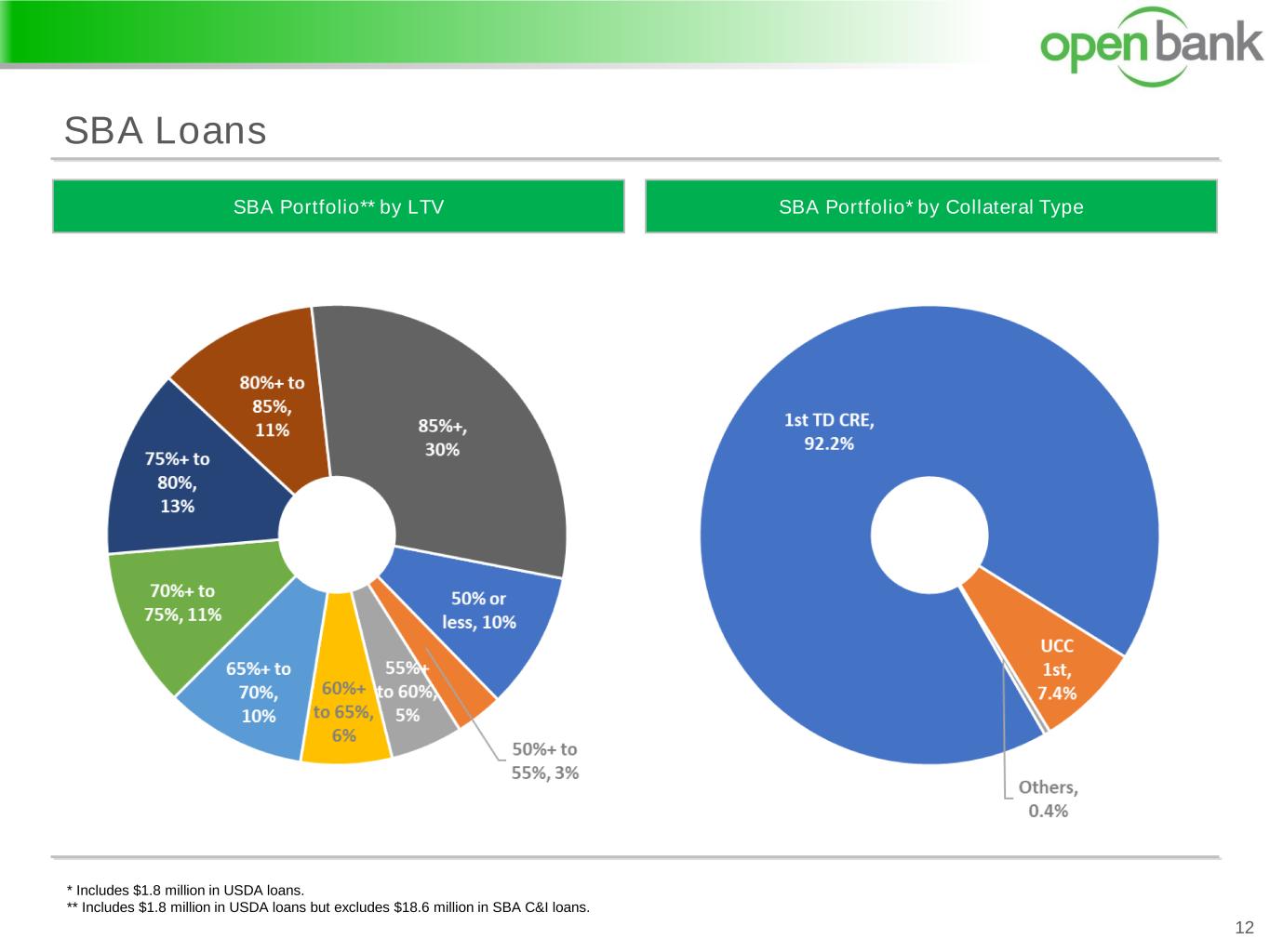* Includes $1.8 million in USDA loans. SBA Loans 11 SBA Portfolio* by IndustrySBA Portfolio* by Location