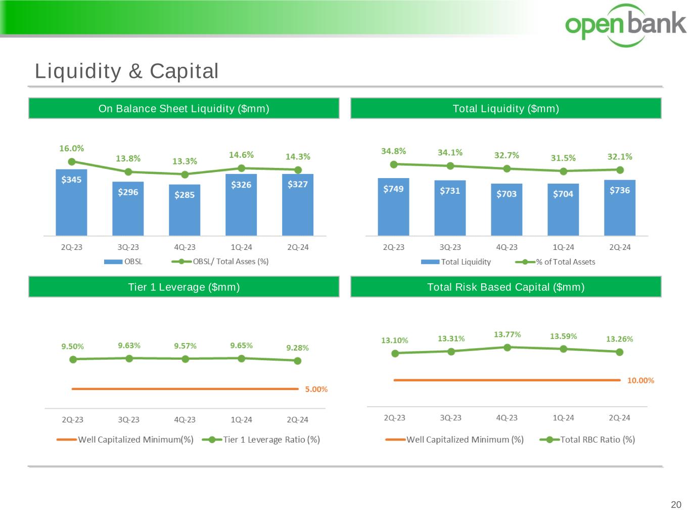 Credit Quality 19 Criticized Loans ($mm)Nonperforming Loans ($mm) Net Charge-Offs ($mm)Allowance for Credit Losses** ($mm) * Exclude the guaranteed portion of SBA loans that are in liquidation. ** ACL was calculated under the CECL methodology in 2023; prior periods were calculated under the incurred loss methodology.