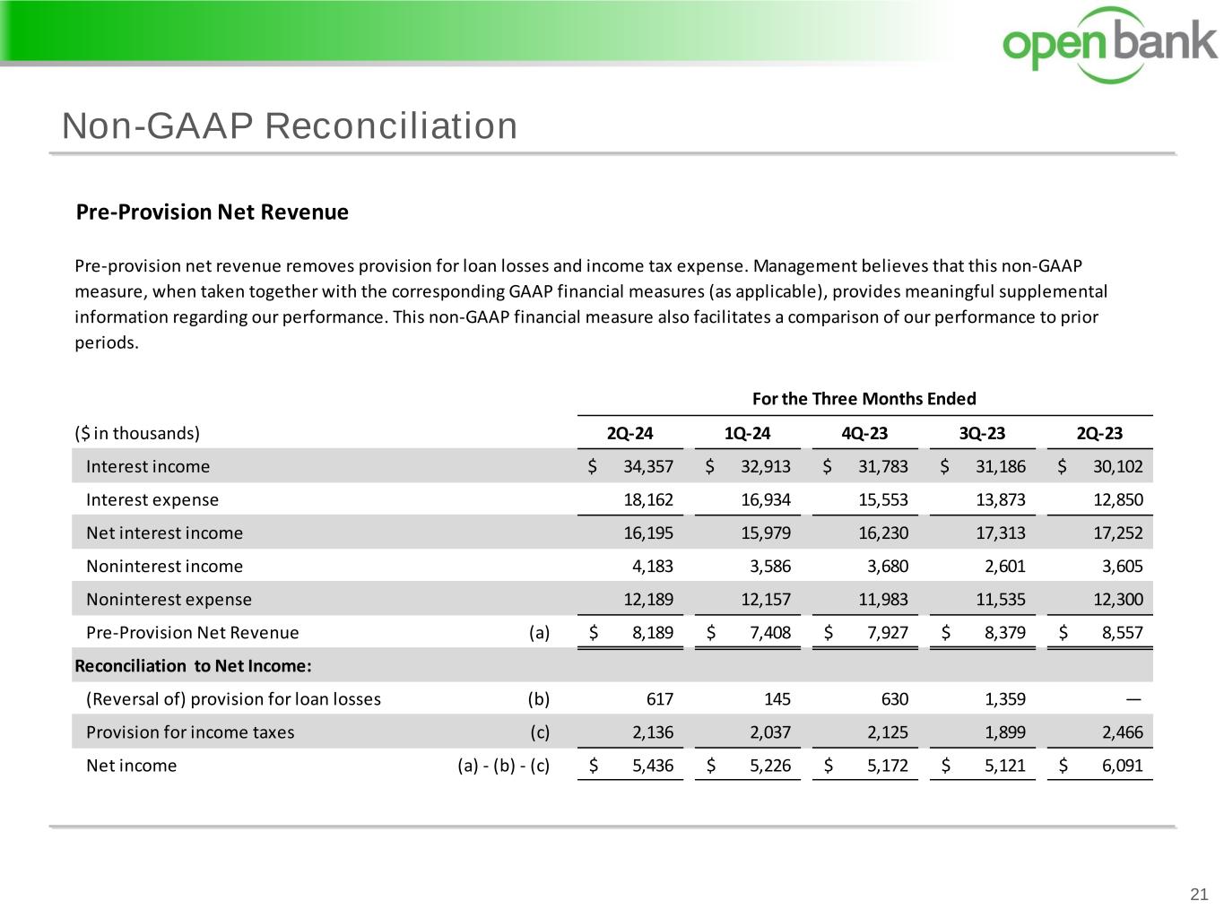 Non-GAAP Reconciliation 21 Pre-Provision Net Revenue ($ in thousands) 2Q-24 1Q-24 4Q-23 3Q-23 2Q-23 Interest income 34,357$ 32,913$ 31,783$ 31,186$ 30,102$ Interest expense 18,162 16,934 15,553 13,873 12,850 Net interest income 16,195 15,979 16,230 17,313 17,252 Noninterest income 4,183 3,586 3,680 2,601 3,605 Noninterest expense 12,189 12,157 11,983 11,535 12,300 Pre-Provision Net Revenue (a) 8,189$ 7,408$ 7,927$ 8,379$ 8,557$ Reconciliation to Net Income: (Reversal of) provision for loan losses (b) 617 145 630 1,359 — Provision for income taxes (c) 2,136 2,037 2,125 1,899 2,466 Net income (a) - (b) - (c) 5,436$ 5,226$ 5,172$ 5,121$ 6,091$ For the Three Months Ended Pre-provision net revenue removes provision for loan losses and income tax expense. Management believes that this non-GAAP measure, when taken together with the corresponding GAAP financial measures (as applicable), provides meaningful supplemental information regarding our performance. This non-GAAP financial measure also facilitates a comparison of our performance to prior periods.