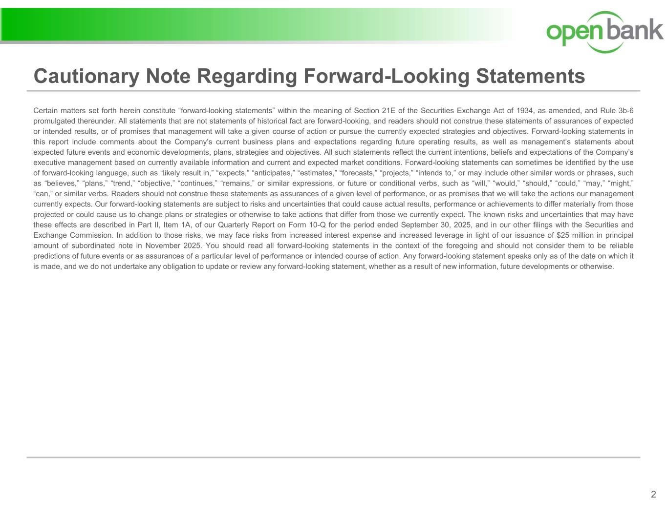 Certain matters set forth herein constitute “forward-looking statements” within the meaning of Section 21E of the Securities Exchange Act of 1934, as amended, and Rule 3b-6 promulgated thereunder. All statements that are not statements of historical fact are forward-looking, and readers should not construe these statements of assurances of expected or intended results, or of promises that management will take a given course of action or pursue the currently expected strategies and objectives. Forward-looking statements in this report include comments about the Company’s current business plans and expectations regarding future operating results, as well as management’s statements about expected future events and economic developments, plans, strategies and objectives. All such statements reflect the current intentions, beliefs and expectations of the Company’s executive management based on currently available information and current and expected market conditions. Forward-looking statements can sometimes be identified by the use of forward-looking language, such as “likely result in,” “expects,” “anticipates,” “estimates,” “forecasts,” “projects,” “intends to,” or may include other similar words or phrases, such as “believes,” “plans,” “trend,” “objective,” “continues,” “remains,” or similar expressions, or future or conditional verbs, such as “will,” “would,” “should,” “could,” “may,” “might,” “can,” or similar verbs. Readers should not construe these statements as assurances of a given level of performance, or as promises that we will take the actions our management currently expects. Our forward-looking statements are subject to risks and uncertainties that could cause actual results, performance or achievements to differ materially from those projected or could cause us to change plans or strategies or otherwise to take actions that differ from those we currently expect. The known risks and uncertainties that may have these effects are described in Part II, Item 1A, of our Quarterly Report on Form 10-Q for the period ended September 30, 2025, and in our other filings with the Securities and Exchange Commission. In addition to those risks, we may face risks from increased interest expense and increased leverage in light of our issuance of $25 million in principal amount of subordinated note in November 2025. You should read all forward-looking statements in the context of the foregoing and should not consider them to be reliable predictions of future events or as assurances of a particular level of performance or intended course of action. Any forward-looking statement speaks only as of the date on which it is made, and we do not undertake any obligation to update or review any forward-looking statement, whether as a result of new information, future developments or otherwise. Cautionary Note Regarding Forward-Looking Statements 2
