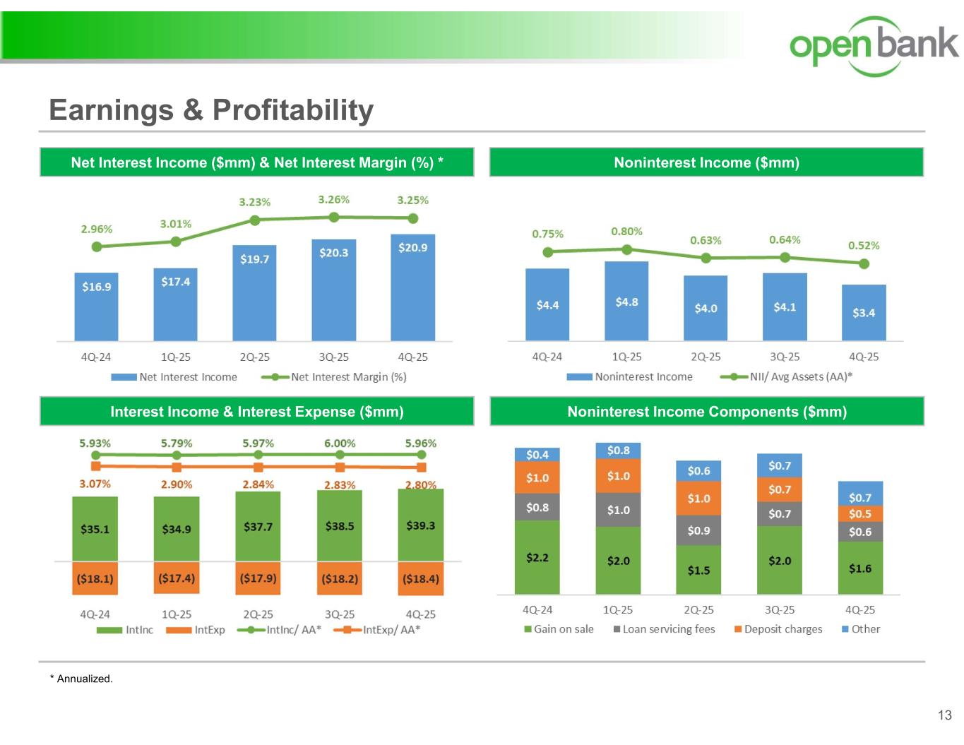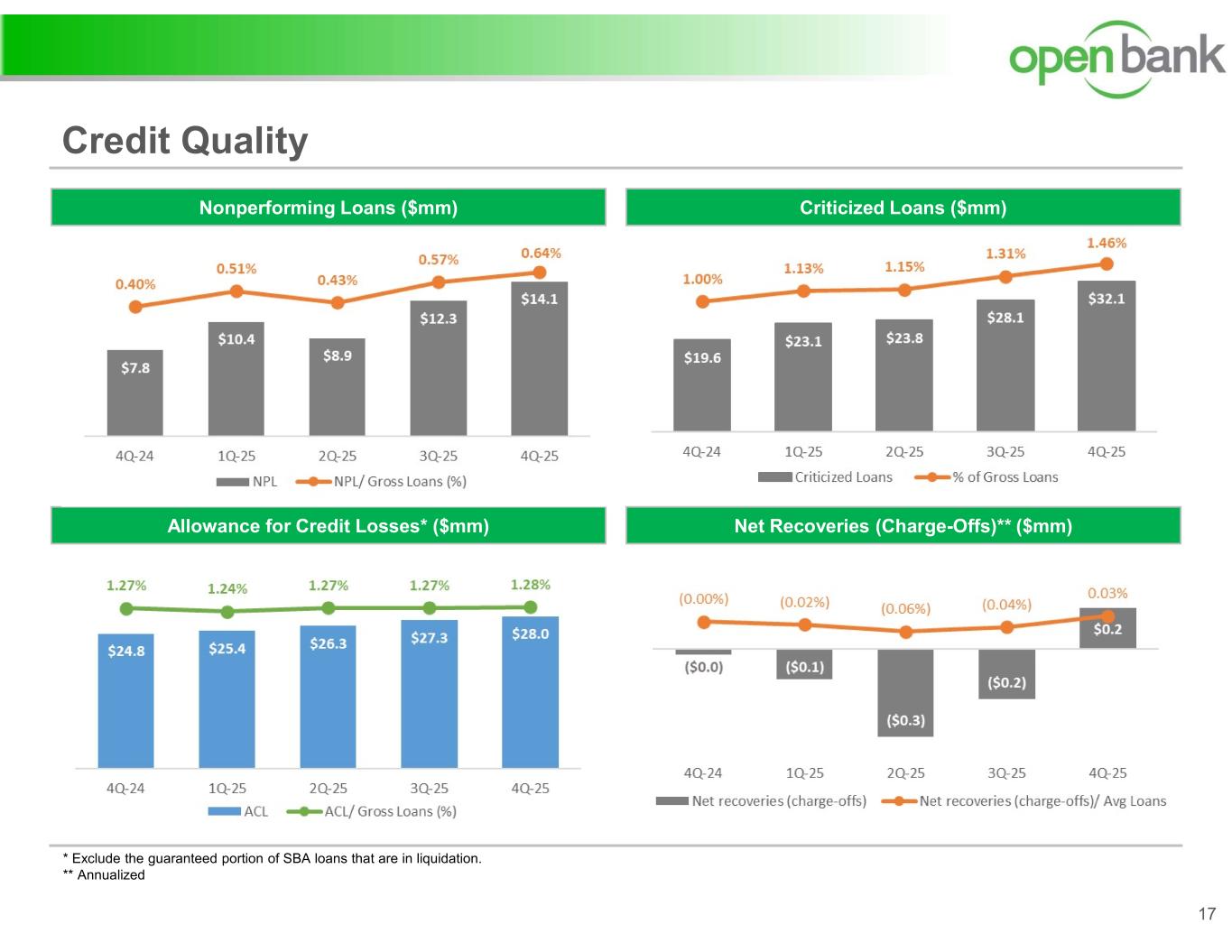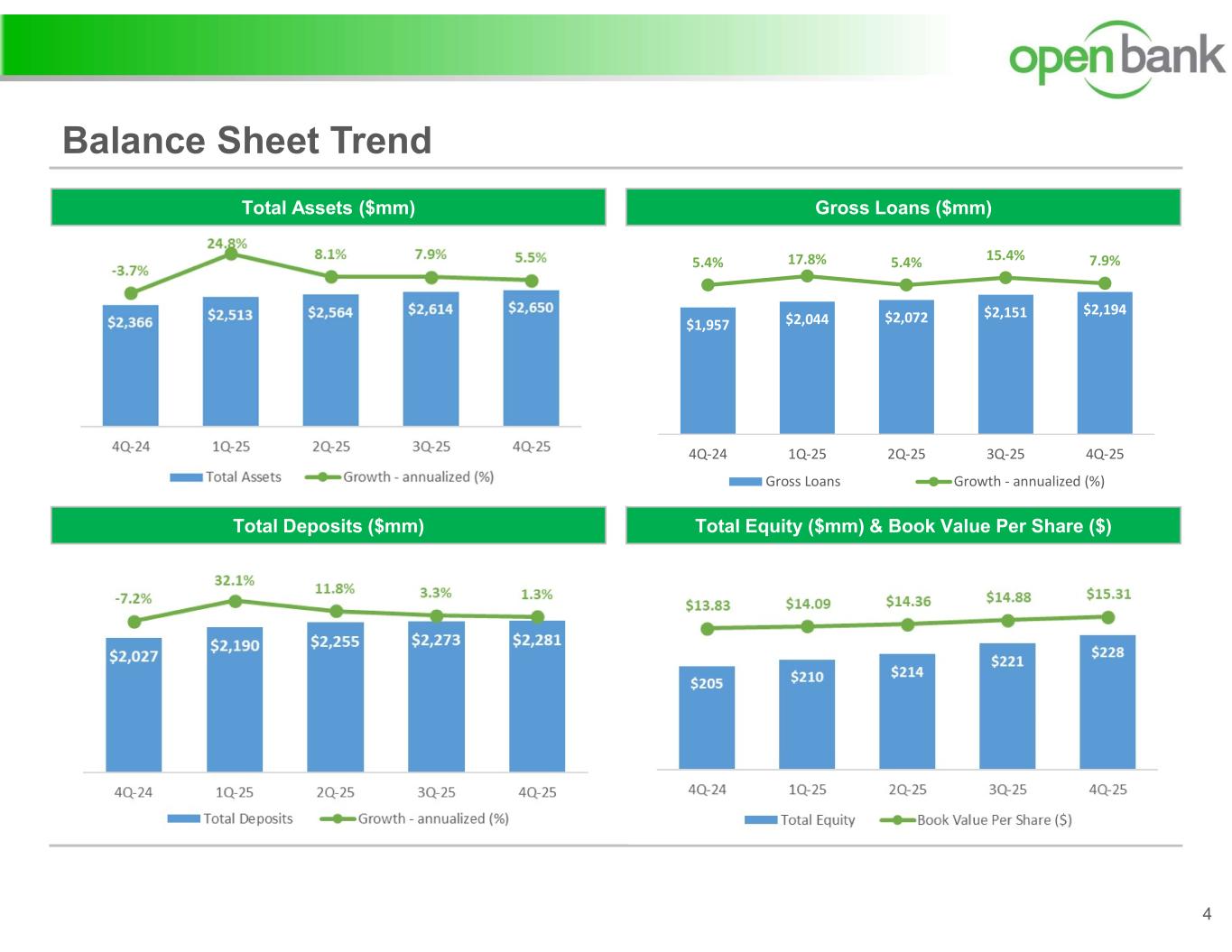 4Q-2025 Highlights vs 3Q-2025 3 (1) Annualized. (2) Excludes the guaranteed portion of SBA loans that are in liquidation. (3) Includes special mention, substandard, doubtful, and loss categories. Net Income $7.0M Earnings & Profitability Balance Sheet Growth Credit Quality Capital Adequacy • Net income of $7.0 million, compared to $6.7 million • Diluted earnings per share of $0.47, compared to $0.45 • ROA(1) and ROE(1) of 1.07% and 12.57%, compared to 1.04% and 12.36%, respectively • Net interest margin of 3.25%, compared to 3.26% • Efficiency ratio of 58.87%, compared to 55.68% • Total assets of $2.65 billion, an 1% increase compared to $2.61 billion • Gross loans of $2.19 billion, a 2% increase compared to $2.15 billion • Total deposits of $2.28 billion, remaining nearly unchanged from $2.27 billion • Net recoveries (charge-offs)(1) to average gross loans of 0.03%, compared to (0.04)% • Nonperforming loans(2) to gross loans of 0.64%, compared to 0.57%. • Criticized loans(2) (3) to gross loans of 1.46%, compared to 1.31% • Remained well-capitalized with a Common Equity Tier 1 (“CET1”) ratio of 10.93% • Book value per common share increased to $15.31, compared to $14.88 • Paid quarterly cash dividend of $0.12 per share for the periods Diluted EPS $0.47 ROA (1) 1.07% ROE (1) 12.57% NIM 3.25% Efficiency 58.87%