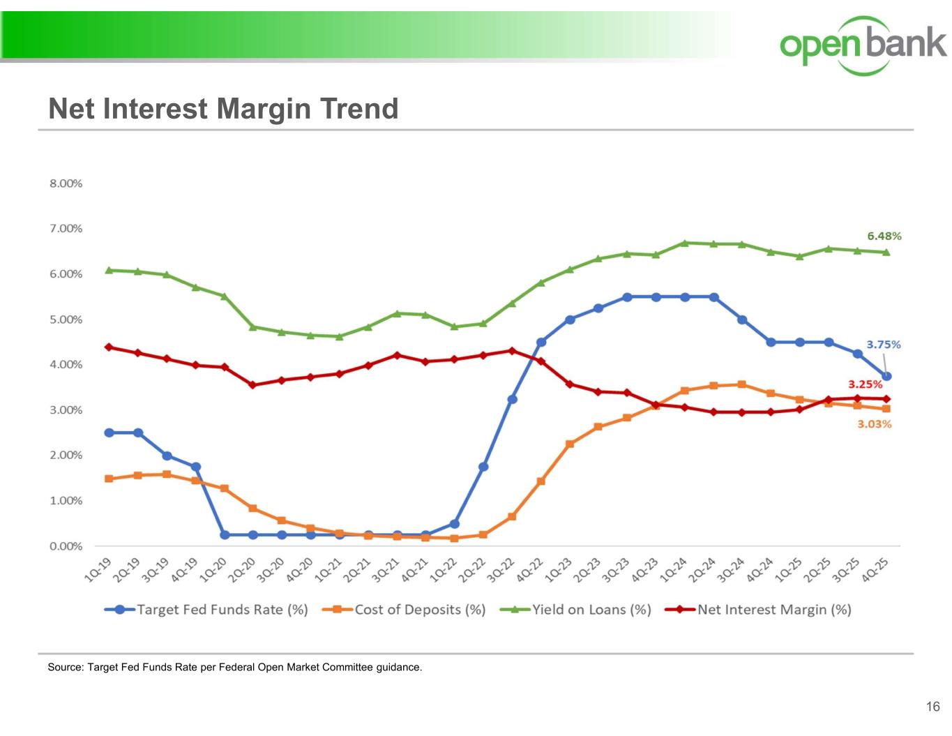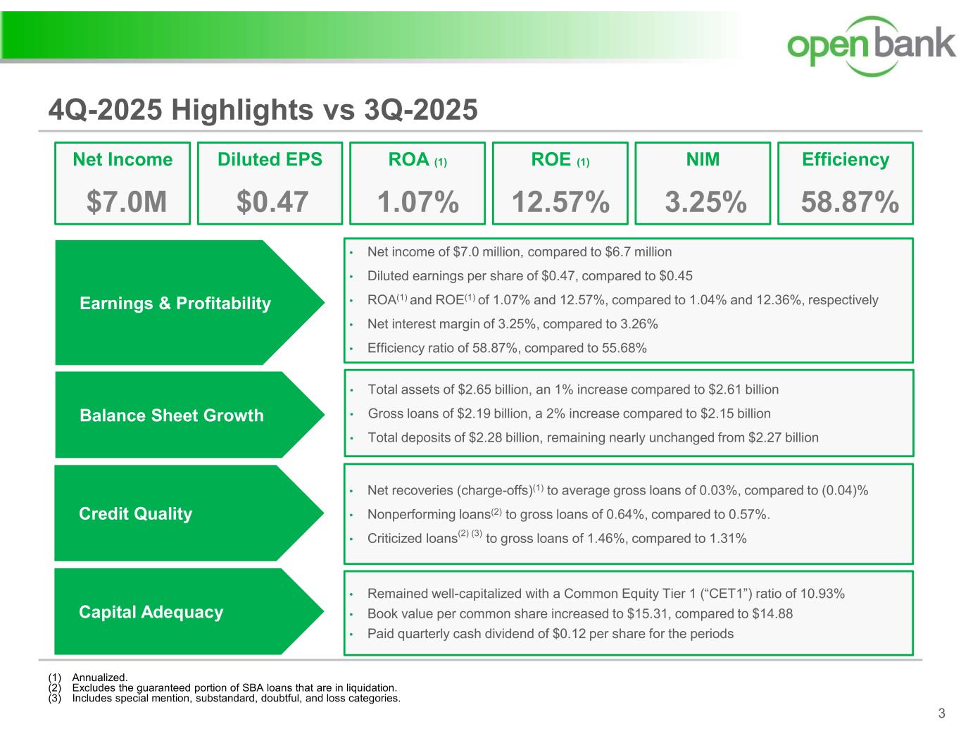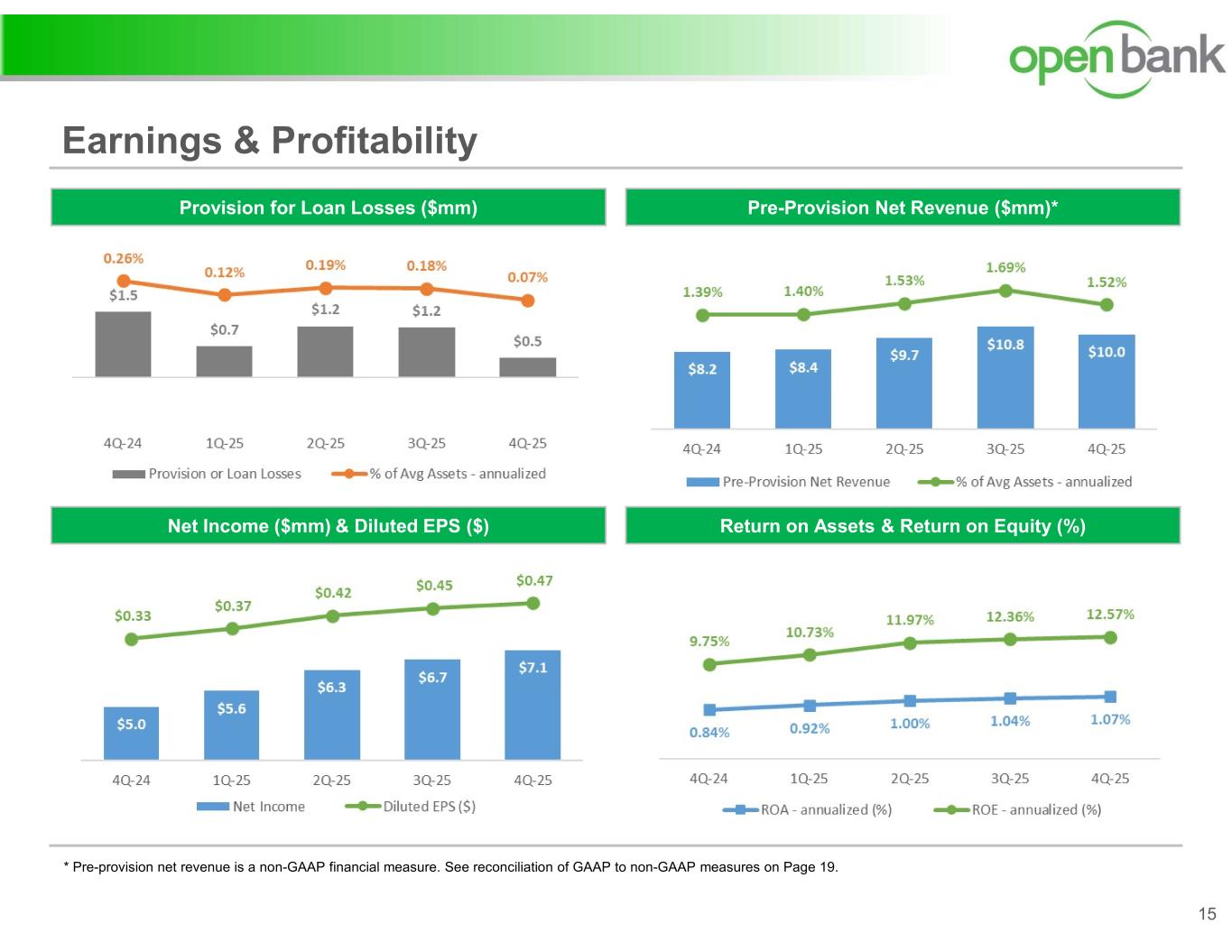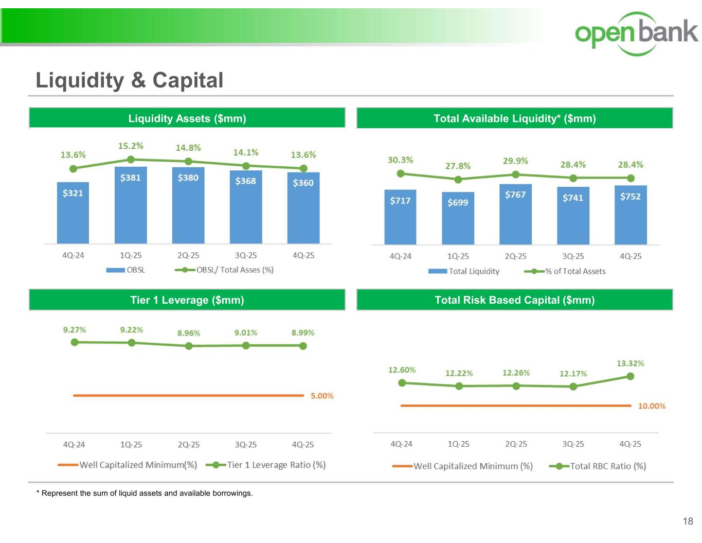 4Q-2025 Highlights vs 3Q-2025 3 (1) Annualized. (2) Excludes the guaranteed portion of SBA loans that are in liquidation. (3) Includes special mention, substandard, doubtful, and loss categories. Net Income $7.0M Earnings & Profitability Balance Sheet Growth Credit Quality Capital Adequacy • Net income of $7.0 million, compared to $6.7 million • Diluted earnings per share of $0.47, compared to $0.45 • ROA(1) and ROE(1) of 1.07% and 12.57%, compared to 1.04% and 12.36%, respectively • Net interest margin of 3.25%, compared to 3.26% • Efficiency ratio of 58.87%, compared to 55.68% • Total assets of $2.65 billion, an 1% increase compared to $2.61 billion • Gross loans of $2.19 billion, a 2% increase compared to $2.15 billion • Total deposits of $2.28 billion, remaining nearly unchanged from $2.27 billion • Net recoveries (charge-offs)(1) to average gross loans of 0.03%, compared to (0.04)% • Nonperforming loans(2) to gross loans of 0.64%, compared to 0.57%. • Criticized loans(2) (3) to gross loans of 1.46%, compared to 1.31% • Remained well-capitalized with a Common Equity Tier 1 (“CET1”) ratio of 10.93% • Book value per common share increased to $15.31, compared to $14.88 • Paid quarterly cash dividend of $0.12 per share for the periods Diluted EPS $0.47 ROA (1) 1.07% ROE (1) 12.57% NIM 3.25% Efficiency 58.87%