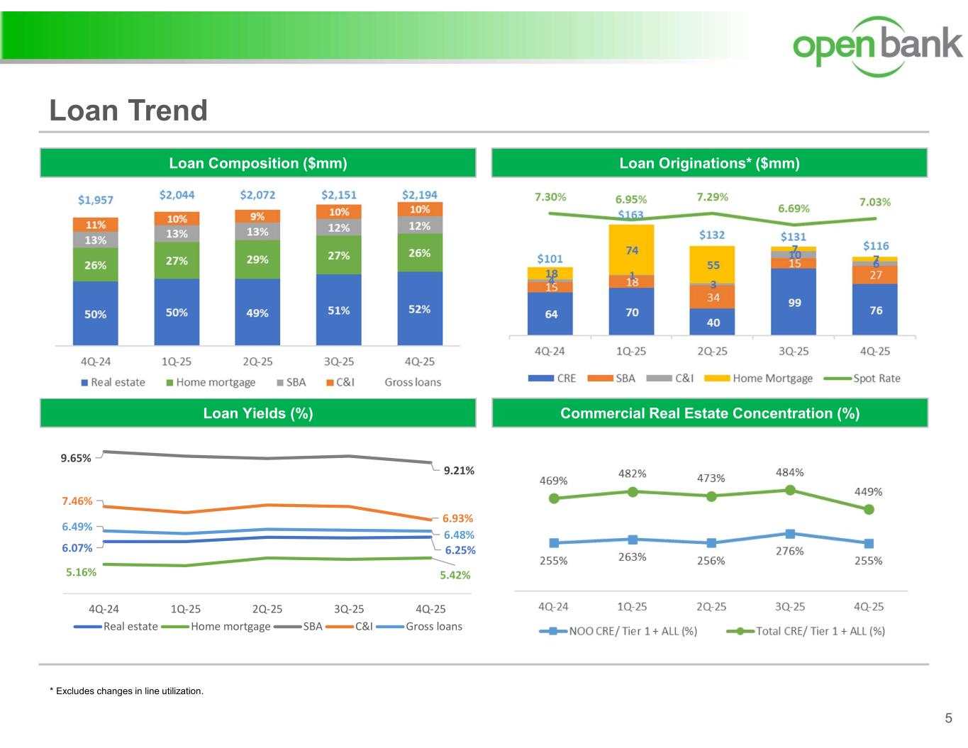 Balance Sheet Trend 4 Gross Loans ($mm)Total Assets ($mm) Total Equity ($mm) & Book Value Per Share ($)Total Deposits ($mm) $1,957 $2,044 $2,072 $2,151 $2,194 5.4% 17.8% 5.4% 15.4% 7.9% 4Q-24 1Q-25 2Q-25 3Q-25 4Q-25 Gross Loans Growth - annualized (%)
