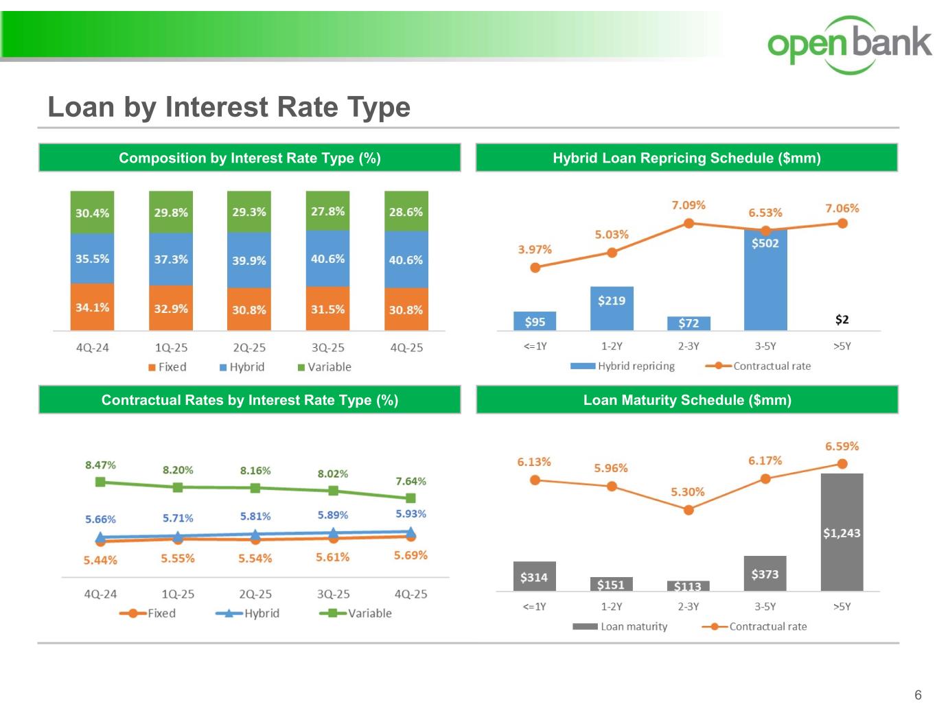 Loan Trend 5 Loan Originations* ($mm)Loan Composition ($mm) Loan Yields (%) Commercial Real Estate Concentration (%) * Excludes changes in line utilization. 6.07% 6.25% 5.16% 5.42% 9.65% 9.21% 7.46% 6.93% 6.49% 6.48% 4Q-24 1Q-25 2Q-25 3Q-25 4Q-25 Real estate Home mortgage SBA C&I Gross loans
