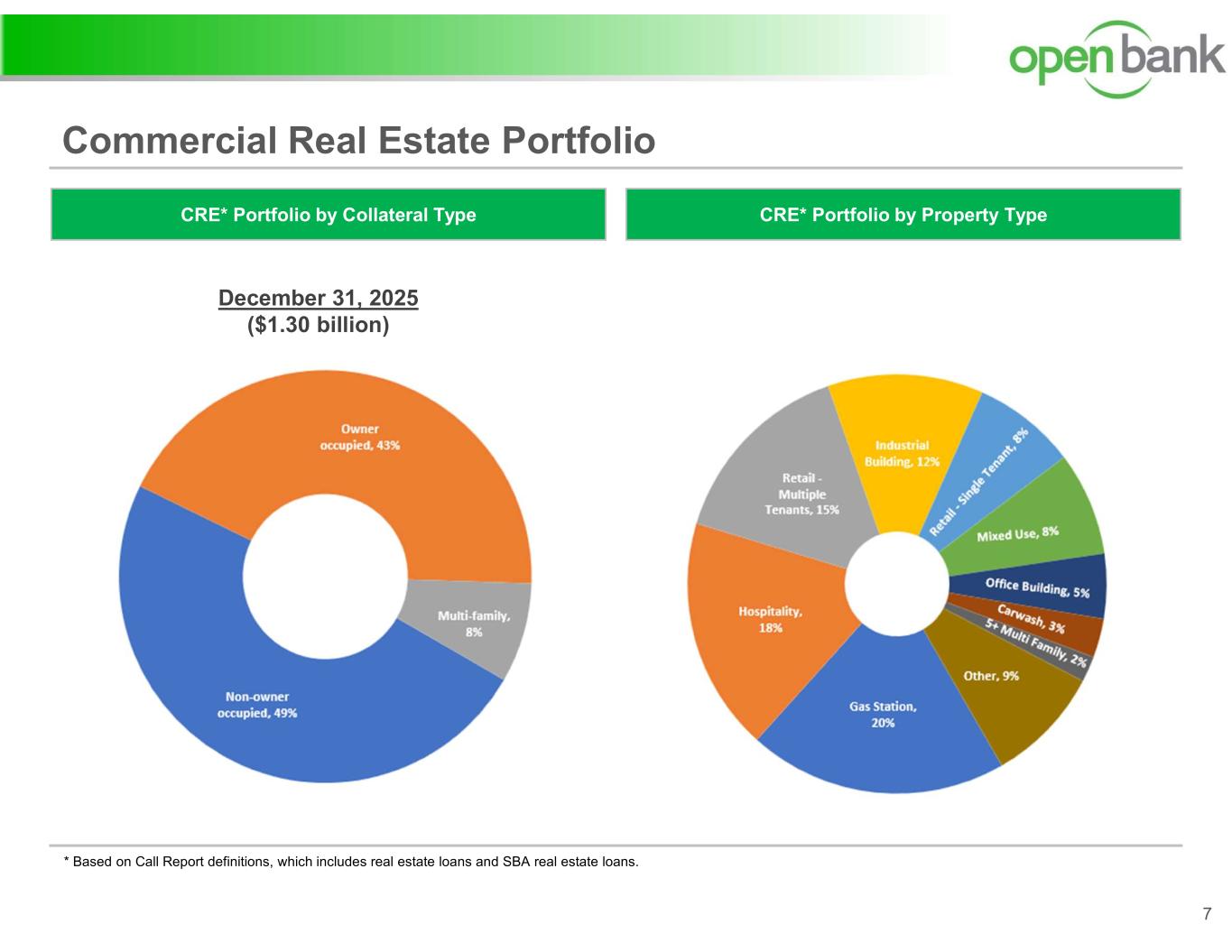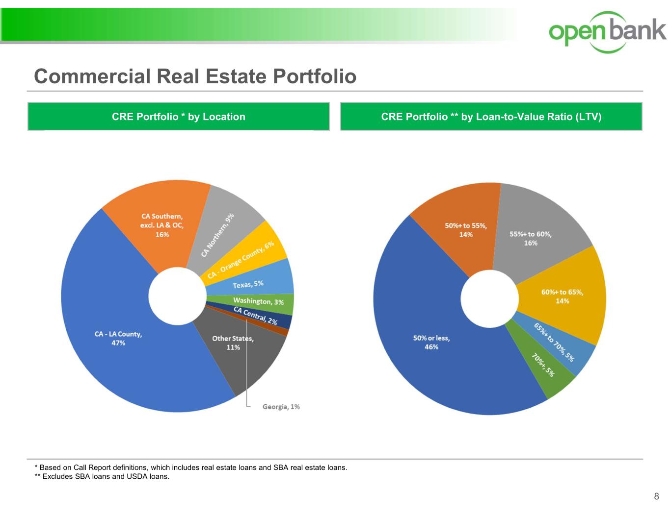 * Based on Call Report definitions, which includes real estate loans and SBA real estate loans. Commercial Real Estate Portfolio 7 CRE* Portfolio by Property TypeCRE* Portfolio by Collateral Type December 31, 2025 ($1.30 billion)
