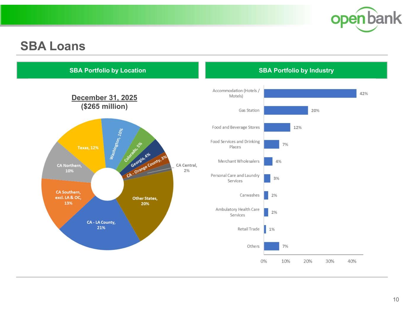 SBA Loans 10 SBA Portfolio by IndustrySBA Portfolio by Location December 31, 2025 ($265 million)