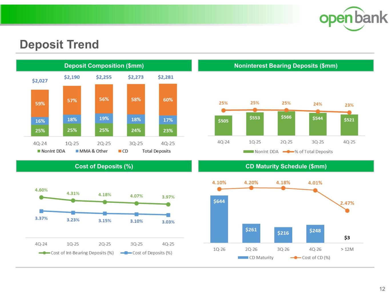 Deposit Trend 12 Noninterest Bearing Deposits ($mm)Deposit Composition ($mm) Cost of Deposits (%) CD Maturity Schedule ($mm)