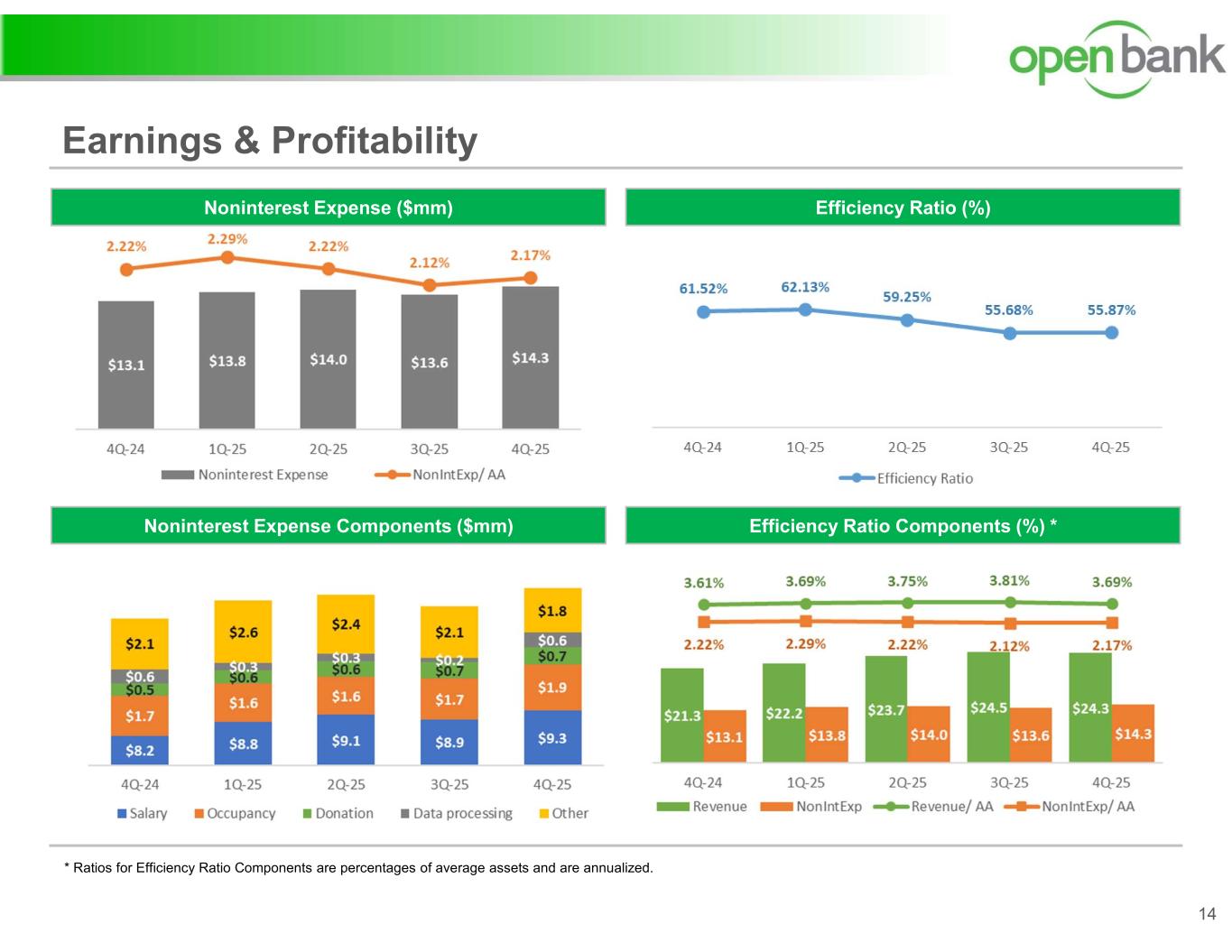 Earnings & Profitability 13 Noninterest Income ($mm)Net Interest Income ($mm) & Net Interest Margin (%) * Interest Income & Interest Expense ($mm) Noninterest Income Components ($mm) * Annualized.