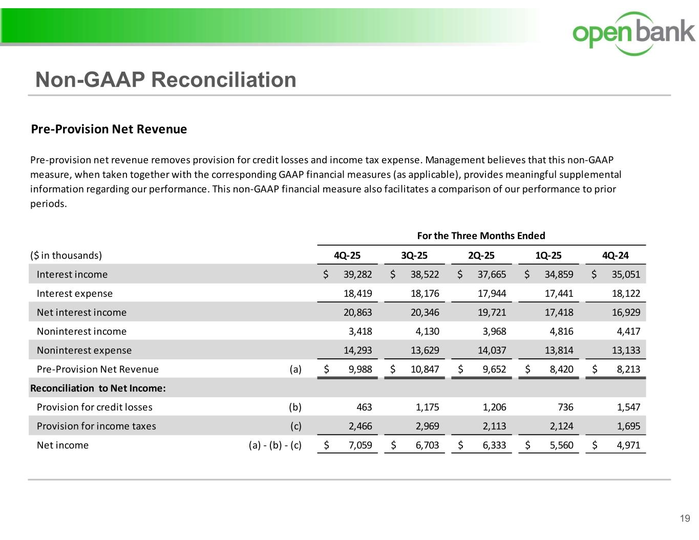 Non-GAAP Reconciliation 19 Pre-Provision Net Revenue ($ in thousands) 4Q-25 3Q-25 2Q-25 1Q-25 4Q-24 Interest income 39,282$ 38,522$ 37,665$ 34,859$ 35,051$ Interest expense 18,419 18,176 17,944 17,441 18,122 Net interest income 20,863 20,346 19,721 17,418 16,929 Noninterest income 3,418 4,130 3,968 4,816 4,417 Noninterest expense 14,293 13,629 14,037 13,814 13,133 Pre-Provision Net Revenue (a) 9,988$ 10,847$ 9,652$ 8,420$ 8,213$ Reconciliation to Net Income: Provision for credit losses (b) 463 1,175 1,206 736 1,547 Provision for income taxes (c) 2,466 2,969 2,113 2,124 1,695 Net income (a) - (b) - (c) 7,059$ 6,703$ 6,333$ 5,560$ 4,971$ For the Three Months Ended Pre-provision net revenue removes provision for credit losses and income tax expense. Management believes that this non-GAAP measure, when taken together with the corresponding GAAP financial measures (as applicable), provides meaningful supplemental information regarding our performance. This non-GAAP financial measure also facilitates a comparison of our performance to prior periods.
