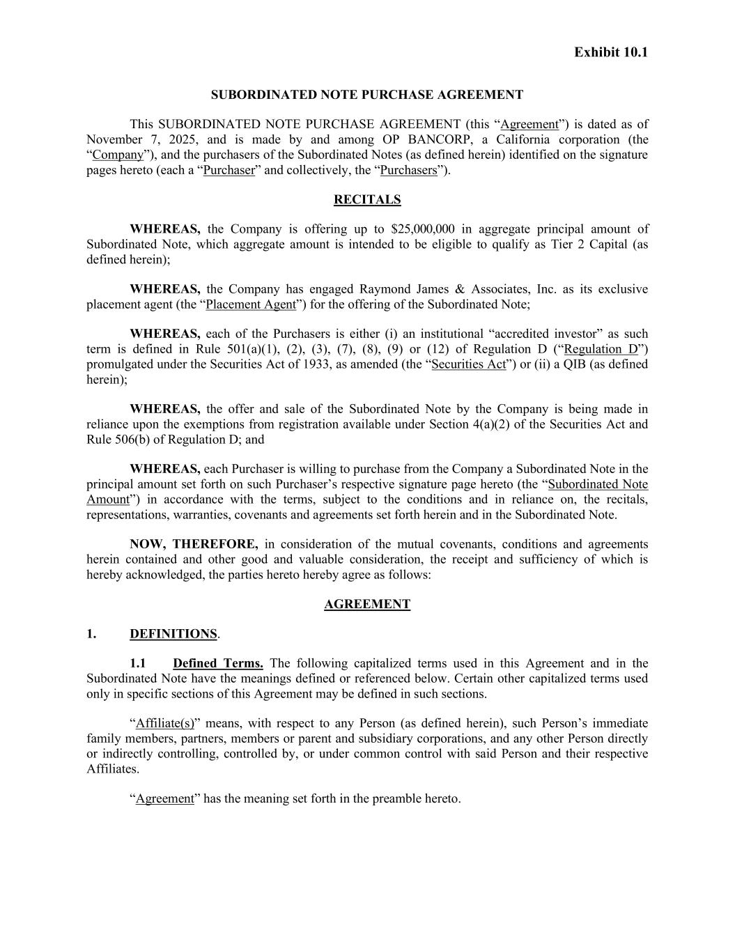 Exhibit 10.1 SUBORDINATED NOTE PURCHASE AGREEMENT This SUBORDINATED NOTE PURCHASE AGREEMENT (this “Agreement”) is dated as of November 7, 2025, and is made by and among OP BANCORP, a California corporation (the “Company”), and the purchasers of the Subordinated Notes (as defined herein) identified on the signature pages hereto (each a “Purchaser” and collectively, the “Purchasers”). RECITALS WHEREAS, the Company is offering up to $25,000,000 in aggregate principal amount of Subordinated Note, which aggregate amount is intended to be eligible to qualify as Tier 2 Capital (as defined herein); WHEREAS, the Company has engaged Raymond James & Associates, Inc. as its exclusive placement agent (the “Placement Agent”) for the offering of the Subordinated Note; WHEREAS, each of the Purchasers is either (i) an institutional “accredited investor” as such term is defined in Rule 501(a)(1), (2), (3), (7), (8), (9) or (12) of Regulation D (“Regulation D”) promulgated under the Securities Act of 1933, as amended (the “Securities Act”) or (ii) a QIB (as defined herein); WHEREAS, the offer and sale of the Subordinated Note by the Company is being made in reliance upon the exemptions from registration available under Section 4(a)(2) of the Securities Act and Rule 506(b) of Regulation D; and WHEREAS, each Purchaser is willing to purchase from the Company a Subordinated Note in the principal amount set forth on such Purchaser’s respective signature page hereto (the “Subordinated Note Amount”) in accordance with the terms, subject to the conditions and in reliance on, the recitals, representations, warranties, covenants and agreements set forth herein and in the Subordinated Note. NOW, THEREFORE, in consideration of the mutual covenants, conditions and agreements herein contained and other good and valuable consideration, the receipt and sufficiency of which is hereby acknowledged, the parties hereto hereby agree as follows: AGREEMENT 1. DEFINITIONS. 1.1 Defined Terms. The following capitalized terms used in this Agreement and in the Subordinated Note have the meanings defined or referenced below. Certain other capitalized terms used only in specific sections of this Agreement may be defined in such sections. “Affiliate(s)” means, with respect to any Person (as defined herein), such Person’s immediate family members, partners, members or parent and subsidiary corporations, and any other Person directly or indirectly controlling, controlled by, or under common control with said Person and their respective Affiliates. “Agreement” has the meaning set forth in the preamble hereto.