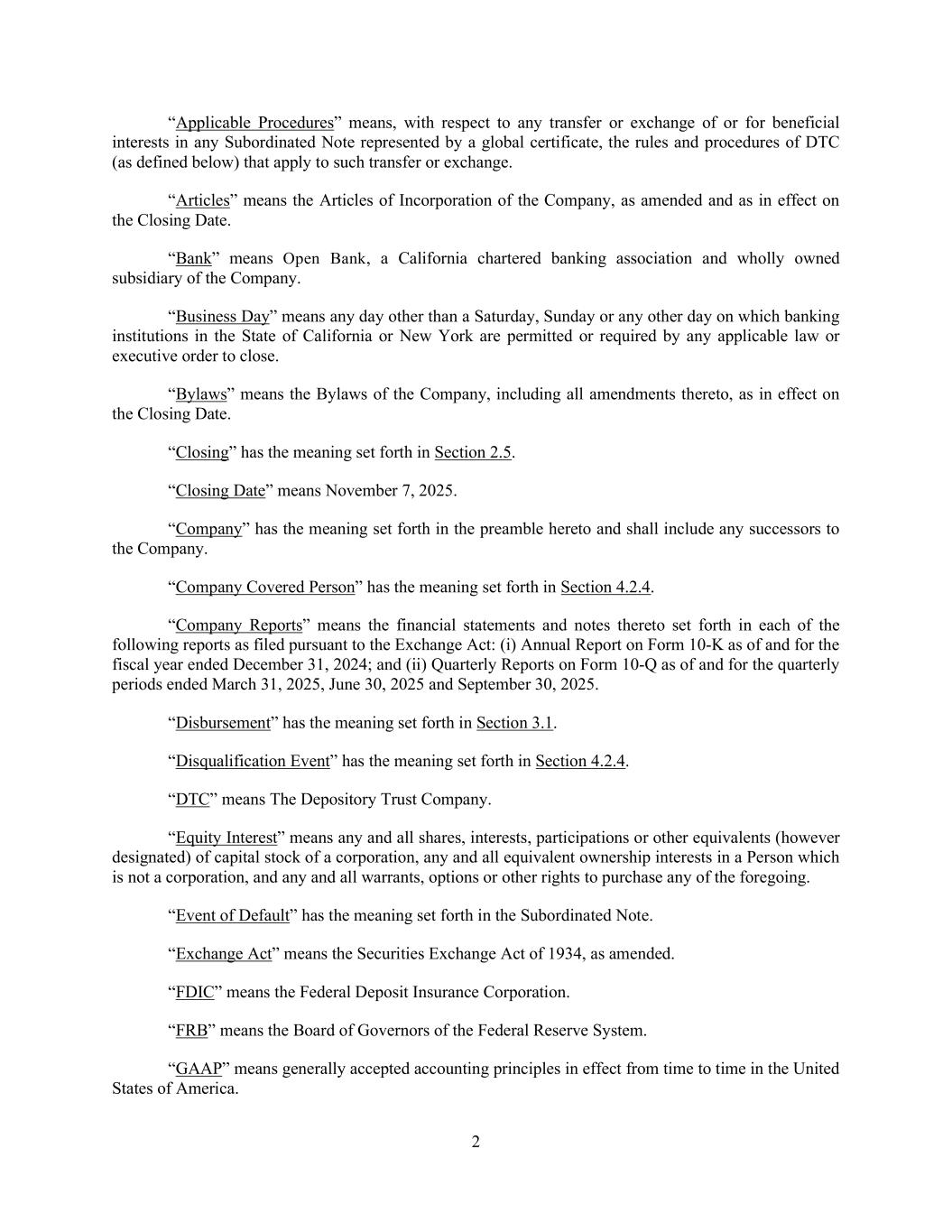2 “Applicable Procedures” means, with respect to any transfer or exchange of or for beneficial interests in any Subordinated Note represented by a global certificate, the rules and procedures of DTC (as defined below) that apply to such transfer or exchange. “Articles” means the Articles of Incorporation of the Company, as amended and as in effect on the Closing Date. “Bank” means Open Bank, a California chartered banking association and wholly owned subsidiary of the Company. “Business Day” means any day other than a Saturday, Sunday or any other day on which banking institutions in the State of California or New York are permitted or required by any applicable law or executive order to close. “Bylaws” means the Bylaws of the Company, including all amendments thereto, as in effect on the Closing Date. “Closing” has the meaning set forth in Section 2.5. “Closing Date” means November 7, 2025. “Company” has the meaning set forth in the preamble hereto and shall include any successors to the Company. “Company Covered Person” has the meaning set forth in Section 4.2.4. “Company Reports” means the financial statements and notes thereto set forth in each of the following reports as filed pursuant to the Exchange Act: (i) Annual Report on Form 10-K as of and for the fiscal year ended December 31, 2024; and (ii) Quarterly Reports on Form 10-Q as of and for the quarterly periods ended March 31, 2025, June 30, 2025 and September 30, 2025. “Disbursement” has the meaning set forth in Section 3.1. “Disqualification Event” has the meaning set forth in Section 4.2.4. “DTC” means The Depository Trust Company. “Equity Interest” means any and all shares, interests, participations or other equivalents (however designated) of capital stock of a corporation, any and all equivalent ownership interests in a Person which is not a corporation, and any and all warrants, options or other rights to purchase any of the foregoing. “Event of Default” has the meaning set forth in the Subordinated Note. “Exchange Act” means the Securities Exchange Act of 1934, as amended. “FDIC” means the Federal Deposit Insurance Corporation. “FRB” means the Board of Governors of the Federal Reserve System. “GAAP” means generally accepted accounting principles in effect from time to time in the United States of America.