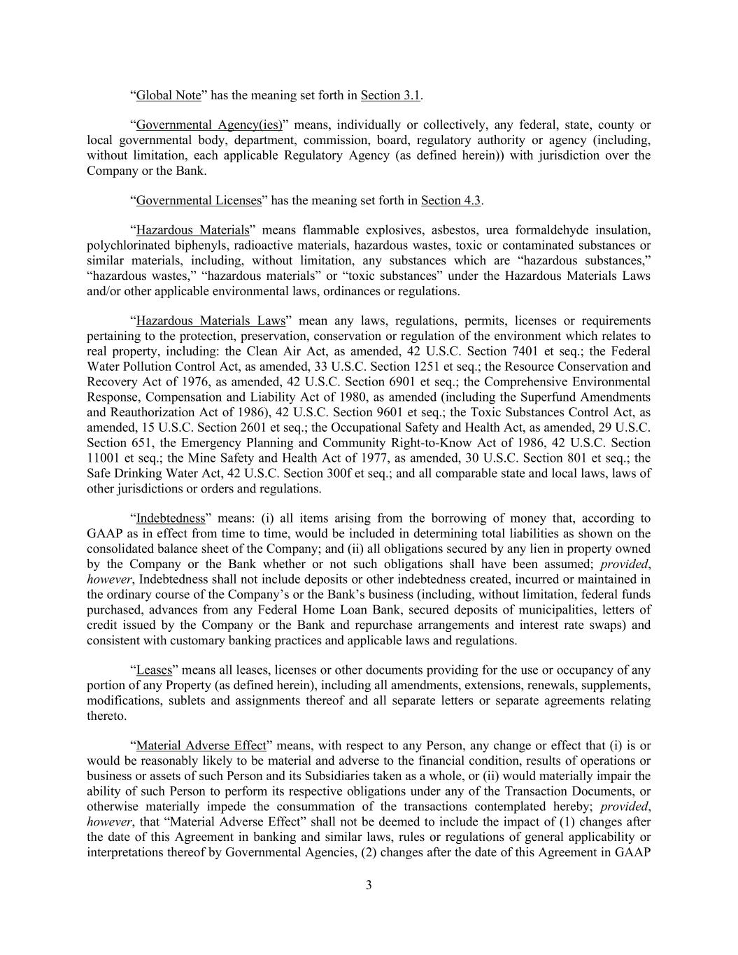 3 “Global Note” has the meaning set forth in Section 3.1. “Governmental Agency(ies)” means, individually or collectively, any federal, state, county or local governmental body, department, commission, board, regulatory authority or agency (including, without limitation, each applicable Regulatory Agency (as defined herein)) with jurisdiction over the Company or the Bank. “Governmental Licenses” has the meaning set forth in Section 4.3. “Hazardous Materials” means flammable explosives, asbestos, urea formaldehyde insulation, polychlorinated biphenyls, radioactive materials, hazardous wastes, toxic or contaminated substances or similar materials, including, without limitation, any substances which are “hazardous substances,” “hazardous wastes,” “hazardous materials” or “toxic substances” under the Hazardous Materials Laws and/or other applicable environmental laws, ordinances or regulations. “Hazardous Materials Laws” mean any laws, regulations, permits, licenses or requirements pertaining to the protection, preservation, conservation or regulation of the environment which relates to real property, including: the Clean Air Act, as amended, 42 U.S.C. Section 7401 et seq.; the Federal Water Pollution Control Act, as amended, 33 U.S.C. Section 1251 et seq.; the Resource Conservation and Recovery Act of 1976, as amended, 42 U.S.C. Section 6901 et seq.; the Comprehensive Environmental Response, Compensation and Liability Act of 1980, as amended (including the Superfund Amendments and Reauthorization Act of 1986), 42 U.S.C. Section 9601 et seq.; the Toxic Substances Control Act, as amended, 15 U.S.C. Section 2601 et seq.; the Occupational Safety and Health Act, as amended, 29 U.S.C. Section 651, the Emergency Planning and Community Right-to-Know Act of 1986, 42 U.S.C. Section 11001 et seq.; the Mine Safety and Health Act of 1977, as amended, 30 U.S.C. Section 801 et seq.; the Safe Drinking Water Act, 42 U.S.C. Section 300f et seq.; and all comparable state and local laws, laws of other jurisdictions or orders and regulations. “Indebtedness” means: (i) all items arising from the borrowing of money that, according to GAAP as in effect from time to time, would be included in determining total liabilities as shown on the consolidated balance sheet of the Company; and (ii) all obligations secured by any lien in property owned by the Company or the Bank whether or not such obligations shall have been assumed; provided, however, Indebtedness shall not include deposits or other indebtedness created, incurred or maintained in the ordinary course of the Company’s or the Bank’s business (including, without limitation, federal funds purchased, advances from any Federal Home Loan Bank, secured deposits of municipalities, letters of credit issued by the Company or the Bank and repurchase arrangements and interest rate swaps) and consistent with customary banking practices and applicable laws and regulations. “Leases” means all leases, licenses or other documents providing for the use or occupancy of any portion of any Property (as defined herein), including all amendments, extensions, renewals, supplements, modifications, sublets and assignments thereof and all separate letters or separate agreements relating thereto. “Material Adverse Effect” means, with respect to any Person, any change or effect that (i) is or would be reasonably likely to be material and adverse to the financial condition, results of operations or business or assets of such Person and its Subsidiaries taken as a whole, or (ii) would materially impair the ability of such Person to perform its respective obligations under any of the Transaction Documents, or otherwise materially impede the consummation of the transactions contemplated hereby; provided, however, that “Material Adverse Effect” shall not be deemed to include the impact of (1) changes after the date of this Agreement in banking and similar laws, rules or regulations of general applicability or interpretations thereof by Governmental Agencies, (2) changes after the date of this Agreement in GAAP
