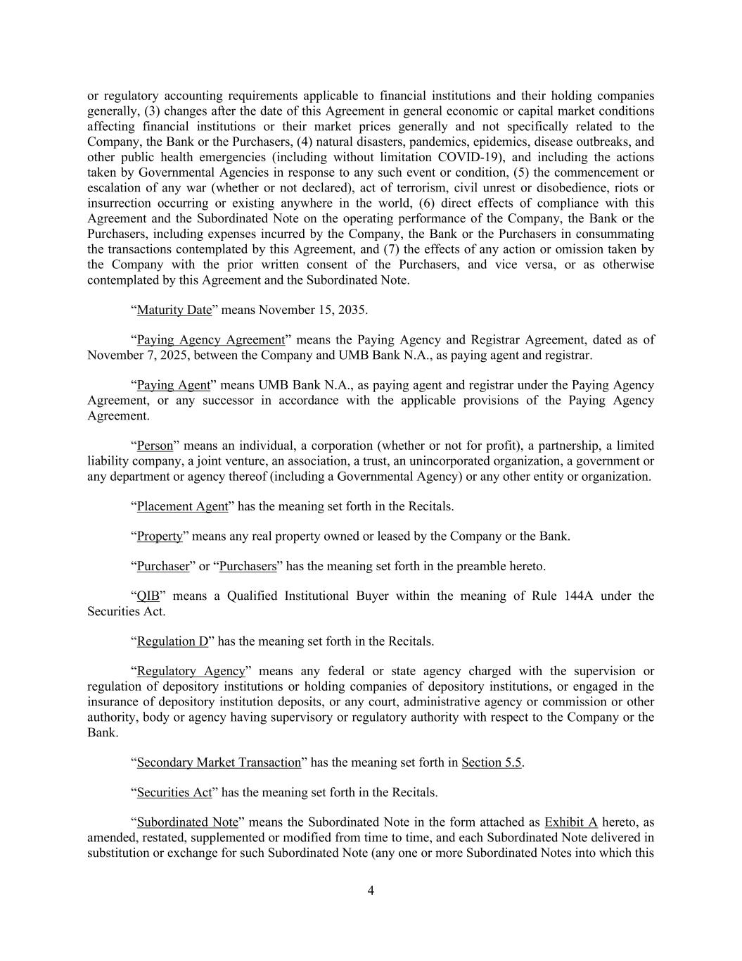 4 or regulatory accounting requirements applicable to financial institutions and their holding companies generally, (3) changes after the date of this Agreement in general economic or capital market conditions affecting financial institutions or their market prices generally and not specifically related to the Company, the Bank or the Purchasers, (4) natural disasters, pandemics, epidemics, disease outbreaks, and other public health emergencies (including without limitation COVID-19), and including the actions taken by Governmental Agencies in response to any such event or condition, (5) the commencement or escalation of any war (whether or not declared), act of terrorism, civil unrest or disobedience, riots or insurrection occurring or existing anywhere in the world, (6) direct effects of compliance with this Agreement and the Subordinated Note on the operating performance of the Company, the Bank or the Purchasers, including expenses incurred by the Company, the Bank or the Purchasers in consummating the transactions contemplated by this Agreement, and (7) the effects of any action or omission taken by the Company with the prior written consent of the Purchasers, and vice versa, or as otherwise contemplated by this Agreement and the Subordinated Note. “Maturity Date” means November 15, 2035. “Paying Agency Agreement” means the Paying Agency and Registrar Agreement, dated as of November 7, 2025, between the Company and UMB Bank N.A., as paying agent and registrar. “Paying Agent” means UMB Bank N.A., as paying agent and registrar under the Paying Agency Agreement, or any successor in accordance with the applicable provisions of the Paying Agency Agreement. “Person” means an individual, a corporation (whether or not for profit), a partnership, a limited liability company, a joint venture, an association, a trust, an unincorporated organization, a government or any department or agency thereof (including a Governmental Agency) or any other entity or organization. “Placement Agent” has the meaning set forth in the Recitals. “Property” means any real property owned or leased by the Company or the Bank. “Purchaser” or “Purchasers” has the meaning set forth in the preamble hereto. “QIB” means a Qualified Institutional Buyer within the meaning of Rule 144A under the Securities Act. “Regulation D” has the meaning set forth in the Recitals. “Regulatory Agency” means any federal or state agency charged with the supervision or regulation of depository institutions or holding companies of depository institutions, or engaged in the insurance of depository institution deposits, or any court, administrative agency or commission or other authority, body or agency having supervisory or regulatory authority with respect to the Company or the Bank. “Secondary Market Transaction” has the meaning set forth in Section 5.5. “Securities Act” has the meaning set forth in the Recitals. “Subordinated Note” means the Subordinated Note in the form attached as Exhibit A hereto, as amended, restated, supplemented or modified from time to time, and each Subordinated Note delivered in substitution or exchange for such Subordinated Note (any one or more Subordinated Notes into which this