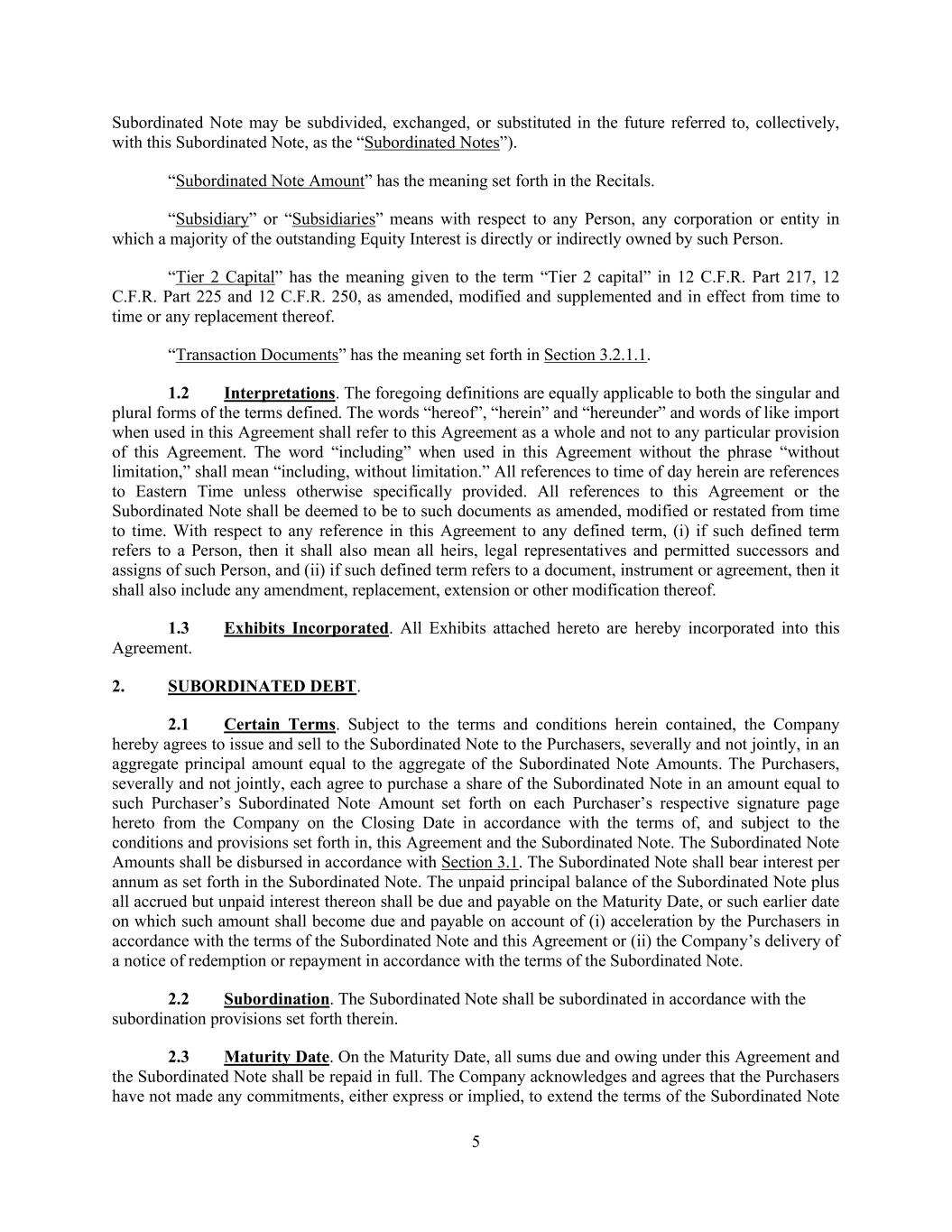 5 Subordinated Note may be subdivided, exchanged, or substituted in the future referred to, collectively, with this Subordinated Note, as the “Subordinated Notes”). “Subordinated Note Amount” has the meaning set forth in the Recitals. “Subsidiary” or “Subsidiaries” means with respect to any Person, any corporation or entity in which a majority of the outstanding Equity Interest is directly or indirectly owned by such Person. “Tier 2 Capital” has the meaning given to the term “Tier 2 capital” in 12 C.F.R. Part 217, 12 C.F.R. Part 225 and 12 C.F.R. 250, as amended, modified and supplemented and in effect from time to time or any replacement thereof. “Transaction Documents” has the meaning set forth in Section 3.2.1.1. 1.2 Interpretations. The foregoing definitions are equally applicable to both the singular and plural forms of the terms defined. The words “hereof”, “herein” and “hereunder” and words of like import when used in this Agreement shall refer to this Agreement as a whole and not to any particular provision of this Agreement. The word “including” when used in this Agreement without the phrase “without limitation,” shall mean “including, without limitation.” All references to time of day herein are references to Eastern Time unless otherwise specifically provided. All references to this Agreement or the Subordinated Note shall be deemed to be to such documents as amended, modified or restated from time to time. With respect to any reference in this Agreement to any defined term, (i) if such defined term refers to a Person, then it shall also mean all heirs, legal representatives and permitted successors and assigns of such Person, and (ii) if such defined term refers to a document, instrument or agreement, then it shall also include any amendment, replacement, extension or other modification thereof. 1.3 Exhibits Incorporated. All Exhibits attached hereto are hereby incorporated into this Agreement. 2. SUBORDINATED DEBT. 2.1 Certain Terms. Subject to the terms and conditions herein contained, the Company hereby agrees to issue and sell to the Subordinated Note to the Purchasers, severally and not jointly, in an aggregate principal amount equal to the aggregate of the Subordinated Note Amounts. The Purchasers, severally and not jointly, each agree to purchase a share of the Subordinated Note in an amount equal to such Purchaser’s Subordinated Note Amount set forth on each Purchaser’s respective signature page hereto from the Company on the Closing Date in accordance with the terms of, and subject to the conditions and provisions set forth in, this Agreement and the Subordinated Note. The Subordinated Note Amounts shall be disbursed in accordance with Section 3.1. The Subordinated Note shall bear interest per annum as set forth in the Subordinated Note. The unpaid principal balance of the Subordinated Note plus all accrued but unpaid interest thereon shall be due and payable on the Maturity Date, or such earlier date on which such amount shall become due and payable on account of (i) acceleration by the Purchasers in accordance with the terms of the Subordinated Note and this Agreement or (ii) the Company’s delivery of a notice of redemption or repayment in accordance with the terms of the Subordinated Note. 2.2 Subordination. The Subordinated Note shall be subordinated in accordance with the subordination provisions set forth therein. 2.3 Maturity Date. On the Maturity Date, all sums due and owing under this Agreement and the Subordinated Note shall be repaid in full. The Company acknowledges and agrees that the Purchasers have not made any commitments, either express or implied, to extend the terms of the Subordinated Note