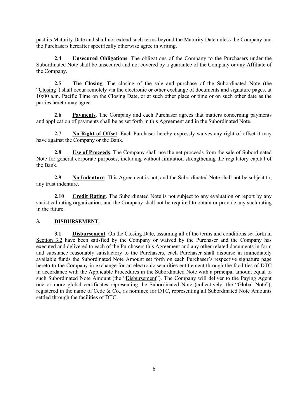 6 past its Maturity Date and shall not extend such terms beyond the Maturity Date unless the Company and the Purchasers hereafter specifically otherwise agree in writing. 2.4 Unsecured Obligations. The obligations of the Company to the Purchasers under the Subordinated Note shall be unsecured and not covered by a guarantee of the Company or any Affiliate of the Company. 2.5 The Closing. The closing of the sale and purchase of the Subordinated Note (the “Closing”) shall occur remotely via the electronic or other exchange of documents and signature pages, at 10:00 a.m. Pacific Time on the Closing Date, or at such other place or time or on such other date as the parties hereto may agree. 2.6 Payments. The Company and each Purchaser agrees that matters concerning payments and application of payments shall be as set forth in this Agreement and in the Subordinated Note. 2.7 No Right of Offset. Each Purchaser hereby expressly waives any right of offset it may have against the Company or the Bank. 2.8 Use of Proceeds. The Company shall use the net proceeds from the sale of Subordinated Note for general corporate purposes, including without limitation strengthening the regulatory capital of the Bank. 2.9 No Indenture. This Agreement is not, and the Subordinated Note shall not be subject to, any trust indenture. 2.10 Credit Rating. The Subordinated Note is not subject to any evaluation or report by any statistical rating organization, and the Company shall not be required to obtain or provide any such rating in the future. 3. DISBURSEMENT. 3.1 Disbursement. On the Closing Date, assuming all of the terms and conditions set forth in Section 3.2 have been satisfied by the Company or waived by the Purchaser and the Company has executed and delivered to each of the Purchasers this Agreement and any other related documents in form and substance reasonably satisfactory to the Purchasers, each Purchaser shall disburse in immediately available funds the Subordinated Note Amount set forth on each Purchaser’s respective signature page hereto to the Company in exchange for an electronic securities entitlement through the facilities of DTC in accordance with the Applicable Procedures in the Subordinated Note with a principal amount equal to such Subordinated Note Amount (the “Disbursement”). The Company will deliver to the Paying Agent one or more global certificates representing the Subordinated Note (collectively, the “Global Note”), registered in the name of Cede & Co., as nominee for DTC, representing all Subordinated Note Amounts settled through the facilities of DTC.
