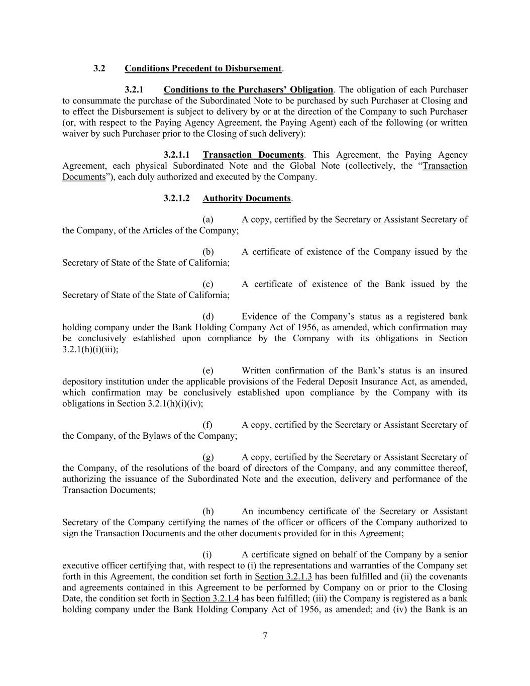 7 3.2 Conditions Precedent to Disbursement. 3.2.1 Conditions to the Purchasers’ Obligation. The obligation of each Purchaser to consummate the purchase of the Subordinated Note to be purchased by such Purchaser at Closing and to effect the Disbursement is subject to delivery by or at the direction of the Company to such Purchaser (or, with respect to the Paying Agency Agreement, the Paying Agent) each of the following (or written waiver by such Purchaser prior to the Closing of such delivery): 3.2.1.1 Transaction Documents. This Agreement, the Paying Agency Agreement, each physical Subordinated Note and the Global Note (collectively, the “Transaction Documents”), each duly authorized and executed by the Company. 3.2.1.2 Authority Documents. (a) A copy, certified by the Secretary or Assistant Secretary of the Company, of the Articles of the Company; (b) A certificate of existence of the Company issued by the Secretary of State of the State of California; (c) A certificate of existence of the Bank issued by the Secretary of State of the State of California; (d) Evidence of the Company’s status as a registered bank holding company under the Bank Holding Company Act of 1956, as amended, which confirmation may be conclusively established upon compliance by the Company with its obligations in Section 3.2.1(h)(i)(iii); (e) Written confirmation of the Bank’s status is an insured depository institution under the applicable provisions of the Federal Deposit Insurance Act, as amended, which confirmation may be conclusively established upon compliance by the Company with its obligations in Section 3.2.1(h)(i)(iv); (f) A copy, certified by the Secretary or Assistant Secretary of the Company, of the Bylaws of the Company; (g) A copy, certified by the Secretary or Assistant Secretary of the Company, of the resolutions of the board of directors of the Company, and any committee thereof, authorizing the issuance of the Subordinated Note and the execution, delivery and performance of the Transaction Documents; (h) An incumbency certificate of the Secretary or Assistant Secretary of the Company certifying the names of the officer or officers of the Company authorized to sign the Transaction Documents and the other documents provided for in this Agreement; (i) A certificate signed on behalf of the Company by a senior executive officer certifying that, with respect to (i) the representations and warranties of the Company set forth in this Agreement, the condition set forth in Section 3.2.1.3 has been fulfilled and (ii) the covenants and agreements contained in this Agreement to be performed by Company on or prior to the Closing Date, the condition set forth in Section 3.2.1.4 has been fulfilled; (iii) the Company is registered as a bank holding company under the Bank Holding Company Act of 1956, as amended; and (iv) the Bank is an