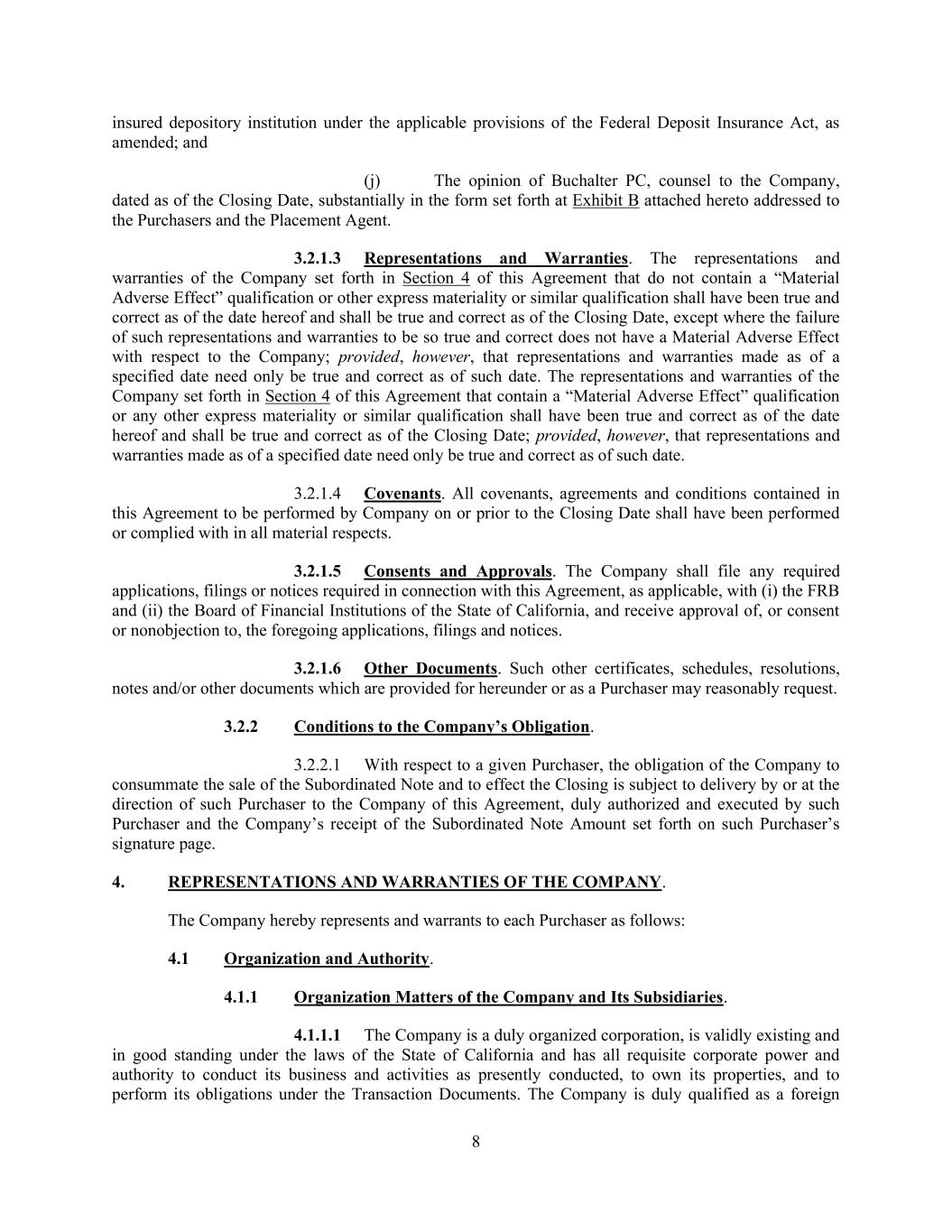 8 insured depository institution under the applicable provisions of the Federal Deposit Insurance Act, as amended; and (j) The opinion of Buchalter PC, counsel to the Company, dated as of the Closing Date, substantially in the form set forth at Exhibit B attached hereto addressed to the Purchasers and the Placement Agent. 3.2.1.3 Representations and Warranties. The representations and warranties of the Company set forth in Section 4 of this Agreement that do not contain a “Material Adverse Effect” qualification or other express materiality or similar qualification shall have been true and correct as of the date hereof and shall be true and correct as of the Closing Date, except where the failure of such representations and warranties to be so true and correct does not have a Material Adverse Effect with respect to the Company; provided, however, that representations and warranties made as of a specified date need only be true and correct as of such date. The representations and warranties of the Company set forth in Section 4 of this Agreement that contain a “Material Adverse Effect” qualification or any other express materiality or similar qualification shall have been true and correct as of the date hereof and shall be true and correct as of the Closing Date; provided, however, that representations and warranties made as of a specified date need only be true and correct as of such date. 3.2.1.4 Covenants. All covenants, agreements and conditions contained in this Agreement to be performed by Company on or prior to the Closing Date shall have been performed or complied with in all material respects. 3.2.1.5 Consents and Approvals. The Company shall file any required applications, filings or notices required in connection with this Agreement, as applicable, with (i) the FRB and (ii) the Board of Financial Institutions of the State of California, and receive approval of, or consent or nonobjection to, the foregoing applications, filings and notices. 3.2.1.6 Other Documents. Such other certificates, schedules, resolutions, notes and/or other documents which are provided for hereunder or as a Purchaser may reasonably request. 3.2.2 Conditions to the Company’s Obligation. 3.2.2.1 With respect to a given Purchaser, the obligation of the Company to consummate the sale of the Subordinated Note and to effect the Closing is subject to delivery by or at the direction of such Purchaser to the Company of this Agreement, duly authorized and executed by such Purchaser and the Company’s receipt of the Subordinated Note Amount set forth on such Purchaser’s signature page. 4. REPRESENTATIONS AND WARRANTIES OF THE COMPANY. The Company hereby represents and warrants to each Purchaser as follows: 4.1 Organization and Authority. 4.1.1 Organization Matters of the Company and Its Subsidiaries. 4.1.1.1 The Company is a duly organized corporation, is validly existing and in good standing under the laws of the State of California and has all requisite corporate power and authority to conduct its business and activities as presently conducted, to own its properties, and to perform its obligations under the Transaction Documents. The Company is duly qualified as a foreign