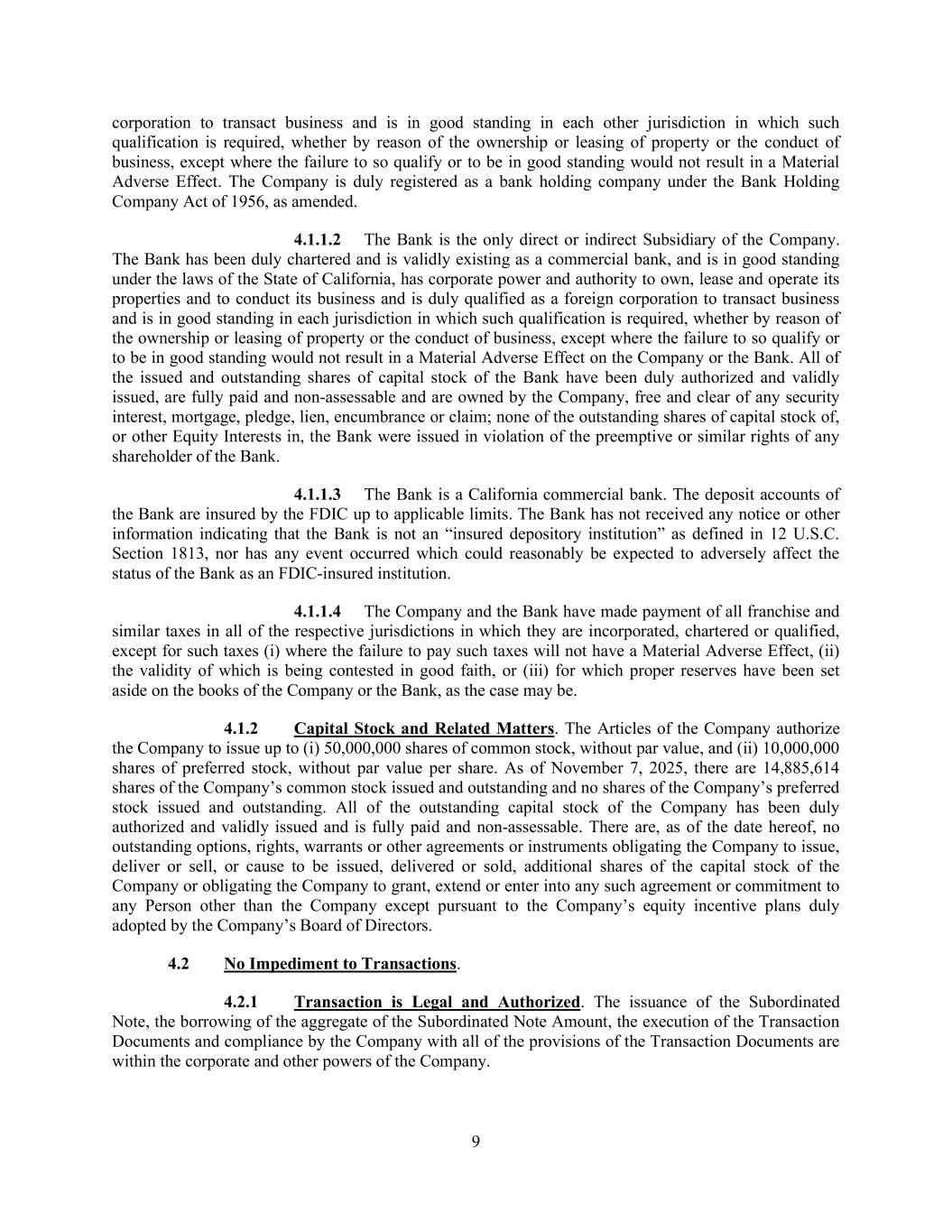 9 corporation to transact business and is in good standing in each other jurisdiction in which such qualification is required, whether by reason of the ownership or leasing of property or the conduct of business, except where the failure to so qualify or to be in good standing would not result in a Material Adverse Effect. The Company is duly registered as a bank holding company under the Bank Holding Company Act of 1956, as amended. 4.1.1.2 The Bank is the only direct or indirect Subsidiary of the Company. The Bank has been duly chartered and is validly existing as a commercial bank, and is in good standing under the laws of the State of California, has corporate power and authority to own, lease and operate its properties and to conduct its business and is duly qualified as a foreign corporation to transact business and is in good standing in each jurisdiction in which such qualification is required, whether by reason of the ownership or leasing of property or the conduct of business, except where the failure to so qualify or to be in good standing would not result in a Material Adverse Effect on the Company or the Bank. All of the issued and outstanding shares of capital stock of the Bank have been duly authorized and validly issued, are fully paid and non-assessable and are owned by the Company, free and clear of any security interest, mortgage, pledge, lien, encumbrance or claim; none of the outstanding shares of capital stock of, or other Equity Interests in, the Bank were issued in violation of the preemptive or similar rights of any shareholder of the Bank. 4.1.1.3 The Bank is a California commercial bank. The deposit accounts of the Bank are insured by the FDIC up to applicable limits. The Bank has not received any notice or other information indicating that the Bank is not an “insured depository institution” as defined in 12 U.S.C. Section 1813, nor has any event occurred which could reasonably be expected to adversely affect the status of the Bank as an FDIC-insured institution. 4.1.1.4 The Company and the Bank have made payment of all franchise and similar taxes in all of the respective jurisdictions in which they are incorporated, chartered or qualified, except for such taxes (i) where the failure to pay such taxes will not have a Material Adverse Effect, (ii) the validity of which is being contested in good faith, or (iii) for which proper reserves have been set aside on the books of the Company or the Bank, as the case may be. 4.1.2 Capital Stock and Related Matters. The Articles of the Company authorize the Company to issue up to (i) 50,000,000 shares of common stock, without par value, and (ii) 10,000,000 shares of preferred stock, without par value per share. As of November 7, 2025, there are 14,885,614 shares of the Company’s common stock issued and outstanding and no shares of the Company’s preferred stock issued and outstanding. All of the outstanding capital stock of the Company has been duly authorized and validly issued and is fully paid and non-assessable. There are, as of the date hereof, no outstanding options, rights, warrants or other agreements or instruments obligating the Company to issue, deliver or sell, or cause to be issued, delivered or sold, additional shares of the capital stock of the Company or obligating the Company to grant, extend or enter into any such agreement or commitment to any Person other than the Company except pursuant to the Company’s equity incentive plans duly adopted by the Company’s Board of Directors. 4.2 No Impediment to Transactions. 4.2.1 Transaction is Legal and Authorized. The issuance of the Subordinated Note, the borrowing of the aggregate of the Subordinated Note Amount, the execution of the Transaction Documents and compliance by the Company with all of the provisions of the Transaction Documents are within the corporate and other powers of the Company.