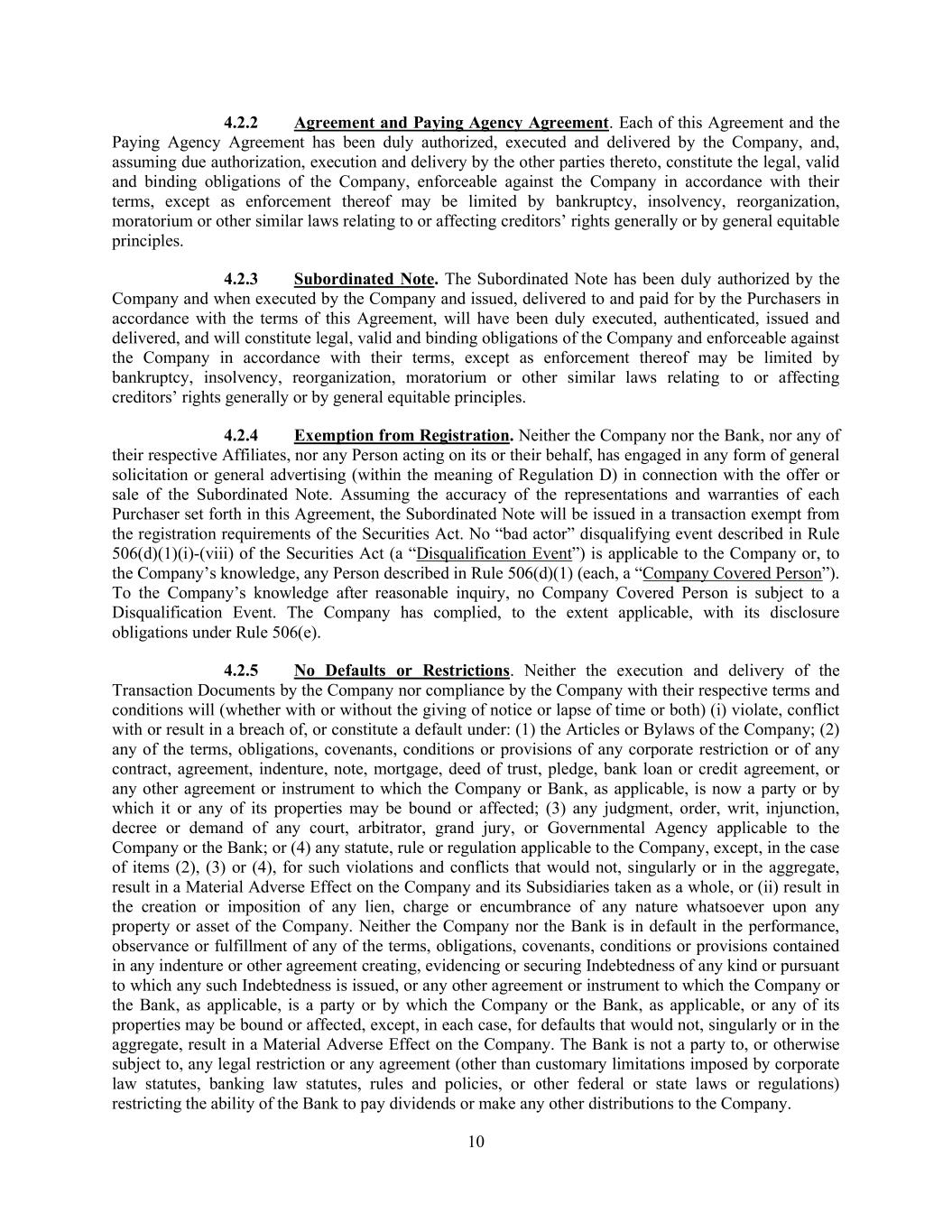 10 4.2.2 Agreement and Paying Agency Agreement. Each of this Agreement and the Paying Agency Agreement has been duly authorized, executed and delivered by the Company, and, assuming due authorization, execution and delivery by the other parties thereto, constitute the legal, valid and binding obligations of the Company, enforceable against the Company in accordance with their terms, except as enforcement thereof may be limited by bankruptcy, insolvency, reorganization, moratorium or other similar laws relating to or affecting creditors’ rights generally or by general equitable principles. 4.2.3 Subordinated Note. The Subordinated Note has been duly authorized by the Company and when executed by the Company and issued, delivered to and paid for by the Purchasers in accordance with the terms of this Agreement, will have been duly executed, authenticated, issued and delivered, and will constitute legal, valid and binding obligations of the Company and enforceable against the Company in accordance with their terms, except as enforcement thereof may be limited by bankruptcy, insolvency, reorganization, moratorium or other similar laws relating to or affecting creditors’ rights generally or by general equitable principles. 4.2.4 Exemption from Registration. Neither the Company nor the Bank, nor any of their respective Affiliates, nor any Person acting on its or their behalf, has engaged in any form of general solicitation or general advertising (within the meaning of Regulation D) in connection with the offer or sale of the Subordinated Note. Assuming the accuracy of the representations and warranties of each Purchaser set forth in this Agreement, the Subordinated Note will be issued in a transaction exempt from the registration requirements of the Securities Act. No “bad actor” disqualifying event described in Rule 506(d)(1)(i)-(viii) of the Securities Act (a “Disqualification Event”) is applicable to the Company or, to the Company’s knowledge, any Person described in Rule 506(d)(1) (each, a “Company Covered Person”). To the Company’s knowledge after reasonable inquiry, no Company Covered Person is subject to a Disqualification Event. The Company has complied, to the extent applicable, with its disclosure obligations under Rule 506(e). 4.2.5 No Defaults or Restrictions. Neither the execution and delivery of the Transaction Documents by the Company nor compliance by the Company with their respective terms and conditions will (whether with or without the giving of notice or lapse of time or both) (i) violate, conflict with or result in a breach of, or constitute a default under: (1) the Articles or Bylaws of the Company; (2) any of the terms, obligations, covenants, conditions or provisions of any corporate restriction or of any contract, agreement, indenture, note, mortgage, deed of trust, pledge, bank loan or credit agreement, or any other agreement or instrument to which the Company or Bank, as applicable, is now a party or by which it or any of its properties may be bound or affected; (3) any judgment, order, writ, injunction, decree or demand of any court, arbitrator, grand jury, or Governmental Agency applicable to the Company or the Bank; or (4) any statute, rule or regulation applicable to the Company, except, in the case of items (2), (3) or (4), for such violations and conflicts that would not, singularly or in the aggregate, result in a Material Adverse Effect on the Company and its Subsidiaries taken as a whole, or (ii) result in the creation or imposition of any lien, charge or encumbrance of any nature whatsoever upon any property or asset of the Company. Neither the Company nor the Bank is in default in the performance, observance or fulfillment of any of the terms, obligations, covenants, conditions or provisions contained in any indenture or other agreement creating, evidencing or securing Indebtedness of any kind or pursuant to which any such Indebtedness is issued, or any other agreement or instrument to which the Company or the Bank, as applicable, is a party or by which the Company or the Bank, as applicable, or any of its properties may be bound or affected, except, in each case, for defaults that would not, singularly or in the aggregate, result in a Material Adverse Effect on the Company. The Bank is not a party to, or otherwise subject to, any legal restriction or any agreement (other than customary limitations imposed by corporate law statutes, banking law statutes, rules and policies, or other federal or state laws or regulations) restricting the ability of the Bank to pay dividends or make any other distributions to the Company.