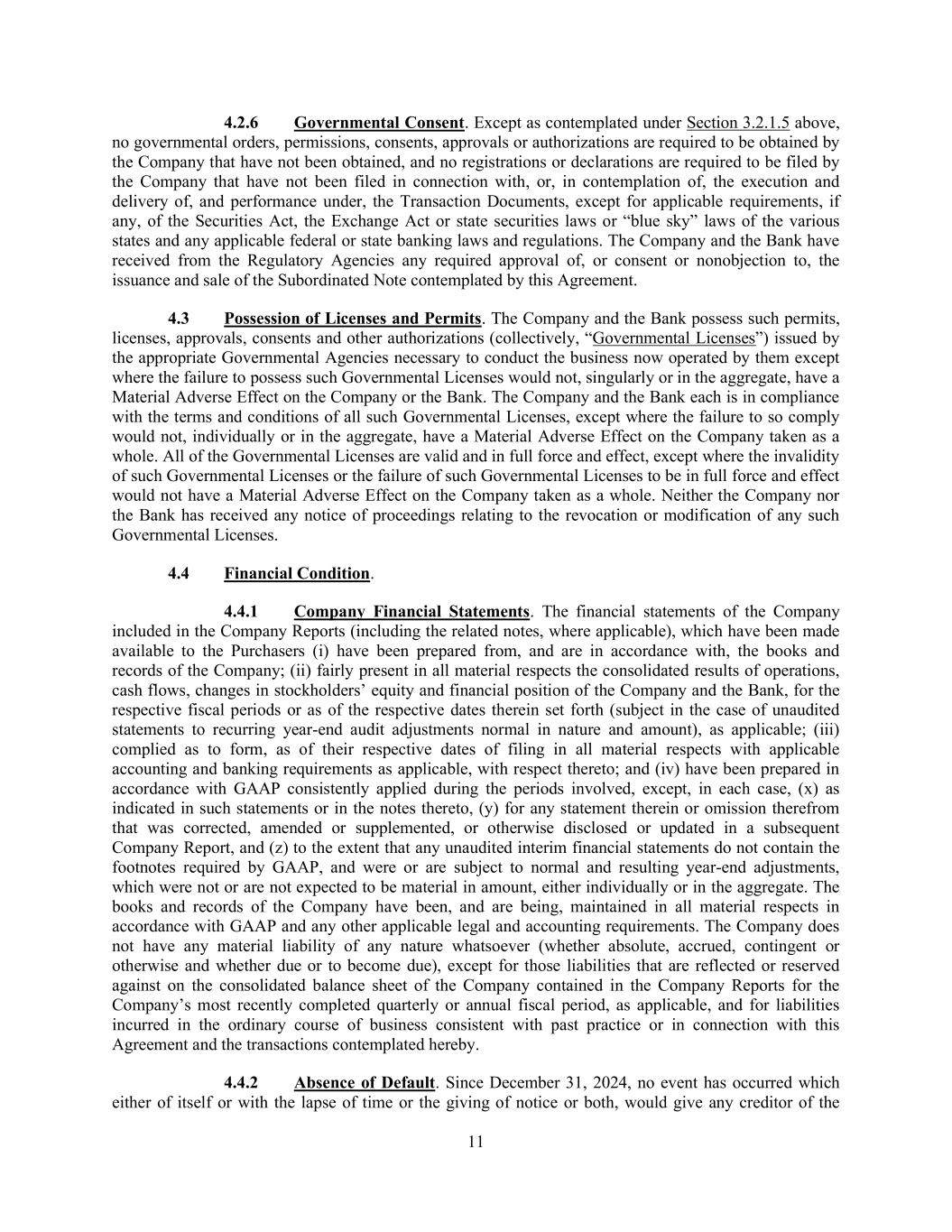 11 4.2.6 Governmental Consent. Except as contemplated under Section 3.2.1.5 above, no governmental orders, permissions, consents, approvals or authorizations are required to be obtained by the Company that have not been obtained, and no registrations or declarations are required to be filed by the Company that have not been filed in connection with, or, in contemplation of, the execution and delivery of, and performance under, the Transaction Documents, except for applicable requirements, if any, of the Securities Act, the Exchange Act or state securities laws or “blue sky” laws of the various states and any applicable federal or state banking laws and regulations. The Company and the Bank have received from the Regulatory Agencies any required approval of, or consent or nonobjection to, the issuance and sale of the Subordinated Note contemplated by this Agreement. 4.3 Possession of Licenses and Permits. The Company and the Bank possess such permits, licenses, approvals, consents and other authorizations (collectively, “Governmental Licenses”) issued by the appropriate Governmental Agencies necessary to conduct the business now operated by them except where the failure to possess such Governmental Licenses would not, singularly or in the aggregate, have a Material Adverse Effect on the Company or the Bank. The Company and the Bank each is in compliance with the terms and conditions of all such Governmental Licenses, except where the failure to so comply would not, individually or in the aggregate, have a Material Adverse Effect on the Company taken as a whole. All of the Governmental Licenses are valid and in full force and effect, except where the invalidity of such Governmental Licenses or the failure of such Governmental Licenses to be in full force and effect would not have a Material Adverse Effect on the Company taken as a whole. Neither the Company nor the Bank has received any notice of proceedings relating to the revocation or modification of any such Governmental Licenses. 4.4 Financial Condition. 4.4.1 Company Financial Statements. The financial statements of the Company included in the Company Reports (including the related notes, where applicable), which have been made available to the Purchasers (i) have been prepared from, and are in accordance with, the books and records of the Company; (ii) fairly present in all material respects the consolidated results of operations, cash flows, changes in stockholders’ equity and financial position of the Company and the Bank, for the respective fiscal periods or as of the respective dates therein set forth (subject in the case of unaudited statements to recurring year-end audit adjustments normal in nature and amount), as applicable; (iii) complied as to form, as of their respective dates of filing in all material respects with applicable accounting and banking requirements as applicable, with respect thereto; and (iv) have been prepared in accordance with GAAP consistently applied during the periods involved, except, in each case, (x) as indicated in such statements or in the notes thereto, (y) for any statement therein or omission therefrom that was corrected, amended or supplemented, or otherwise disclosed or updated in a subsequent Company Report, and (z) to the extent that any unaudited interim financial statements do not contain the footnotes required by GAAP, and were or are subject to normal and resulting year-end adjustments, which were not or are not expected to be material in amount, either individually or in the aggregate. The books and records of the Company have been, and are being, maintained in all material respects in accordance with GAAP and any other applicable legal and accounting requirements. The Company does not have any material liability of any nature whatsoever (whether absolute, accrued, contingent or otherwise and whether due or to become due), except for those liabilities that are reflected or reserved against on the consolidated balance sheet of the Company contained in the Company Reports for the Company’s most recently completed quarterly or annual fiscal period, as applicable, and for liabilities incurred in the ordinary course of business consistent with past practice or in connection with this Agreement and the transactions contemplated hereby. 4.4.2 Absence of Default. Since December 31, 2024, no event has occurred which either of itself or with the lapse of time or the giving of notice or both, would give any creditor of the