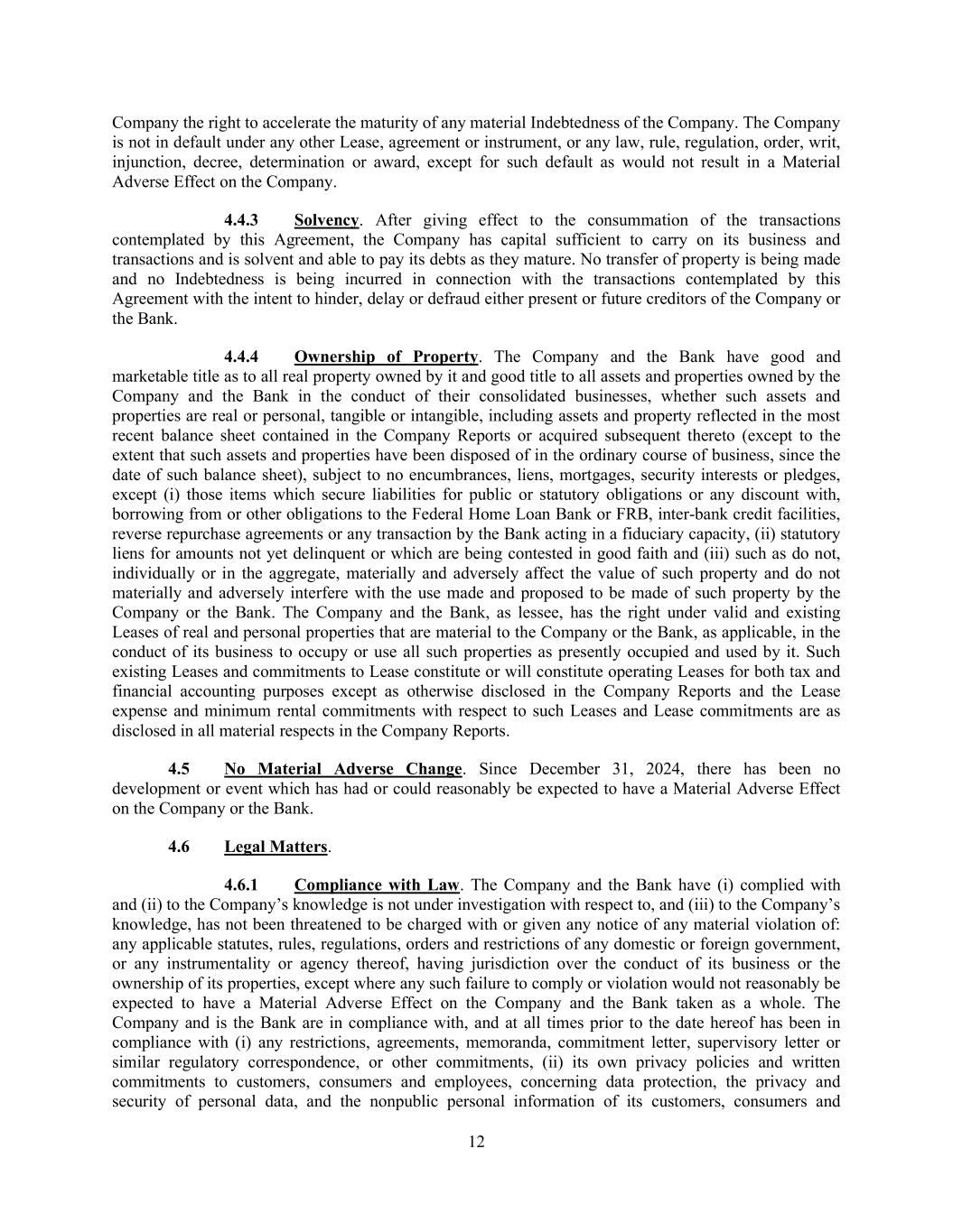 12 Company the right to accelerate the maturity of any material Indebtedness of the Company. The Company is not in default under any other Lease, agreement or instrument, or any law, rule, regulation, order, writ, injunction, decree, determination or award, except for such default as would not result in a Material Adverse Effect on the Company. 4.4.3 Solvency. After giving effect to the consummation of the transactions contemplated by this Agreement, the Company has capital sufficient to carry on its business and transactions and is solvent and able to pay its debts as they mature. No transfer of property is being made and no Indebtedness is being incurred in connection with the transactions contemplated by this Agreement with the intent to hinder, delay or defraud either present or future creditors of the Company or the Bank. 4.4.4 Ownership of Property. The Company and the Bank have good and marketable title as to all real property owned by it and good title to all assets and properties owned by the Company and the Bank in the conduct of their consolidated businesses, whether such assets and properties are real or personal, tangible or intangible, including assets and property reflected in the most recent balance sheet contained in the Company Reports or acquired subsequent thereto (except to the extent that such assets and properties have been disposed of in the ordinary course of business, since the date of such balance sheet), subject to no encumbrances, liens, mortgages, security interests or pledges, except (i) those items which secure liabilities for public or statutory obligations or any discount with, borrowing from or other obligations to the Federal Home Loan Bank or FRB, inter-bank credit facilities, reverse repurchase agreements or any transaction by the Bank acting in a fiduciary capacity, (ii) statutory liens for amounts not yet delinquent or which are being contested in good faith and (iii) such as do not, individually or in the aggregate, materially and adversely affect the value of such property and do not materially and adversely interfere with the use made and proposed to be made of such property by the Company or the Bank. The Company and the Bank, as lessee, has the right under valid and existing Leases of real and personal properties that are material to the Company or the Bank, as applicable, in the conduct of its business to occupy or use all such properties as presently occupied and used by it. Such existing Leases and commitments to Lease constitute or will constitute operating Leases for both tax and financial accounting purposes except as otherwise disclosed in the Company Reports and the Lease expense and minimum rental commitments with respect to such Leases and Lease commitments are as disclosed in all material respects in the Company Reports. 4.5 No Material Adverse Change. Since December 31, 2024, there has been no development or event which has had or could reasonably be expected to have a Material Adverse Effect on the Company or the Bank. 4.6 Legal Matters. 4.6.1 Compliance with Law. The Company and the Bank have (i) complied with and (ii) to the Company’s knowledge is not under investigation with respect to, and (iii) to the Company’s knowledge, has not been threatened to be charged with or given any notice of any material violation of: any applicable statutes, rules, regulations, orders and restrictions of any domestic or foreign government, or any instrumentality or agency thereof, having jurisdiction over the conduct of its business or the ownership of its properties, except where any such failure to comply or violation would not reasonably be expected to have a Material Adverse Effect on the Company and the Bank taken as a whole. The Company and is the Bank are in compliance with, and at all times prior to the date hereof has been in compliance with (i) any restrictions, agreements, memoranda, commitment letter, supervisory letter or similar regulatory correspondence, or other commitments, (ii) its own privacy policies and written commitments to customers, consumers and employees, concerning data protection, the privacy and security of personal data, and the nonpublic personal information of its customers, consumers and
