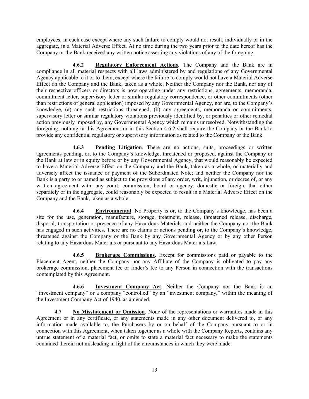 13 employees, in each case except where any such failure to comply would not result, individually or in the aggregate, in a Material Adverse Effect. At no time during the two years prior to the date hereof has the Company or the Bank received any written notice asserting any violations of any of the foregoing. 4.6.2 Regulatory Enforcement Actions. The Company and the Bank are in compliance in all material respects with all laws administered by and regulations of any Governmental Agency applicable to it or to them, except where the failure to comply would not have a Material Adverse Effect on the Company and the Bank, taken as a whole. Neither the Company nor the Bank, nor any of their respective officers or directors is now operating under any restrictions, agreements, memoranda, commitment letter, supervisory letter or similar regulatory correspondence, or other commitments (other than restrictions of general application) imposed by any Governmental Agency, nor are, to the Company’s knowledge, (a) any such restrictions threatened, (b) any agreements, memoranda or commitments, supervisory letter or similar regulatory violations previously identified by, or penalties or other remedial action previously imposed by, any Governmental Agency which remains unresolved. Notwithstanding the foregoing, nothing in this Agreement or in this Section 4.6.2 shall require the Company or the Bank to provide any confidential regulatory or supervisory information as related to the Company or the Bank. 4.6.3 Pending Litigation. There are no actions, suits, proceedings or written agreements pending, or, to the Company’s knowledge, threatened or proposed, against the Company or the Bank at law or in equity before or by any Governmental Agency, that would reasonably be expected to have a Material Adverse Effect on the Company and the Bank, taken as a whole, or materially and adversely affect the issuance or payment of the Subordinated Note; and neither the Company nor the Bank is a party to or named as subject to the provisions of any order, writ, injunction, or decree of, or any written agreement with, any court, commission, board or agency, domestic or foreign, that either separately or in the aggregate, could reasonably be expected to result in a Material Adverse Effect on the Company and the Bank, taken as a whole. 4.6.4 Environmental. No Property is or, to the Company’s knowledge, has been a site for the use, generation, manufacture, storage, treatment, release, threatened release, discharge, disposal, transportation or presence of any Hazardous Materials and neither the Company nor the Bank has engaged in such activities. There are no claims or actions pending or, to the Company’s knowledge, threatened against the Company or the Bank by any Governmental Agency or by any other Person relating to any Hazardous Materials or pursuant to any Hazardous Materials Law. 4.6.5 Brokerage Commissions. Except for commissions paid or payable to the Placement Agent, neither the Company nor any Affiliate of the Company is obligated to pay any brokerage commission, placement fee or finder’s fee to any Person in connection with the transactions contemplated by this Agreement. 4.6.6 Investment Company Act. Neither the Company nor the Bank is an “investment company” or a company “controlled” by an “investment company,” within the meaning of the Investment Company Act of 1940, as amended. 4.7 No Misstatement or Omission. None of the representations or warranties made in this Agreement or in any certificate, or any statements made in any other document delivered to, or any information made available to, the Purchasers by or on behalf of the Company pursuant to or in connection with this Agreement, when taken together as a whole with the Company Reports, contains any untrue statement of a material fact, or omits to state a material fact necessary to make the statements contained therein not misleading in light of the circumstances in which they were made.