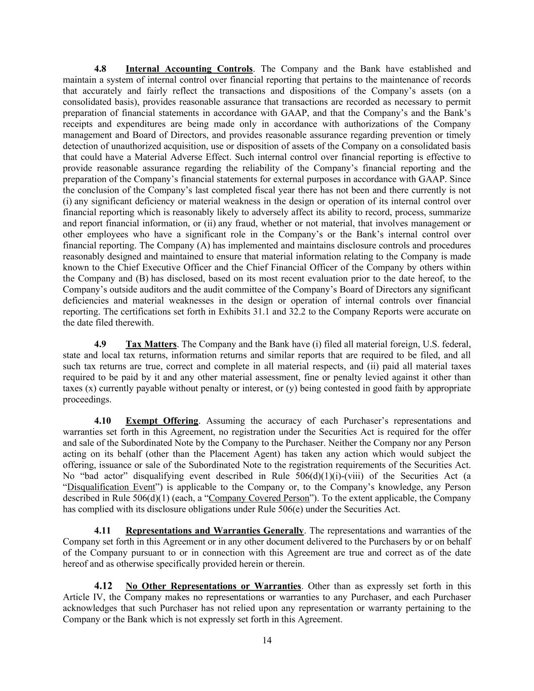 14 4.8 Internal Accounting Controls. The Company and the Bank have established and maintain a system of internal control over financial reporting that pertains to the maintenance of records that accurately and fairly reflect the transactions and dispositions of the Company’s assets (on a consolidated basis), provides reasonable assurance that transactions are recorded as necessary to permit preparation of financial statements in accordance with GAAP, and that the Company’s and the Bank’s receipts and expenditures are being made only in accordance with authorizations of the Company management and Board of Directors, and provides reasonable assurance regarding prevention or timely detection of unauthorized acquisition, use or disposition of assets of the Company on a consolidated basis that could have a Material Adverse Effect. Such internal control over financial reporting is effective to provide reasonable assurance regarding the reliability of the Company’s financial reporting and the preparation of the Company’s financial statements for external purposes in accordance with GAAP. Since the conclusion of the Company’s last completed fiscal year there has not been and there currently is not (i) any significant deficiency or material weakness in the design or operation of its internal control over financial reporting which is reasonably likely to adversely affect its ability to record, process, summarize and report financial information, or (ii) any fraud, whether or not material, that involves management or other employees who have a significant role in the Company’s or the Bank’s internal control over financial reporting. The Company (A) has implemented and maintains disclosure controls and procedures reasonably designed and maintained to ensure that material information relating to the Company is made known to the Chief Executive Officer and the Chief Financial Officer of the Company by others within the Company and (B) has disclosed, based on its most recent evaluation prior to the date hereof, to the Company’s outside auditors and the audit committee of the Company’s Board of Directors any significant deficiencies and material weaknesses in the design or operation of internal controls over financial reporting. The certifications set forth in Exhibits 31.1 and 32.2 to the Company Reports were accurate on the date filed therewith. 4.9 Tax Matters. The Company and the Bank have (i) filed all material foreign, U.S. federal, state and local tax returns, information returns and similar reports that are required to be filed, and all such tax returns are true, correct and complete in all material respects, and (ii) paid all material taxes required to be paid by it and any other material assessment, fine or penalty levied against it other than taxes (x) currently payable without penalty or interest, or (y) being contested in good faith by appropriate proceedings. 4.10 Exempt Offering. Assuming the accuracy of each Purchaser’s representations and warranties set forth in this Agreement, no registration under the Securities Act is required for the offer and sale of the Subordinated Note by the Company to the Purchaser. Neither the Company nor any Person acting on its behalf (other than the Placement Agent) has taken any action which would subject the offering, issuance or sale of the Subordinated Note to the registration requirements of the Securities Act. No “bad actor” disqualifying event described in Rule 506(d)(1)(i)-(viii) of the Securities Act (a “Disqualification Event”) is applicable to the Company or, to the Company’s knowledge, any Person described in Rule 506(d)(1) (each, a “Company Covered Person”). To the extent applicable, the Company has complied with its disclosure obligations under Rule 506(e) under the Securities Act. 4.11 Representations and Warranties Generally. The representations and warranties of the Company set forth in this Agreement or in any other document delivered to the Purchasers by or on behalf of the Company pursuant to or in connection with this Agreement are true and correct as of the date hereof and as otherwise specifically provided herein or therein. 4.12 No Other Representations or Warranties. Other than as expressly set forth in this Article IV, the Company makes no representations or warranties to any Purchaser, and each Purchaser acknowledges that such Purchaser has not relied upon any representation or warranty pertaining to the Company or the Bank which is not expressly set forth in this Agreement.