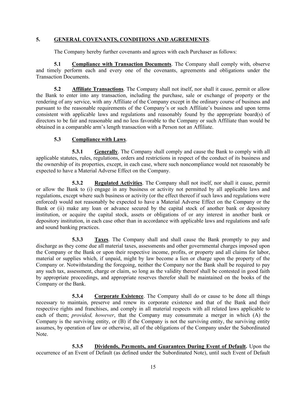 15 5. GENERAL COVENANTS, CONDITIONS AND AGREEMENTS. The Company hereby further covenants and agrees with each Purchaser as follows: 5.1 Compliance with Transaction Documents. The Company shall comply with, observe and timely perform each and every one of the covenants, agreements and obligations under the Transaction Documents. 5.2 Affiliate Transactions. The Company shall not itself, nor shall it cause, permit or allow the Bank to enter into any transaction, including the purchase, sale or exchange of property or the rendering of any service, with any Affiliate of the Company except in the ordinary course of business and pursuant to the reasonable requirements of the Company’s or such Affiliate’s business and upon terms consistent with applicable laws and regulations and reasonably found by the appropriate board(s) of directors to be fair and reasonable and no less favorable to the Company or such Affiliate than would be obtained in a comparable arm’s length transaction with a Person not an Affiliate. 5.3 Compliance with Laws. 5.3.1 Generally. The Company shall comply and cause the Bank to comply with all applicable statutes, rules, regulations, orders and restrictions in respect of the conduct of its business and the ownership of its properties, except, in each case, where such noncompliance would not reasonably be expected to have a Material Adverse Effect on the Company. 5.3.2 Regulated Activities. The Company shall not itself, nor shall it cause, permit or allow the Bank to (i) engage in any business or activity not permitted by all applicable laws and regulations, except where such business or activity (or the effect thereof if such laws and regulations were enforced) would not reasonably be expected to have a Material Adverse Effect on the Company or the Bank or (ii) make any loan or advance secured by the capital stock of another bank or depository institution, or acquire the capital stock, assets or obligations of or any interest in another bank or depository institution, in each case other than in accordance with applicable laws and regulations and safe and sound banking practices. 5.3.3 Taxes. The Company shall and shall cause the Bank promptly to pay and discharge as they come due all material taxes, assessments and other governmental charges imposed upon the Company or the Bank or upon their respective income, profits, or property and all claims for labor, material or supplies which, if unpaid, might by law become a lien or charge upon the property of the Company or. Notwithstanding the foregoing, neither the Company nor the Bank shall be required to pay any such tax, assessment, charge or claim, so long as the validity thereof shall be contested in good faith by appropriate proceedings, and appropriate reserves therefor shall be maintained on the books of the Company or the Bank. 5.3.4 Corporate Existence. The Company shall do or cause to be done all things necessary to maintain, preserve and renew its corporate existence and that of the Bank and their respective rights and franchises, and comply in all material respects with all related laws applicable to each of them; provided, however, that the Company may consummate a merger in which (A) the Company is the surviving entity, or (B) if the Company is not the surviving entity, the surviving entity assumes, by operation of law or otherwise, all of the obligations of the Company under the Subordinated Note. 5.3.5 Dividends, Payments, and Guarantees During Event of Default. Upon the occurrence of an Event of Default (as defined under the Subordinated Note), until such Event of Default