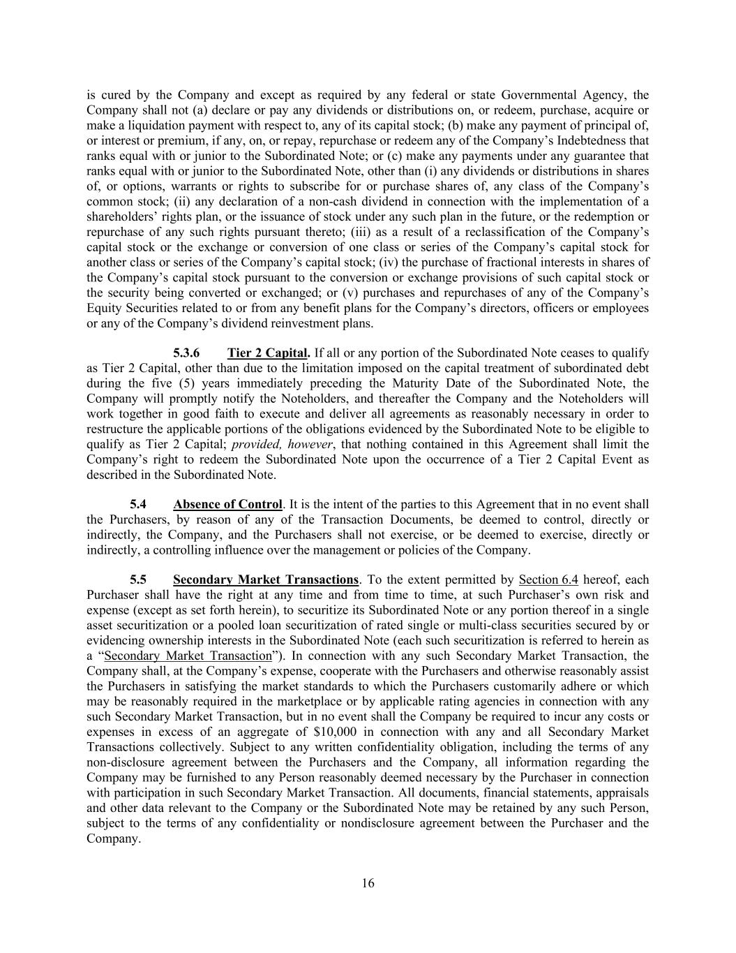 16 is cured by the Company and except as required by any federal or state Governmental Agency, the Company shall not (a) declare or pay any dividends or distributions on, or redeem, purchase, acquire or make a liquidation payment with respect to, any of its capital stock; (b) make any payment of principal of, or interest or premium, if any, on, or repay, repurchase or redeem any of the Company’s Indebtedness that ranks equal with or junior to the Subordinated Note; or (c) make any payments under any guarantee that ranks equal with or junior to the Subordinated Note, other than (i) any dividends or distributions in shares of, or options, warrants or rights to subscribe for or purchase shares of, any class of the Company’s common stock; (ii) any declaration of a non-cash dividend in connection with the implementation of a shareholders’ rights plan, or the issuance of stock under any such plan in the future, or the redemption or repurchase of any such rights pursuant thereto; (iii) as a result of a reclassification of the Company’s capital stock or the exchange or conversion of one class or series of the Company’s capital stock for another class or series of the Company’s capital stock; (iv) the purchase of fractional interests in shares of the Company’s capital stock pursuant to the conversion or exchange provisions of such capital stock or the security being converted or exchanged; or (v) purchases and repurchases of any of the Company’s Equity Securities related to or from any benefit plans for the Company’s directors, officers or employees or any of the Company’s dividend reinvestment plans. 5.3.6 Tier 2 Capital. If all or any portion of the Subordinated Note ceases to qualify as Tier 2 Capital, other than due to the limitation imposed on the capital treatment of subordinated debt during the five (5) years immediately preceding the Maturity Date of the Subordinated Note, the Company will promptly notify the Noteholders, and thereafter the Company and the Noteholders will work together in good faith to execute and deliver all agreements as reasonably necessary in order to restructure the applicable portions of the obligations evidenced by the Subordinated Note to be eligible to qualify as Tier 2 Capital; provided, however, that nothing contained in this Agreement shall limit the Company’s right to redeem the Subordinated Note upon the occurrence of a Tier 2 Capital Event as described in the Subordinated Note. 5.4 Absence of Control. It is the intent of the parties to this Agreement that in no event shall the Purchasers, by reason of any of the Transaction Documents, be deemed to control, directly or indirectly, the Company, and the Purchasers shall not exercise, or be deemed to exercise, directly or indirectly, a controlling influence over the management or policies of the Company. 5.5 Secondary Market Transactions. To the extent permitted by Section 6.4 hereof, each Purchaser shall have the right at any time and from time to time, at such Purchaser’s own risk and expense (except as set forth herein), to securitize its Subordinated Note or any portion thereof in a single asset securitization or a pooled loan securitization of rated single or multi-class securities secured by or evidencing ownership interests in the Subordinated Note (each such securitization is referred to herein as a “Secondary Market Transaction”). In connection with any such Secondary Market Transaction, the Company shall, at the Company’s expense, cooperate with the Purchasers and otherwise reasonably assist the Purchasers in satisfying the market standards to which the Purchasers customarily adhere or which may be reasonably required in the marketplace or by applicable rating agencies in connection with any such Secondary Market Transaction, but in no event shall the Company be required to incur any costs or expenses in excess of an aggregate of $10,000 in connection with any and all Secondary Market Transactions collectively. Subject to any written confidentiality obligation, including the terms of any non-disclosure agreement between the Purchasers and the Company, all information regarding the Company may be furnished to any Person reasonably deemed necessary by the Purchaser in connection with participation in such Secondary Market Transaction. All documents, financial statements, appraisals and other data relevant to the Company or the Subordinated Note may be retained by any such Person, subject to the terms of any confidentiality or nondisclosure agreement between the Purchaser and the Company.