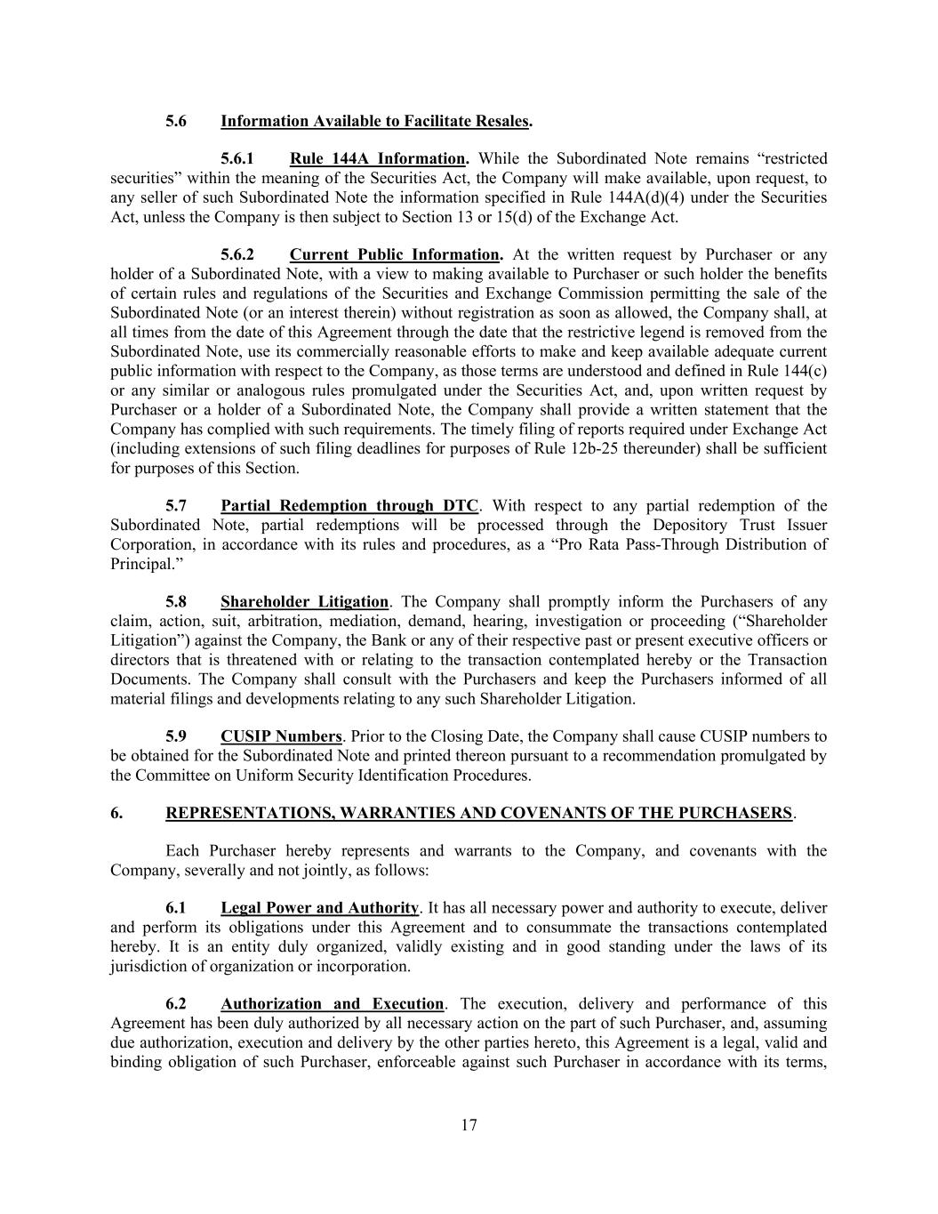 17 5.6 Information Available to Facilitate Resales. 5.6.1 Rule 144A Information. While the Subordinated Note remains “restricted securities” within the meaning of the Securities Act, the Company will make available, upon request, to any seller of such Subordinated Note the information specified in Rule 144A(d)(4) under the Securities Act, unless the Company is then subject to Section 13 or 15(d) of the Exchange Act. 5.6.2 Current Public Information. At the written request by Purchaser or any holder of a Subordinated Note, with a view to making available to Purchaser or such holder the benefits of certain rules and regulations of the Securities and Exchange Commission permitting the sale of the Subordinated Note (or an interest therein) without registration as soon as allowed, the Company shall, at all times from the date of this Agreement through the date that the restrictive legend is removed from the Subordinated Note, use its commercially reasonable efforts to make and keep available adequate current public information with respect to the Company, as those terms are understood and defined in Rule 144(c) or any similar or analogous rules promulgated under the Securities Act, and, upon written request by Purchaser or a holder of a Subordinated Note, the Company shall provide a written statement that the Company has complied with such requirements. The timely filing of reports required under Exchange Act (including extensions of such filing deadlines for purposes of Rule 12b-25 thereunder) shall be sufficient for purposes of this Section. 5.7 Partial Redemption through DTC. With respect to any partial redemption of the Subordinated Note, partial redemptions will be processed through the Depository Trust Issuer Corporation, in accordance with its rules and procedures, as a “Pro Rata Pass-Through Distribution of Principal.” 5.8 Shareholder Litigation. The Company shall promptly inform the Purchasers of any claim, action, suit, arbitration, mediation, demand, hearing, investigation or proceeding (“Shareholder Litigation”) against the Company, the Bank or any of their respective past or present executive officers or directors that is threatened with or relating to the transaction contemplated hereby or the Transaction Documents. The Company shall consult with the Purchasers and keep the Purchasers informed of all material filings and developments relating to any such Shareholder Litigation. 5.9 CUSIP Numbers. Prior to the Closing Date, the Company shall cause CUSIP numbers to be obtained for the Subordinated Note and printed thereon pursuant to a recommendation promulgated by the Committee on Uniform Security Identification Procedures. 6. REPRESENTATIONS, WARRANTIES AND COVENANTS OF THE PURCHASERS. Each Purchaser hereby represents and warrants to the Company, and covenants with the Company, severally and not jointly, as follows: 6.1 Legal Power and Authority. It has all necessary power and authority to execute, deliver and perform its obligations under this Agreement and to consummate the transactions contemplated hereby. It is an entity duly organized, validly existing and in good standing under the laws of its jurisdiction of organization or incorporation. 6.2 Authorization and Execution. The execution, delivery and performance of this Agreement has been duly authorized by all necessary action on the part of such Purchaser, and, assuming due authorization, execution and delivery by the other parties hereto, this Agreement is a legal, valid and binding obligation of such Purchaser, enforceable against such Purchaser in accordance with its terms,