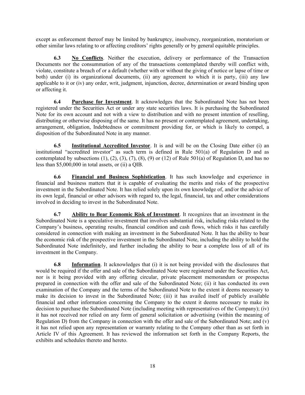 18 except as enforcement thereof may be limited by bankruptcy, insolvency, reorganization, moratorium or other similar laws relating to or affecting creditors’ rights generally or by general equitable principles. 6.3 No Conflicts. Neither the execution, delivery or performance of the Transaction Documents nor the consummation of any of the transactions contemplated thereby will conflict with, violate, constitute a breach of or a default (whether with or without the giving of notice or lapse of time or both) under (i) its organizational documents, (ii) any agreement to which it is party, (iii) any law applicable to it or (iv) any order, writ, judgment, injunction, decree, determination or award binding upon or affecting it. 6.4 Purchase for Investment. It acknowledges that the Subordinated Note has not been registered under the Securities Act or under any state securities laws. It is purchasing the Subordinated Note for its own account and not with a view to distribution and with no present intention of reselling, distributing or otherwise disposing of the same. It has no present or contemplated agreement, undertaking, arrangement, obligation, Indebtedness or commitment providing for, or which is likely to compel, a disposition of the Subordinated Note in any manner. 6.5 Institutional Accredited Investor. It is and will be on the Closing Date either (i) an institutional “accredited investor” as such term is defined in Rule 501(a) of Regulation D and as contemplated by subsections (1), (2), (3), (7), (8), (9) or (12) of Rule 501(a) of Regulation D, and has no less than $5,000,000 in total assets, or (ii) a QIB. 6.6 Financial and Business Sophistication. It has such knowledge and experience in financial and business matters that it is capable of evaluating the merits and risks of the prospective investment in the Subordinated Note. It has relied solely upon its own knowledge of, and/or the advice of its own legal, financial or other advisors with regard to, the legal, financial, tax and other considerations involved in deciding to invest in the Subordinated Note. 6.7 Ability to Bear Economic Risk of Investment. It recognizes that an investment in the Subordinated Note is a speculative investment that involves substantial risk, including risks related to the Company’s business, operating results, financial condition and cash flows, which risks it has carefully considered in connection with making an investment in the Subordinated Note. It has the ability to bear the economic risk of the prospective investment in the Subordinated Note, including the ability to hold the Subordinated Note indefinitely, and further including the ability to bear a complete loss of all of its investment in the Company. 6.8 Information. It acknowledges that (i) it is not being provided with the disclosures that would be required if the offer and sale of the Subordinated Note were registered under the Securities Act, nor is it being provided with any offering circular, private placement memorandum or prospectus prepared in connection with the offer and sale of the Subordinated Note; (ii) it has conducted its own examination of the Company and the terms of the Subordinated Note to the extent it deems necessary to make its decision to invest in the Subordinated Note; (iii) it has availed itself of publicly available financial and other information concerning the Company to the extent it deems necessary to make its decision to purchase the Subordinated Note (including meeting with representatives of the Company); (iv) it has not received nor relied on any form of general solicitation or advertising (within the meaning of Regulation D) from the Company in connection with the offer and sale of the Subordinated Note; and (v) it has not relied upon any representation or warranty relating to the Company other than as set forth in Article IV of this Agreement. It has reviewed the information set forth in the Company Reports, the exhibits and schedules thereto and hereto.