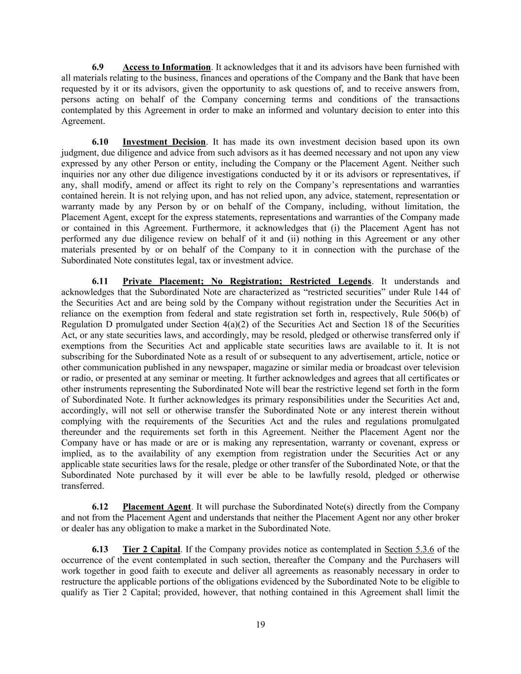 19 6.9 Access to Information. It acknowledges that it and its advisors have been furnished with all materials relating to the business, finances and operations of the Company and the Bank that have been requested by it or its advisors, given the opportunity to ask questions of, and to receive answers from, persons acting on behalf of the Company concerning terms and conditions of the transactions contemplated by this Agreement in order to make an informed and voluntary decision to enter into this Agreement. 6.10 Investment Decision. It has made its own investment decision based upon its own judgment, due diligence and advice from such advisors as it has deemed necessary and not upon any view expressed by any other Person or entity, including the Company or the Placement Agent. Neither such inquiries nor any other due diligence investigations conducted by it or its advisors or representatives, if any, shall modify, amend or affect its right to rely on the Company’s representations and warranties contained herein. It is not relying upon, and has not relied upon, any advice, statement, representation or warranty made by any Person by or on behalf of the Company, including, without limitation, the Placement Agent, except for the express statements, representations and warranties of the Company made or contained in this Agreement. Furthermore, it acknowledges that (i) the Placement Agent has not performed any due diligence review on behalf of it and (ii) nothing in this Agreement or any other materials presented by or on behalf of the Company to it in connection with the purchase of the Subordinated Note constitutes legal, tax or investment advice. 6.11 Private Placement; No Registration; Restricted Legends. It understands and acknowledges that the Subordinated Note are characterized as “restricted securities” under Rule 144 of the Securities Act and are being sold by the Company without registration under the Securities Act in reliance on the exemption from federal and state registration set forth in, respectively, Rule 506(b) of Regulation D promulgated under Section 4(a)(2) of the Securities Act and Section 18 of the Securities Act, or any state securities laws, and accordingly, may be resold, pledged or otherwise transferred only if exemptions from the Securities Act and applicable state securities laws are available to it. It is not subscribing for the Subordinated Note as a result of or subsequent to any advertisement, article, notice or other communication published in any newspaper, magazine or similar media or broadcast over television or radio, or presented at any seminar or meeting. It further acknowledges and agrees that all certificates or other instruments representing the Subordinated Note will bear the restrictive legend set forth in the form of Subordinated Note. It further acknowledges its primary responsibilities under the Securities Act and, accordingly, will not sell or otherwise transfer the Subordinated Note or any interest therein without complying with the requirements of the Securities Act and the rules and regulations promulgated thereunder and the requirements set forth in this Agreement. Neither the Placement Agent nor the Company have or has made or are or is making any representation, warranty or covenant, express or implied, as to the availability of any exemption from registration under the Securities Act or any applicable state securities laws for the resale, pledge or other transfer of the Subordinated Note, or that the Subordinated Note purchased by it will ever be able to be lawfully resold, pledged or otherwise transferred. 6.12 Placement Agent. It will purchase the Subordinated Note(s) directly from the Company and not from the Placement Agent and understands that neither the Placement Agent nor any other broker or dealer has any obligation to make a market in the Subordinated Note. 6.13 Tier 2 Capital. If the Company provides notice as contemplated in Section 5.3.6 of the occurrence of the event contemplated in such section, thereafter the Company and the Purchasers will work together in good faith to execute and deliver all agreements as reasonably necessary in order to restructure the applicable portions of the obligations evidenced by the Subordinated Note to be eligible to qualify as Tier 2 Capital; provided, however, that nothing contained in this Agreement shall limit the