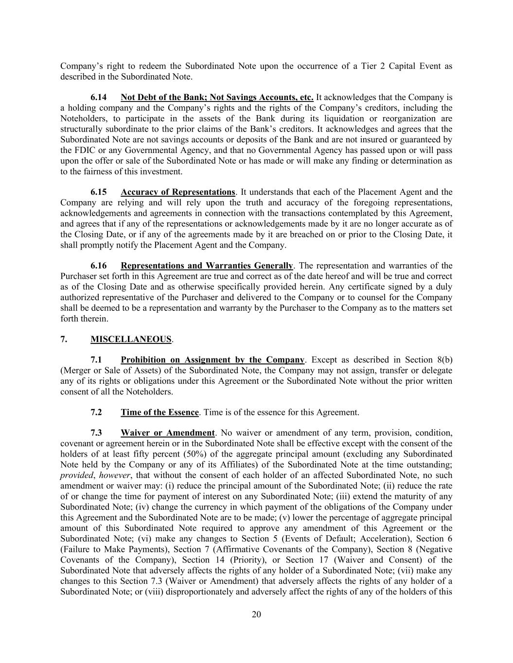 20 Company’s right to redeem the Subordinated Note upon the occurrence of a Tier 2 Capital Event as described in the Subordinated Note. 6.14 Not Debt of the Bank; Not Savings Accounts, etc. It acknowledges that the Company is a holding company and the Company’s rights and the rights of the Company’s creditors, including the Noteholders, to participate in the assets of the Bank during its liquidation or reorganization are structurally subordinate to the prior claims of the Bank’s creditors. It acknowledges and agrees that the Subordinated Note are not savings accounts or deposits of the Bank and are not insured or guaranteed by the FDIC or any Governmental Agency, and that no Governmental Agency has passed upon or will pass upon the offer or sale of the Subordinated Note or has made or will make any finding or determination as to the fairness of this investment. 6.15 Accuracy of Representations. It understands that each of the Placement Agent and the Company are relying and will rely upon the truth and accuracy of the foregoing representations, acknowledgements and agreements in connection with the transactions contemplated by this Agreement, and agrees that if any of the representations or acknowledgements made by it are no longer accurate as of the Closing Date, or if any of the agreements made by it are breached on or prior to the Closing Date, it shall promptly notify the Placement Agent and the Company. 6.16 Representations and Warranties Generally. The representation and warranties of the Purchaser set forth in this Agreement are true and correct as of the date hereof and will be true and correct as of the Closing Date and as otherwise specifically provided herein. Any certificate signed by a duly authorized representative of the Purchaser and delivered to the Company or to counsel for the Company shall be deemed to be a representation and warranty by the Purchaser to the Company as to the matters set forth therein. 7. MISCELLANEOUS. 7.1 Prohibition on Assignment by the Company. Except as described in Section 8(b) (Merger or Sale of Assets) of the Subordinated Note, the Company may not assign, transfer or delegate any of its rights or obligations under this Agreement or the Subordinated Note without the prior written consent of all the Noteholders. 7.2 Time of the Essence. Time is of the essence for this Agreement. 7.3 Waiver or Amendment. No waiver or amendment of any term, provision, condition, covenant or agreement herein or in the Subordinated Note shall be effective except with the consent of the holders of at least fifty percent (50%) of the aggregate principal amount (excluding any Subordinated Note held by the Company or any of its Affiliates) of the Subordinated Note at the time outstanding; provided, however, that without the consent of each holder of an affected Subordinated Note, no such amendment or waiver may: (i) reduce the principal amount of the Subordinated Note; (ii) reduce the rate of or change the time for payment of interest on any Subordinated Note; (iii) extend the maturity of any Subordinated Note; (iv) change the currency in which payment of the obligations of the Company under this Agreement and the Subordinated Note are to be made; (v) lower the percentage of aggregate principal amount of this Subordinated Note required to approve any amendment of this Agreement or the Subordinated Note; (vi) make any changes to Section 5 (Events of Default; Acceleration), Section 6 (Failure to Make Payments), Section 7 (Affirmative Covenants of the Company), Section 8 (Negative Covenants of the Company), Section 14 (Priority), or Section 17 (Waiver and Consent) of the Subordinated Note that adversely affects the rights of any holder of a Subordinated Note; (vii) make any changes to this Section 7.3 (Waiver or Amendment) that adversely affects the rights of any holder of a Subordinated Note; or (viii) disproportionately and adversely affect the rights of any of the holders of this