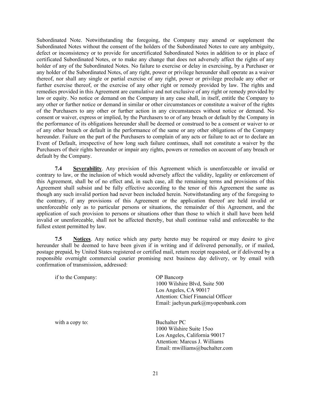 21 Subordinated Note. Notwithstanding the foregoing, the Company may amend or supplement the Subordinated Notes without the consent of the holders of the Subordinated Notes to cure any ambiguity, defect or inconsistency or to provide for uncertificated Subordinated Notes in addition to or in place of certificated Subordinated Notes, or to make any change that does not adversely affect the rights of any holder of any of the Subordinated Notes. No failure to exercise or delay in exercising, by a Purchaser or any holder of the Subordinated Notes, of any right, power or privilege hereunder shall operate as a waiver thereof, nor shall any single or partial exercise of any right, power or privilege preclude any other or further exercise thereof, or the exercise of any other right or remedy provided by law. The rights and remedies provided in this Agreement are cumulative and not exclusive of any right or remedy provided by law or equity. No notice or demand on the Company in any case shall, in itself, entitle the Company to any other or further notice or demand in similar or other circumstances or constitute a waiver of the rights of the Purchasers to any other or further action in any circumstances without notice or demand. No consent or waiver, express or implied, by the Purchasers to or of any breach or default by the Company in the performance of its obligations hereunder shall be deemed or construed to be a consent or waiver to or of any other breach or default in the performance of the same or any other obligations of the Company hereunder. Failure on the part of the Purchasers to complain of any acts or failure to act or to declare an Event of Default, irrespective of how long such failure continues, shall not constitute a waiver by the Purchasers of their rights hereunder or impair any rights, powers or remedies on account of any breach or default by the Company. 7.4 Severability. Any provision of this Agreement which is unenforceable or invalid or contrary to law, or the inclusion of which would adversely affect the validity, legality or enforcement of this Agreement, shall be of no effect and, in such case, all the remaining terms and provisions of this Agreement shall subsist and be fully effective according to the tenor of this Agreement the same as though any such invalid portion had never been included herein. Notwithstanding any of the foregoing to the contrary, if any provisions of this Agreement or the application thereof are held invalid or unenforceable only as to particular persons or situations, the remainder of this Agreement, and the application of such provision to persons or situations other than those to which it shall have been held invalid or unenforceable, shall not be affected thereby, but shall continue valid and enforceable to the fullest extent permitted by law. 7.5 Notices. Any notice which any party hereto may be required or may desire to give hereunder shall be deemed to have been given if in writing and if delivered personally, or if mailed, postage prepaid, by United States registered or certified mail, return receipt requested, or if delivered by a responsible overnight commercial courier promising next business day delivery, or by email with confirmation of transmission, addressed: if to the Company: OP Bancorp 1000 Wilshire Blvd, Suite 500 Los Angeles, CA 90017 Attention: Chief Financial Officer Email: jaehyun.park@myopenbank.com with a copy to: Buchalter PC 1000 Wilshire Suite 15oo Los Angeles, California 90017 Attention: Marcus J. Williams Email: mwilliams@buchalter.com