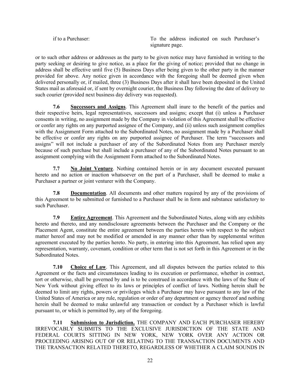 22 if to a Purchaser: To the address indicated on such Purchaser’s signature page. or to such other address or addresses as the party to be given notice may have furnished in writing to the party seeking or desiring to give notice, as a place for the giving of notice; provided that no change in address shall be effective until five (5) Business Days after being given to the other party in the manner provided for above. Any notice given in accordance with the foregoing shall be deemed given when delivered personally or, if mailed, three (3) Business Days after it shall have been deposited in the United States mail as aforesaid or, if sent by overnight courier, the Business Day following the date of delivery to such courier (provided next business day delivery was requested). 7.6 Successors and Assigns. This Agreement shall inure to the benefit of the parties and their respective heirs, legal representatives, successors and assigns; except that (i) unless a Purchaser consents in writing, no assignment made by the Company in violation of this Agreement shall be effective or confer any rights on any purported assignee of the Company, and (ii) unless such assignment complies with the Assignment Form attached to the Subordinated Notes, no assignment made by a Purchaser shall be effective or confer any rights on any purported assignee of Purchaser. The term “successors and assigns” will not include a purchaser of any of the Subordinated Notes from any Purchaser merely because of such purchase but shall include a purchaser of any of the Subordinated Notes pursuant to an assignment complying with the Assignment Form attached to the Subordinated Notes. 7.7 No Joint Venture. Nothing contained herein or in any document executed pursuant hereto and no action or inaction whatsoever on the part of a Purchaser, shall be deemed to make a Purchaser a partner or joint venturer with the Company. 7.8 Documentation. All documents and other matters required by any of the provisions of this Agreement to be submitted or furnished to a Purchaser shall be in form and substance satisfactory to such Purchaser. 7.9 Entire Agreement. This Agreement and the Subordinated Notes, along with any exhibits hereto and thereto, and any nondisclosure agreements between the Purchaser and the Company or the Placement Agent, constitute the entire agreement between the parties hereto with respect to the subject matter hereof and may not be modified or amended in any manner other than by supplemental written agreement executed by the parties hereto. No party, in entering into this Agreement, has relied upon any representation, warranty, covenant, condition or other term that is not set forth in this Agreement or in the Subordinated Notes. 7.10 Choice of Law. This Agreement, and all disputes between the parties related to this Agreement or the facts and circumstances leading to its execution or performance, whether in contract, tort or otherwise, shall be governed by and is to be construed in accordance with the laws of the State of New York without giving effect to its laws or principles of conflict of laws. Nothing herein shall be deemed to limit any rights, powers or privileges which a Purchaser may have pursuant to any law of the United States of America or any rule, regulation or order of any department or agency thereof and nothing herein shall be deemed to make unlawful any transaction or conduct by a Purchaser which is lawful pursuant to, or which is permitted by, any of the foregoing. 7.11 Submission to Jurisdiction. THE COMPANY AND EACH PURCHASER HEREBY IRREVOCABLY SUBMITS TO THE EXCLUSIVE JURISDICTION OF THE STATE AND FEDERAL COURTS SITTING IN NEW YORK, NEW YORK OVER ANY ACTION OR PROCEEDING ARISING OUT OF OR RELATING TO THE TRANSACTION DOCUMENTS AND THE TRANSACTION RELATED THERETO, REGARDLESS OF WHETHER A CLAIM SOUNDS IN