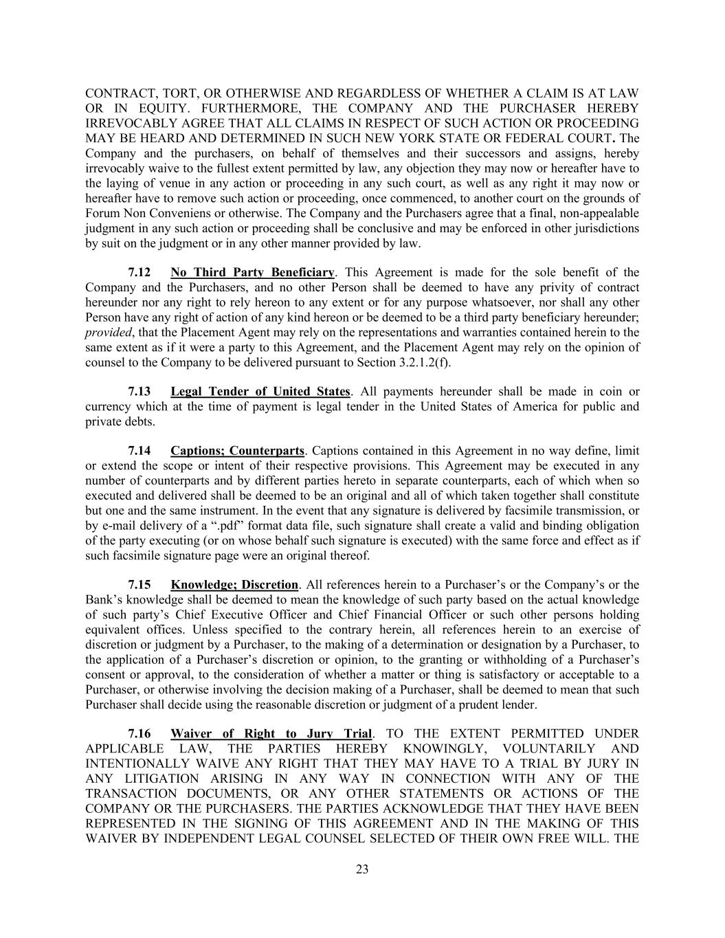 23 CONTRACT, TORT, OR OTHERWISE AND REGARDLESS OF WHETHER A CLAIM IS AT LAW OR IN EQUITY. FURTHERMORE, THE COMPANY AND THE PURCHASER HEREBY IRREVOCABLY AGREE THAT ALL CLAIMS IN RESPECT OF SUCH ACTION OR PROCEEDING MAY BE HEARD AND DETERMINED IN SUCH NEW YORK STATE OR FEDERAL COURT. The Company and the purchasers, on behalf of themselves and their successors and assigns, hereby irrevocably waive to the fullest extent permitted by law, any objection they may now or hereafter have to the laying of venue in any action or proceeding in any such court, as well as any right it may now or hereafter have to remove such action or proceeding, once commenced, to another court on the grounds of Forum Non Conveniens or otherwise. The Company and the Purchasers agree that a final, non-appealable judgment in any such action or proceeding shall be conclusive and may be enforced in other jurisdictions by suit on the judgment or in any other manner provided by law. 7.12 No Third Party Beneficiary. This Agreement is made for the sole benefit of the Company and the Purchasers, and no other Person shall be deemed to have any privity of contract hereunder nor any right to rely hereon to any extent or for any purpose whatsoever, nor shall any other Person have any right of action of any kind hereon or be deemed to be a third party beneficiary hereunder; provided, that the Placement Agent may rely on the representations and warranties contained herein to the same extent as if it were a party to this Agreement, and the Placement Agent may rely on the opinion of counsel to the Company to be delivered pursuant to Section 3.2.1.2(f). 7.13 Legal Tender of United States. All payments hereunder shall be made in coin or currency which at the time of payment is legal tender in the United States of America for public and private debts. 7.14 Captions; Counterparts. Captions contained in this Agreement in no way define, limit or extend the scope or intent of their respective provisions. This Agreement may be executed in any number of counterparts and by different parties hereto in separate counterparts, each of which when so executed and delivered shall be deemed to be an original and all of which taken together shall constitute but one and the same instrument. In the event that any signature is delivered by facsimile transmission, or by e-mail delivery of a “.pdf” format data file, such signature shall create a valid and binding obligation of the party executing (or on whose behalf such signature is executed) with the same force and effect as if such facsimile signature page were an original thereof. 7.15 Knowledge; Discretion. All references herein to a Purchaser’s or the Company’s or the Bank’s knowledge shall be deemed to mean the knowledge of such party based on the actual knowledge of such party’s Chief Executive Officer and Chief Financial Officer or such other persons holding equivalent offices. Unless specified to the contrary herein, all references herein to an exercise of discretion or judgment by a Purchaser, to the making of a determination or designation by a Purchaser, to the application of a Purchaser’s discretion or opinion, to the granting or withholding of a Purchaser’s consent or approval, to the consideration of whether a matter or thing is satisfactory or acceptable to a Purchaser, or otherwise involving the decision making of a Purchaser, shall be deemed to mean that such Purchaser shall decide using the reasonable discretion or judgment of a prudent lender. 7.16 Waiver of Right to Jury Trial. TO THE EXTENT PERMITTED UNDER APPLICABLE LAW, THE PARTIES HEREBY KNOWINGLY, VOLUNTARILY AND INTENTIONALLY WAIVE ANY RIGHT THAT THEY MAY HAVE TO A TRIAL BY JURY IN ANY LITIGATION ARISING IN ANY WAY IN CONNECTION WITH ANY OF THE TRANSACTION DOCUMENTS, OR ANY OTHER STATEMENTS OR ACTIONS OF THE COMPANY OR THE PURCHASERS. THE PARTIES ACKNOWLEDGE THAT THEY HAVE BEEN REPRESENTED IN THE SIGNING OF THIS AGREEMENT AND IN THE MAKING OF THIS WAIVER BY INDEPENDENT LEGAL COUNSEL SELECTED OF THEIR OWN FREE WILL. THE
