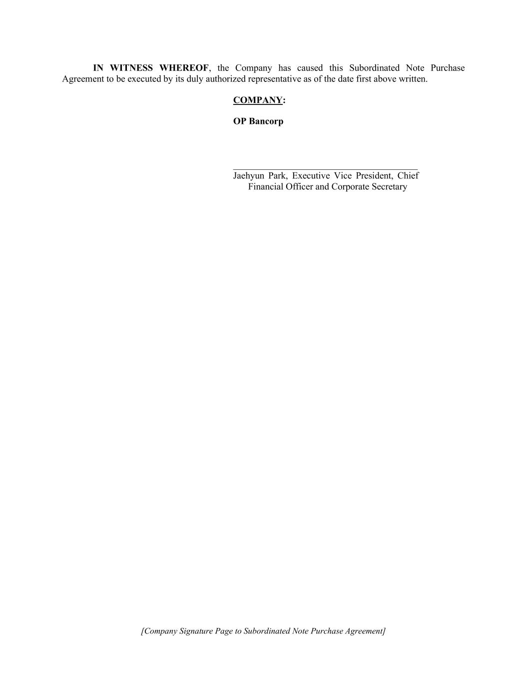 [Company Signature Page to Subordinated Note Purchase Agreement] IN WITNESS WHEREOF, the Company has caused this Subordinated Note Purchase Agreement to be executed by its duly authorized representative as of the date first above written. COMPANY: OP Bancorp _______________________________________ Jaehyun Park, Executive Vice President, Chief Financial Officer and Corporate Secretary