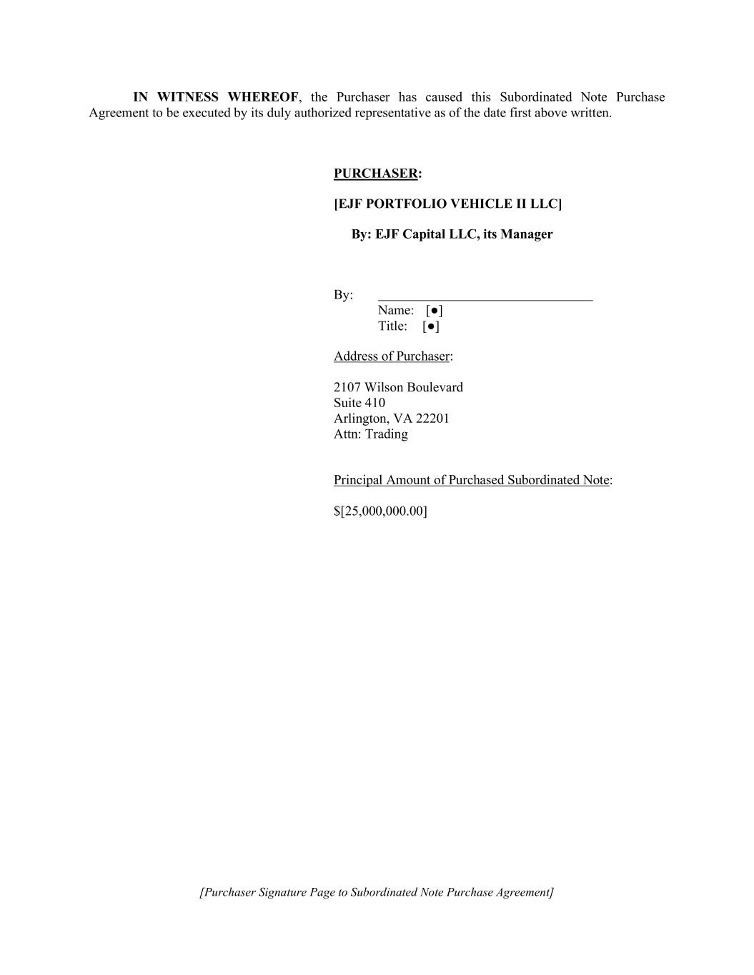 [Purchaser Signature Page to Subordinated Note Purchase Agreement] IN WITNESS WHEREOF, the Purchaser has caused this Subordinated Note Purchase Agreement to be executed by its duly authorized representative as of the date first above written. PURCHASER: [EJF PORTFOLIO VEHICLE II LLC] By: EJF Capital LLC, its Manager By: Name: [●] Title: [●] Address of Purchaser: 2107 Wilson Boulevard Suite 410 Arlington, VA 22201 Attn: Trading Principal Amount of Purchased Subordinated Note: $[25,000,000.00]