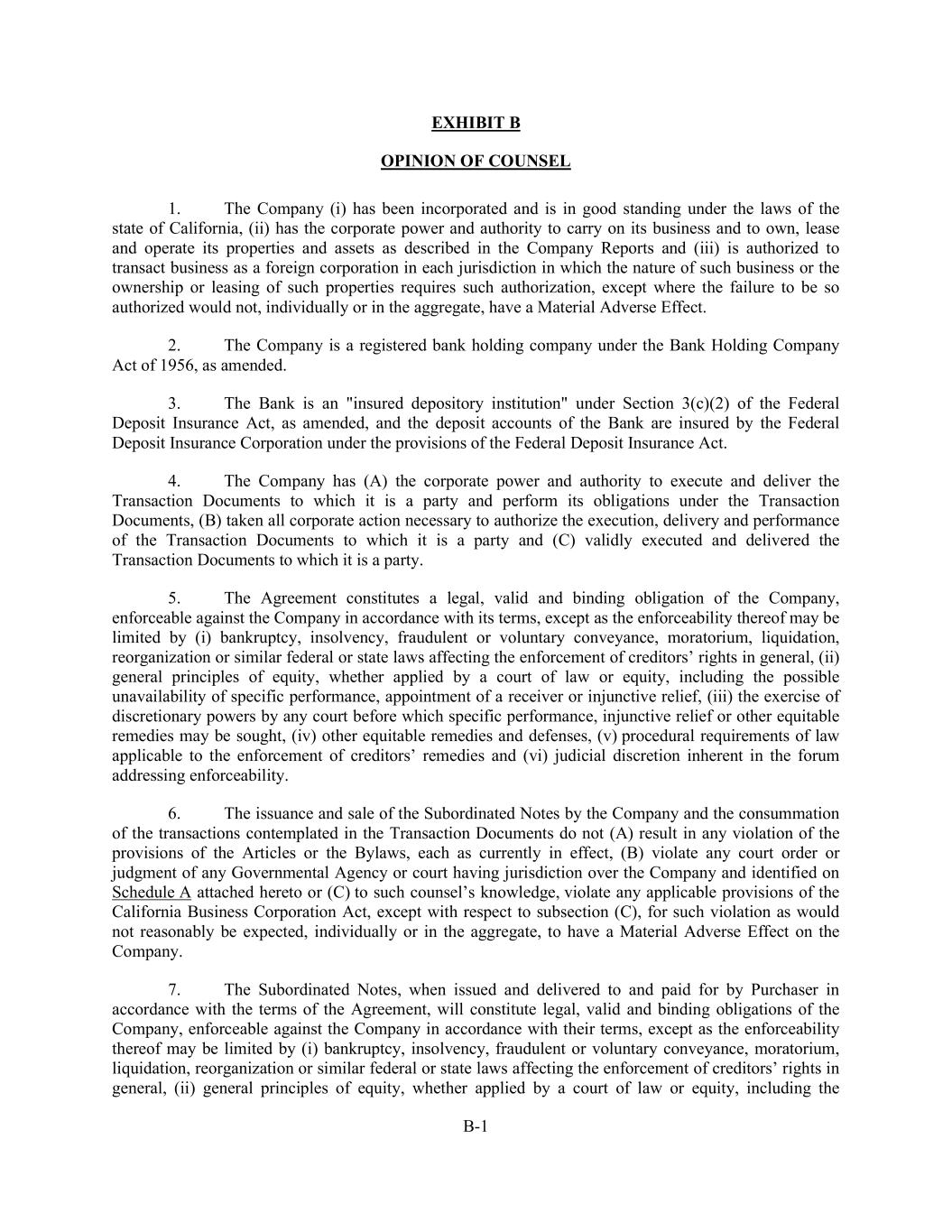 B-1 EXHIBIT B OPINION OF COUNSEL 1. The Company (i) has been incorporated and is in good standing under the laws of the state of California, (ii) has the corporate power and authority to carry on its business and to own, lease and operate its properties and assets as described in the Company Reports and (iii) is authorized to transact business as a foreign corporation in each jurisdiction in which the nature of such business or the ownership or leasing of such properties requires such authorization, except where the failure to be so authorized would not, individually or in the aggregate, have a Material Adverse Effect. 2. The Company is a registered bank holding company under the Bank Holding Company Act of 1956, as amended. 3. The Bank is an "insured depository institution" under Section 3(c)(2) of the Federal Deposit Insurance Act, as amended, and the deposit accounts of the Bank are insured by the Federal Deposit Insurance Corporation under the provisions of the Federal Deposit Insurance Act. 4. The Company has (A) the corporate power and authority to execute and deliver the Transaction Documents to which it is a party and perform its obligations under the Transaction Documents, (B) taken all corporate action necessary to authorize the execution, delivery and performance of the Transaction Documents to which it is a party and (C) validly executed and delivered the Transaction Documents to which it is a party. 5. The Agreement constitutes a legal, valid and binding obligation of the Company, enforceable against the Company in accordance with its terms, except as the enforceability thereof may be limited by (i) bankruptcy, insolvency, fraudulent or voluntary conveyance, moratorium, liquidation, reorganization or similar federal or state laws affecting the enforcement of creditors’ rights in general, (ii) general principles of equity, whether applied by a court of law or equity, including the possible unavailability of specific performance, appointment of a receiver or injunctive relief, (iii) the exercise of discretionary powers by any court before which specific performance, injunctive relief or other equitable remedies may be sought, (iv) other equitable remedies and defenses, (v) procedural requirements of law applicable to the enforcement of creditors’ remedies and (vi) judicial discretion inherent in the forum addressing enforceability. 6. The issuance and sale of the Subordinated Notes by the Company and the consummation of the transactions contemplated in the Transaction Documents do not (A) result in any violation of the provisions of the Articles or the Bylaws, each as currently in effect, (B) violate any court order or judgment of any Governmental Agency or court having jurisdiction over the Company and identified on Schedule A attached hereto or (C) to such counsel’s knowledge, violate any applicable provisions of the California Business Corporation Act, except with respect to subsection (C), for such violation as would not reasonably be expected, individually or in the aggregate, to have a Material Adverse Effect on the Company. 7. The Subordinated Notes, when issued and delivered to and paid for by Purchaser in accordance with the terms of the Agreement, will constitute legal, valid and binding obligations of the Company, enforceable against the Company in accordance with their terms, except as the enforceability thereof may be limited by (i) bankruptcy, insolvency, fraudulent or voluntary conveyance, moratorium, liquidation, reorganization or similar federal or state laws affecting the enforcement of creditors’ rights in general, (ii) general principles of equity, whether applied by a court of law or equity, including the