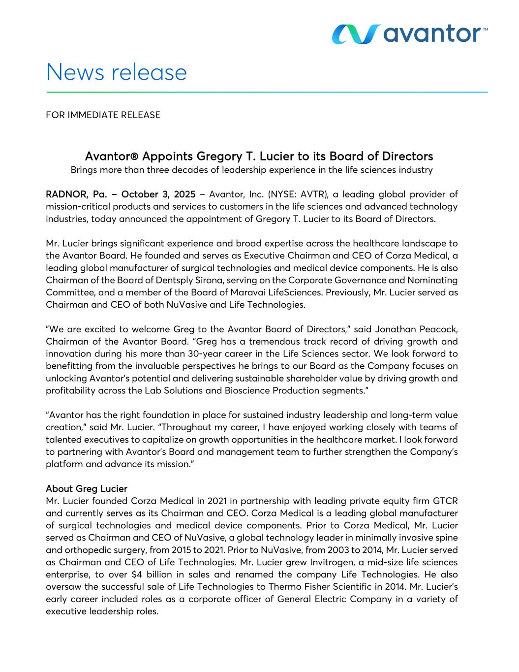 News release FOR IMMEDIATE RELEASE Avantor® Appoints Gregory T. Lucier to its Board of Directors Brings more than three decades of leadership experience in the life sciences industry RADNOR, Pa. – October 3, 2025 – Avantor, Inc. (NYSE: AVTR), a leading global provider of mission-critical products and services to customers in the life sciences and advanced technology industries, today announced the appointment of Gregory T. Lucier to its Board of Directors. Mr. Lucier brings significant experience and broad expertise across the healthcare landscape to the Avantor Board. He founded and serves as Executive Chairman and CEO of Corza Medical, a leading global manufacturer of surgical technologies and medical device components. He is also Chairman of the Board of Dentsply Sirona, serving on the Corporate Governance and Nominating Committee, and a member of the Board of Maravai LifeSciences. Previously, Mr. Lucier served as Chairman and CEO of both NuVasive and Life Technologies. "We are excited to welcome Greg to the Avantor Board of Directors," said Jonathan Peacock, Chairman of the Avantor Board. “Greg has a tremendous track record of driving growth and innovation during his more than 30-year career in the Life Sciences sector. We look forward to benefitting from the invaluable perspectives he brings to our Board as the Company focuses on unlocking Avantor’s potential and delivering sustainable shareholder value by driving growth and profitability across the Lab Solutions and Bioscience Production segments." “Avantor has the right foundation in place for sustained industry leadership and long-term value creation,” said Mr. Lucier. “Throughout my career, I have enjoyed working closely with teams of talented executives to capitalize on growth opportunities in the healthcare market. I look forward to partnering with Avantor’s Board and management team to further strengthen the Company’s platform and advance its mission.” About Greg Lucier Mr. Lucier founded Corza Medical in 2021 in partnership with leading private equity firm GTCR and currently serves as its Chairman and CEO. Corza Medical is a leading global manufacturer of surgical technologies and medical device components. Prior to Corza Medical, Mr. Lucier served as Chairman and CEO of NuVasive, a global technology leader in minimally invasive spine and orthopedic surgery, from 2015 to 2021. Prior to NuVasive, from 2003 to 2014, Mr. Lucier served as Chairman and CEO of Life Technologies. Mr. Lucier grew Invitrogen, a mid-size life sciences enterprise, to over $4 billion in sales and renamed the company Life Technologies. He also oversaw the successful sale of Life Technologies to Thermo Fisher Scientific in 2014. Mr. Lucier’s early career included roles as a corporate officer of General Electric Company in a variety of executive leadership roles.